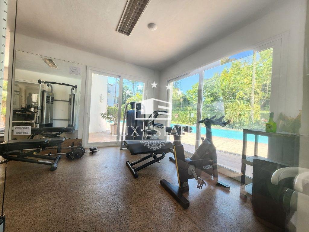 It is situated on the second floor and includes an elevator for easy access. The community offers a range of common facilities including a gym, sauna, swimming pool, tropical garden, 24-hour reception, bar, paddle tennis court, mini golf course, restaurant, and garage.