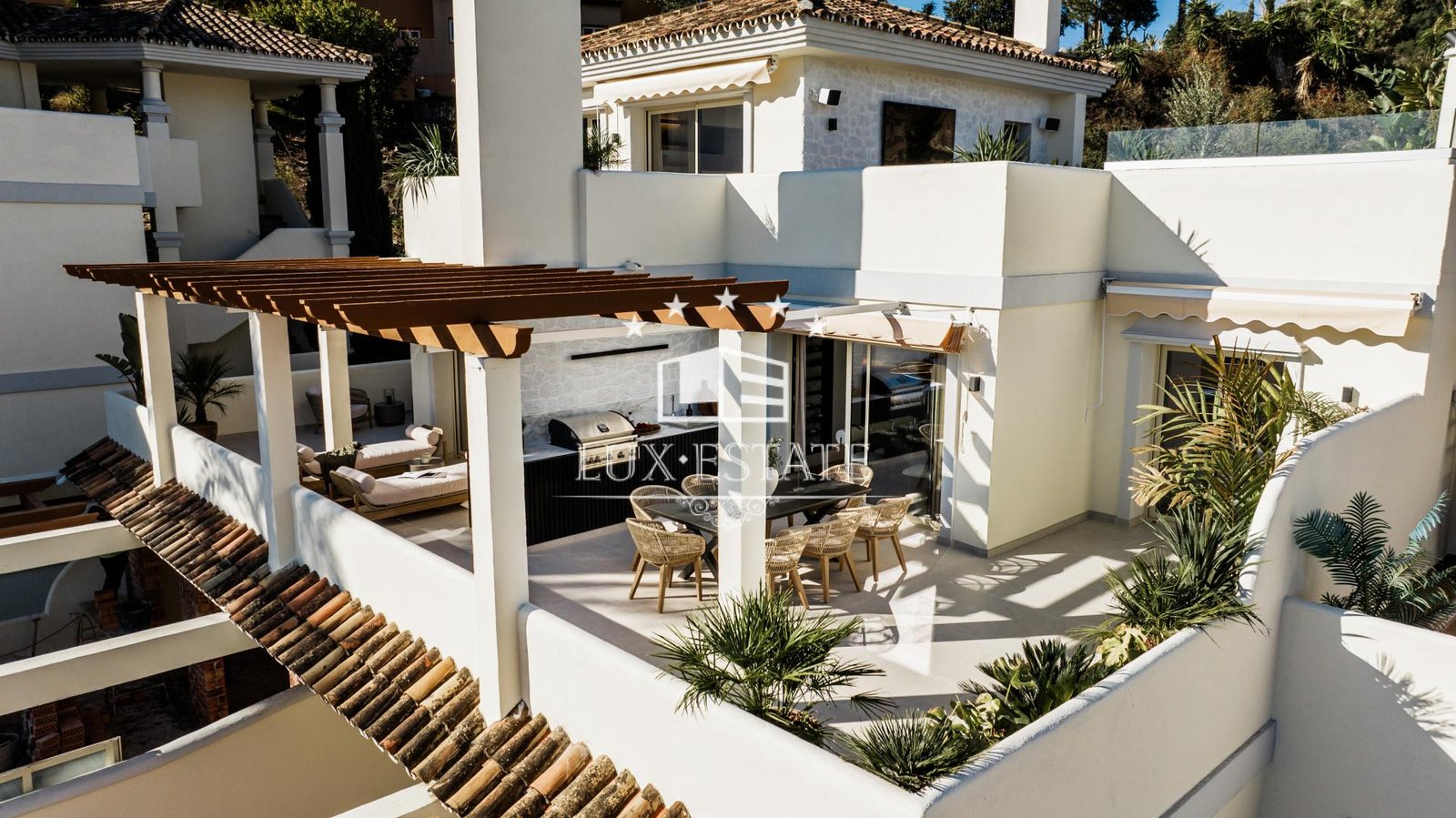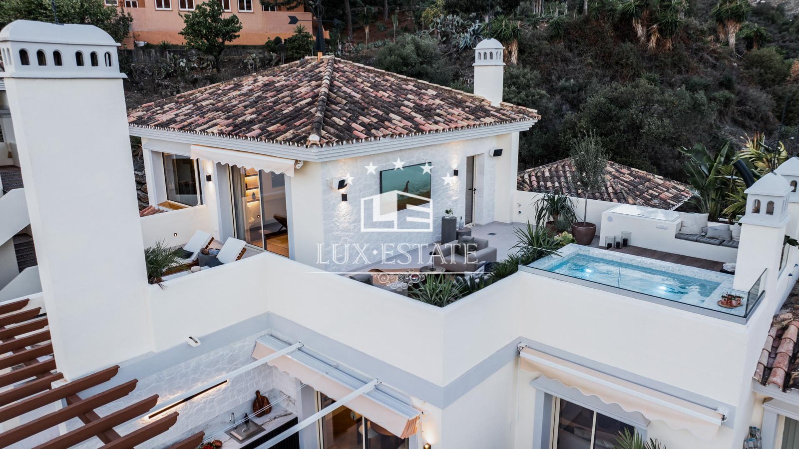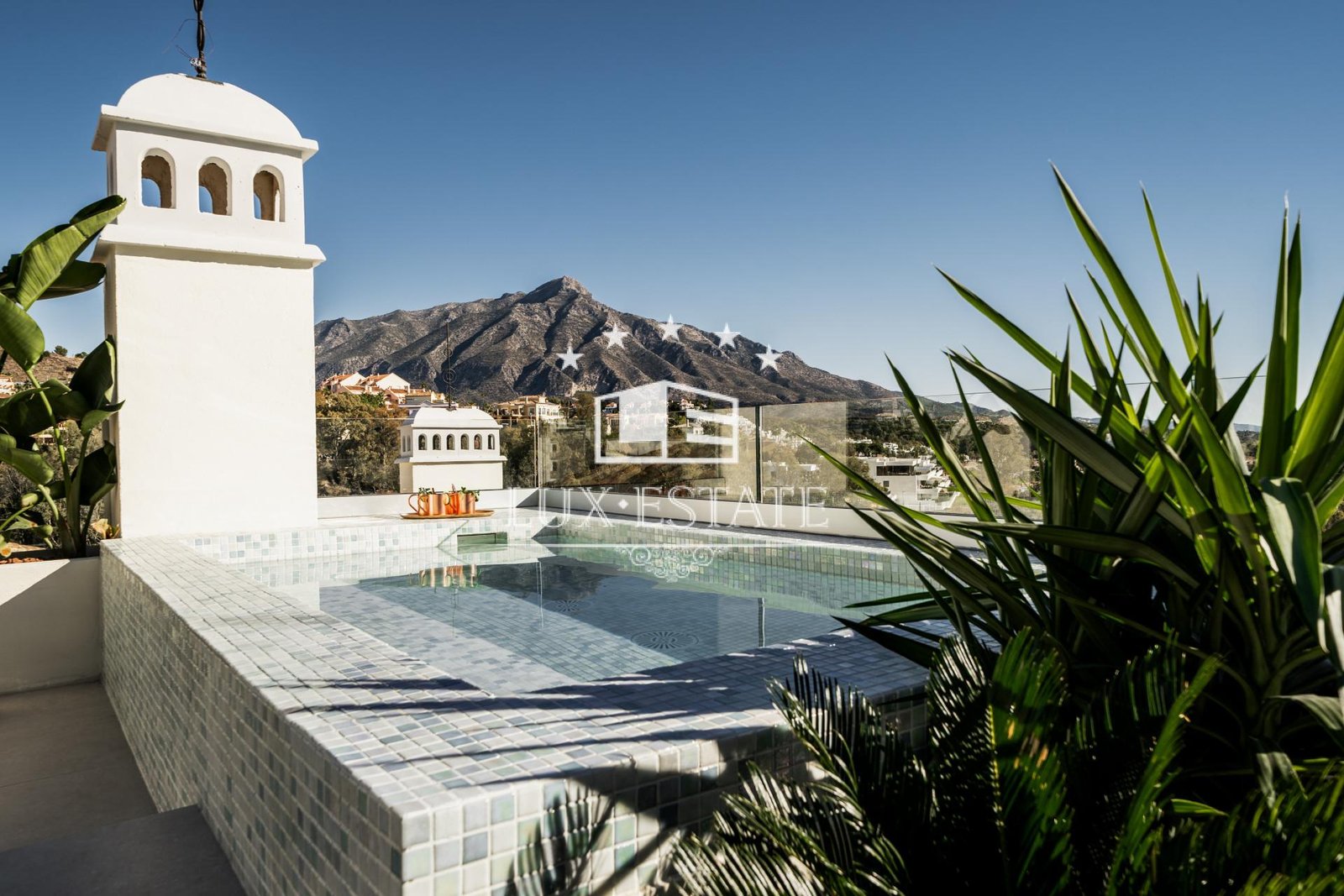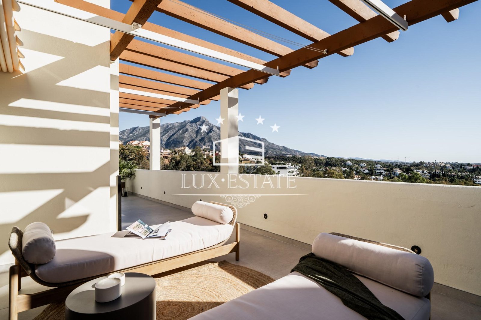 This three-bedroom haven doesn’t stop there. Venture from the open-plan living area to your private terrace, offering stunning sea and mountain views. And guess what? There’s more! Dive into the heated jacuzzi with views on the captivating La Concha Mountain, catch a movie in the outdoor cinema, sizzle up a barbecue, or just lounge in style. It’s your own relaxation and entertainment paradise.