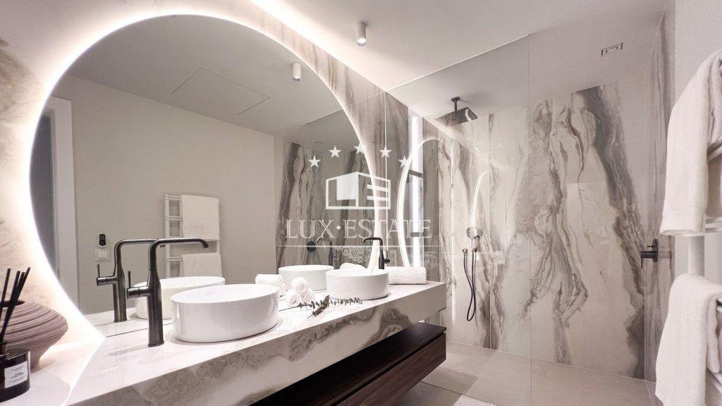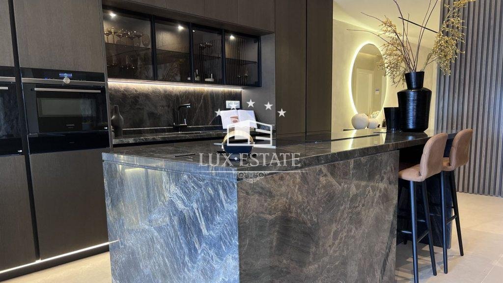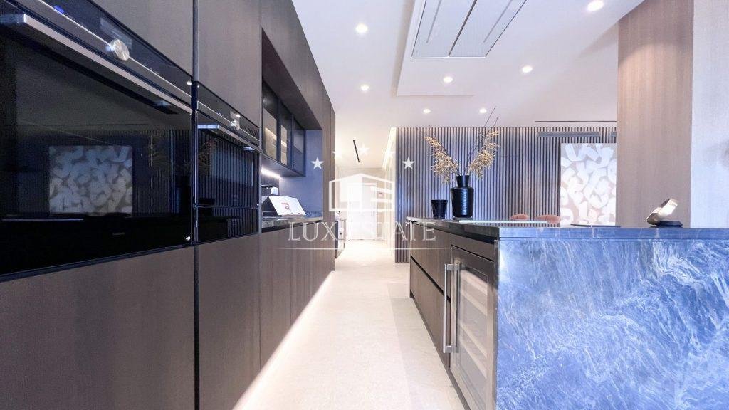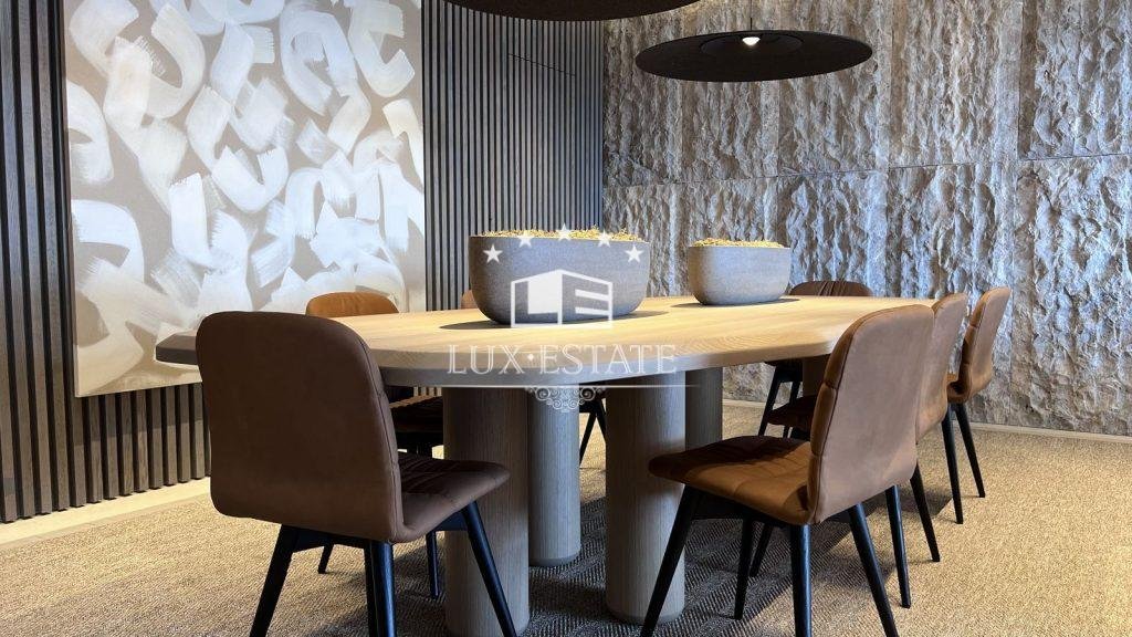 Upon entering the living area, prepare to be amazed. It boasts a sizeable open concept space neatly divided into a kitchen area, TV area (featuring the latest Bang Olufsen TV), dining area and lounge area that is simply breathtaking. The outstanding features of this home are truly remarkable. The high vaulted ceiling and the natural stone fireplace create a sense of magnificence. The stunning view to the old Roman tower in front of the complex adds a historical feel to the modern living space. The stunning view to the old Roman tower in front of the complex adds a historical feel to the modern living space. The stunning view to the old Roman tower in front of the complex adds a historical feel to the modern living space. The kitchen is spacious, elegant, and boasts high-end finishes. Concealed behind a panelled wall, you will find a well-appointed laundry room.