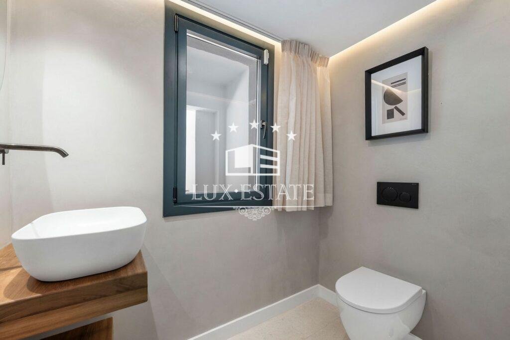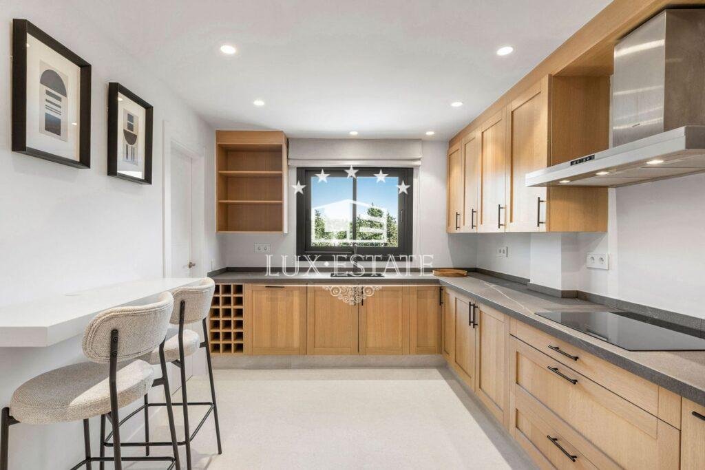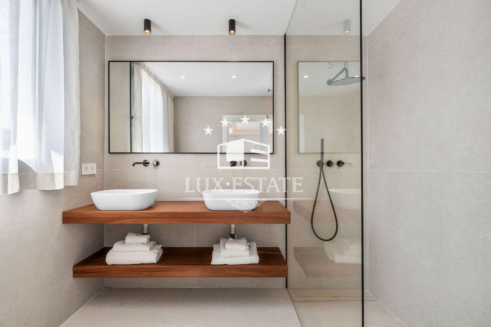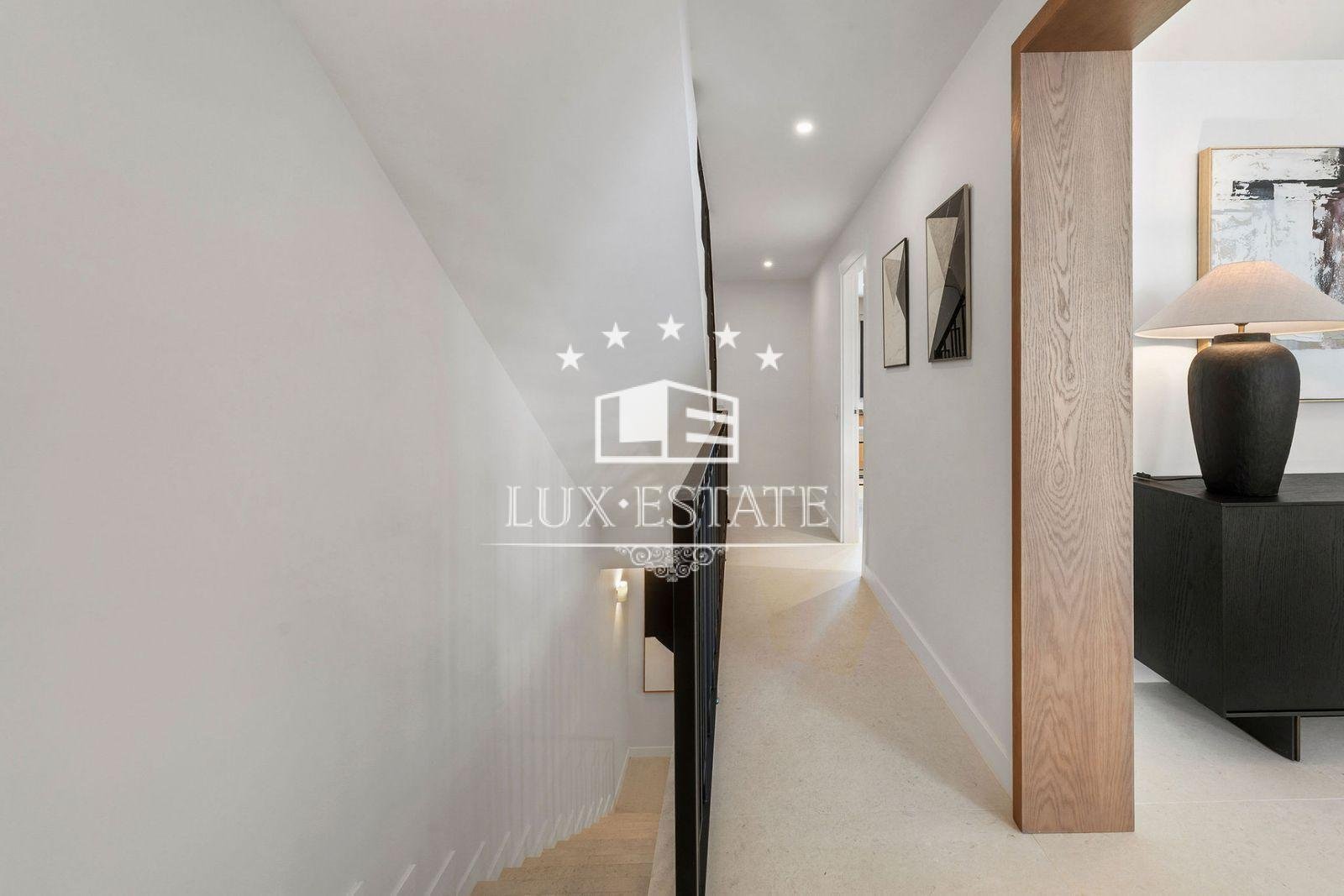 The top floor is dedicated to the master suite, boasting an expansive private terrace with sweeping panoramic views. Two additional bedrooms and a shared bathroom complete this level, making the home exceptionally well distributed for families or guests.