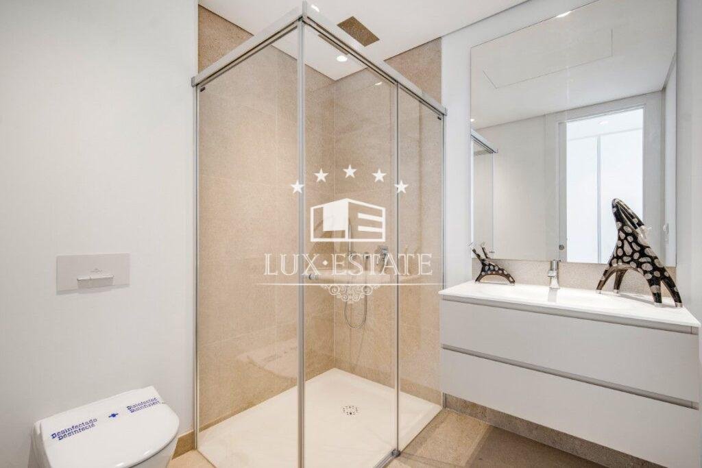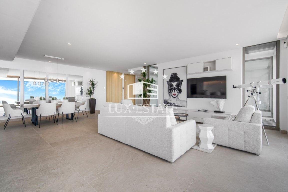 Upon entering the apartment, you’re welcomed into a spacious open-plan living and dining area, complemented by a fully fitted kitchen equipped with top-of-the-line appliances. The property features two master suites, each with direct access to a large terrace boasting panoramic views, a guest suite, a guest toilet, a laundry room, and a versatile multipurpose space perfect for a home office.