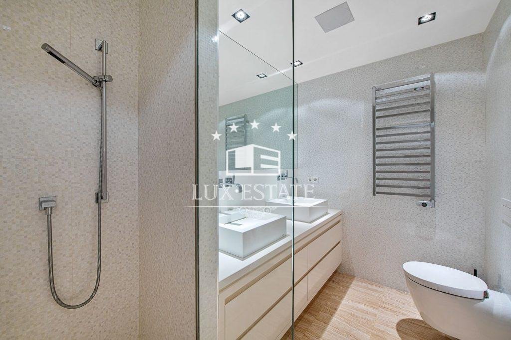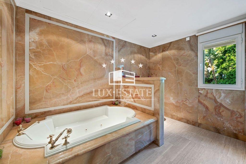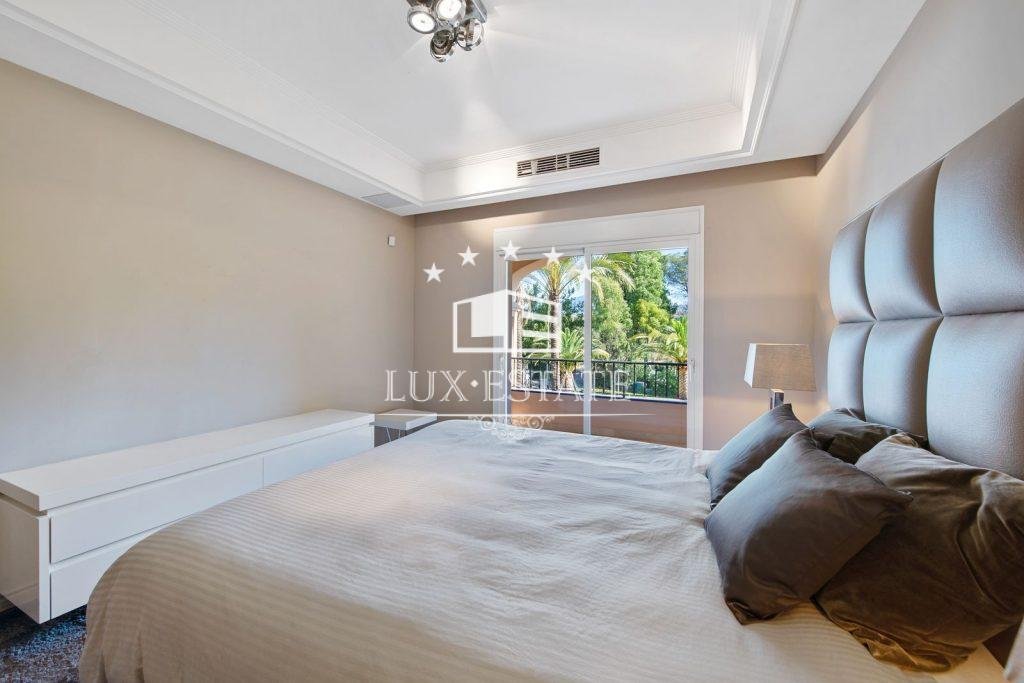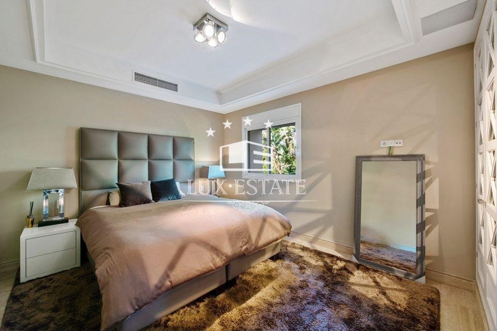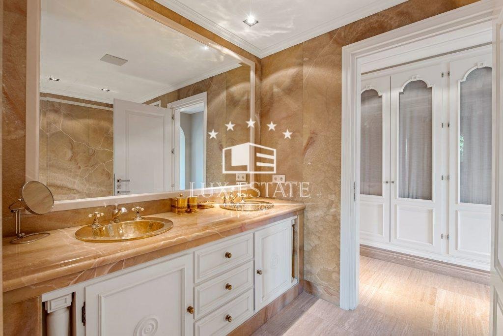 On the opposite end of the residence, towards the back, there are two bedrooms with ensuite bathrooms, a central bedroom with a bathroom, and towards the front, the luxurious master suite. Featuring a generous amount of wardrobe space, the master bedroom has an exquisitely designed ensuite bathroom that incorporates rich marbles throughout. The main bedroom provides stunning views of the gardens and the West towards the sea.