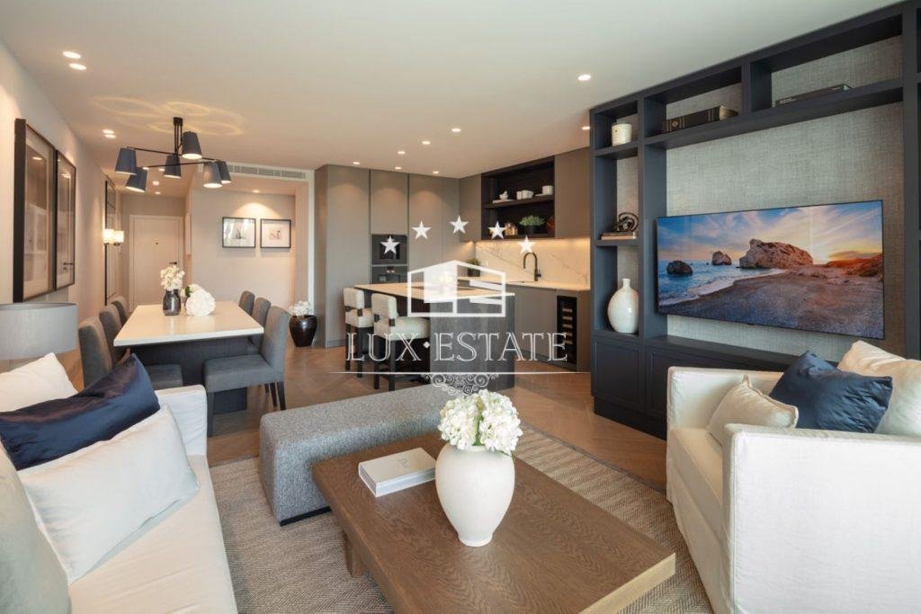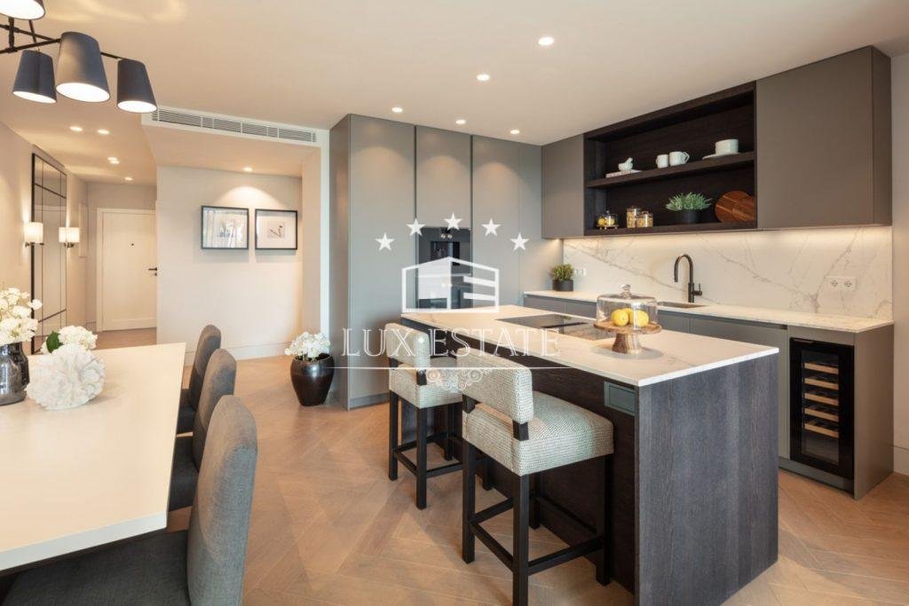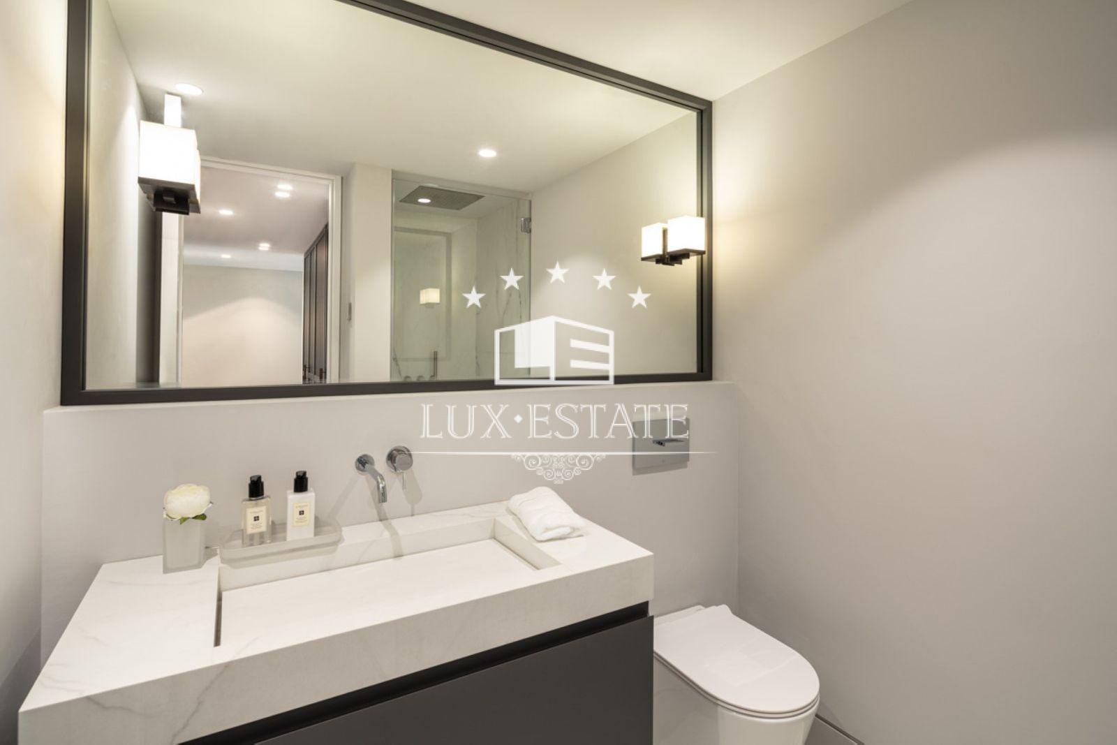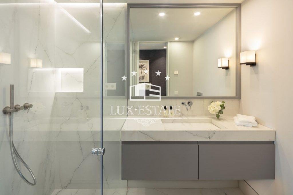 The generously proportioned master bedroom boasts an en-suite bathroom and dressing area, with access to the main terrace. The second bedroom also benefits from an en-suite bathroom and a balcony, while the third bedroom has a separate bathroom.