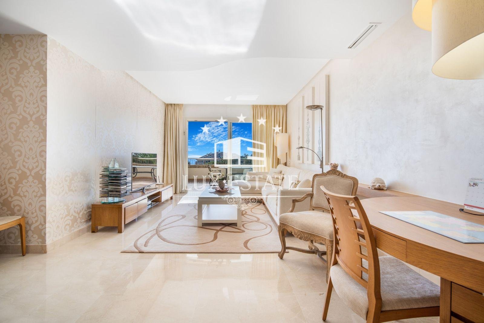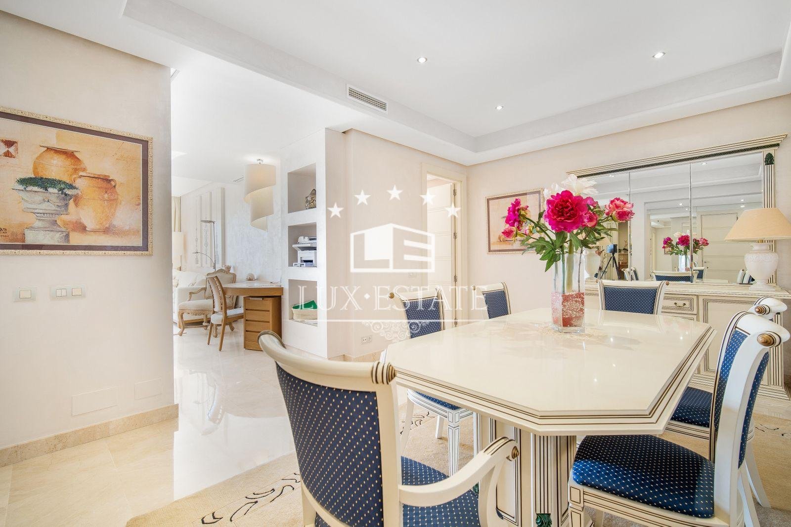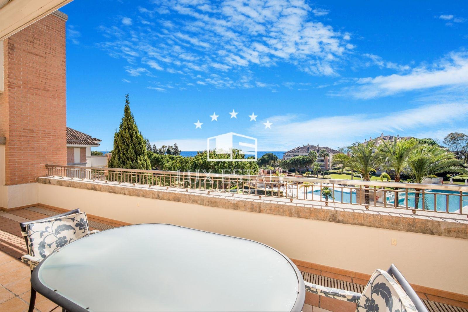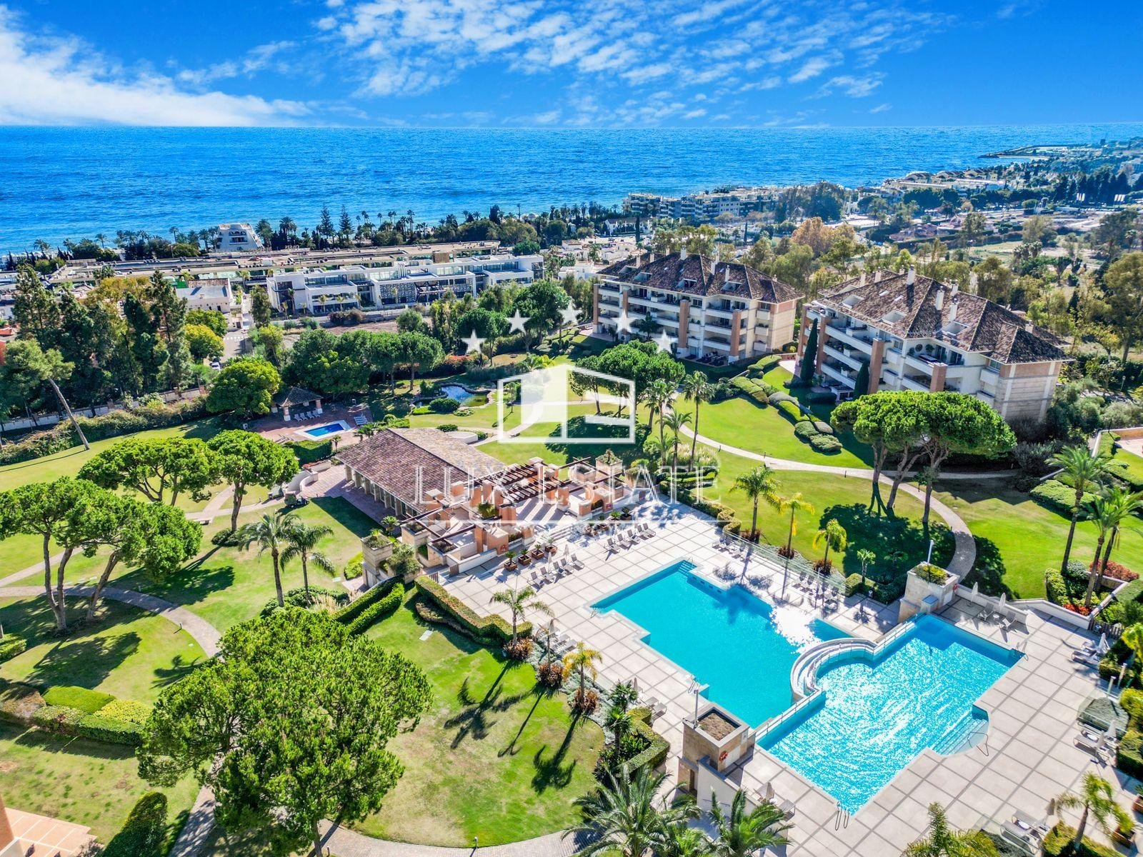 Incredible two-bedroom, south-facing flat in the desirable gated community of La Trinidad, located on the Golden Mile in Marbella. This impressive flat is situated in one of the community’s finest blocks with splendid sea views. La Trinidad provides facilities for residents such as 24-hour gated security; immaculately maintained gardens; communal outdoor swimming pools; an indoor heated pool; fitness centre; sauna; seasonal café, as well as being conveniently close to the beach and surrounded by local amenities. The property comprises of an open-plan living and dining area with access to a private terrace boasting stunning sea and pool views; a fully-equipped kitchen with a separate laundry area, two bedrooms, each with an en suite bathroom and access to the terrace, and a guest toilet. Additional features include hot and cold air conditioning, marble flooring, private parking, a storage space, and electric shutters.
