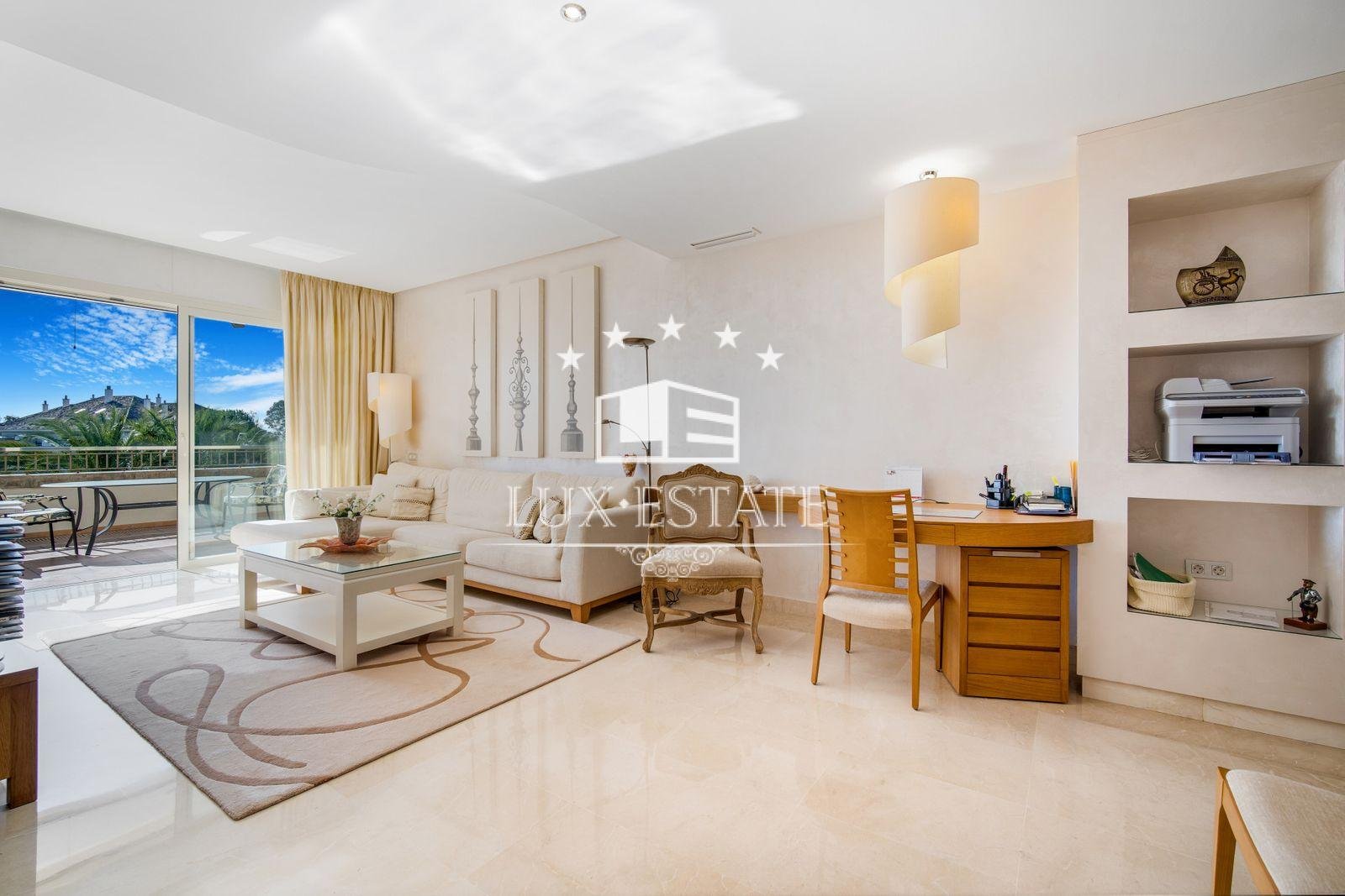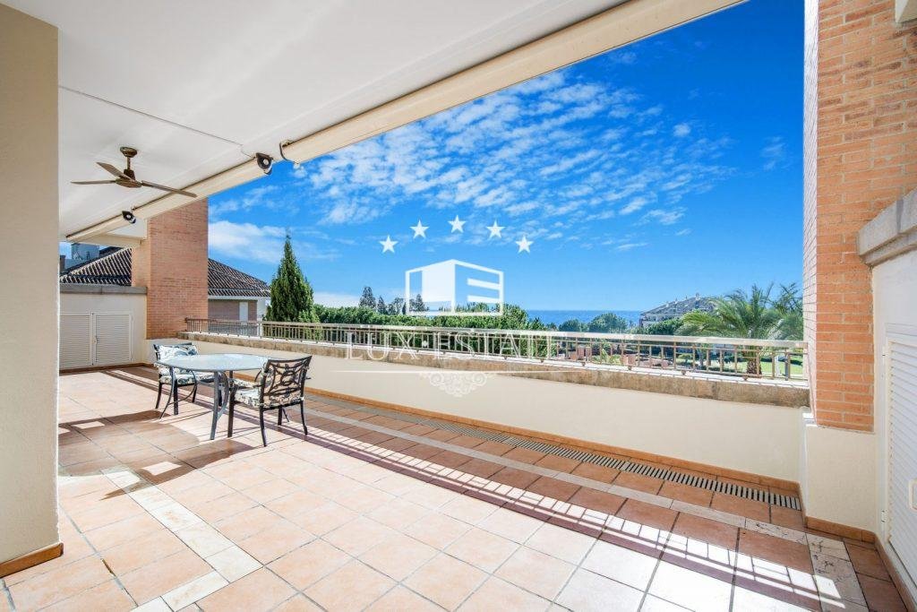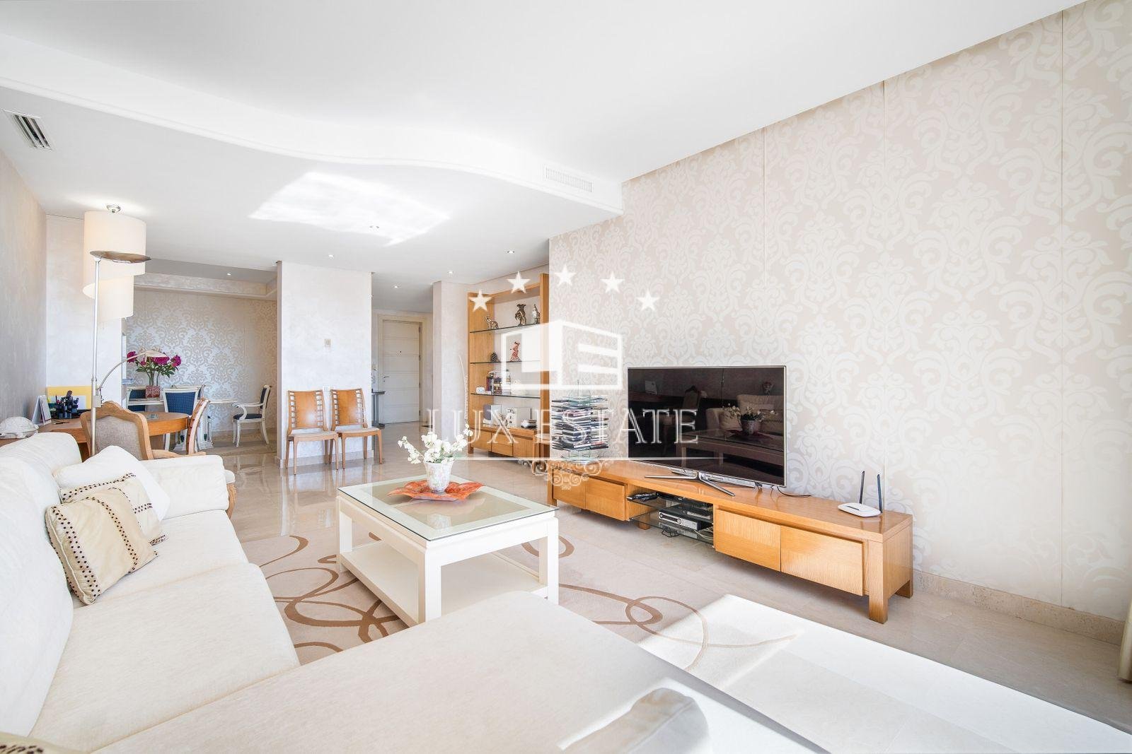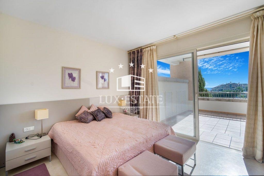 Incredible two-bedroom, south-facing flat in the desirable gated community of La Trinidad, located on the Golden Mile in Marbella. This impressive flat is situated in one of the community’s finest blocks with splendid sea views. La Trinidad provides facilities for residents such as 24-hour gated security; immaculately maintained gardens; communal outdoor swimming pools; an indoor heated pool; fitness centre; sauna; seasonal café, as well as being conveniently close to the beach and surrounded by local amenities. The property comprises of an open-plan living and dining area with access to a private terrace boasting stunning sea and pool views; a fully-equipped kitchen with a separate laundry area, two bedrooms, each with an en suite bathroom and access to the terrace, and a guest toilet. Additional features include hot and cold air conditioning, marble flooring, private parking, a storage space, and electric shutters.