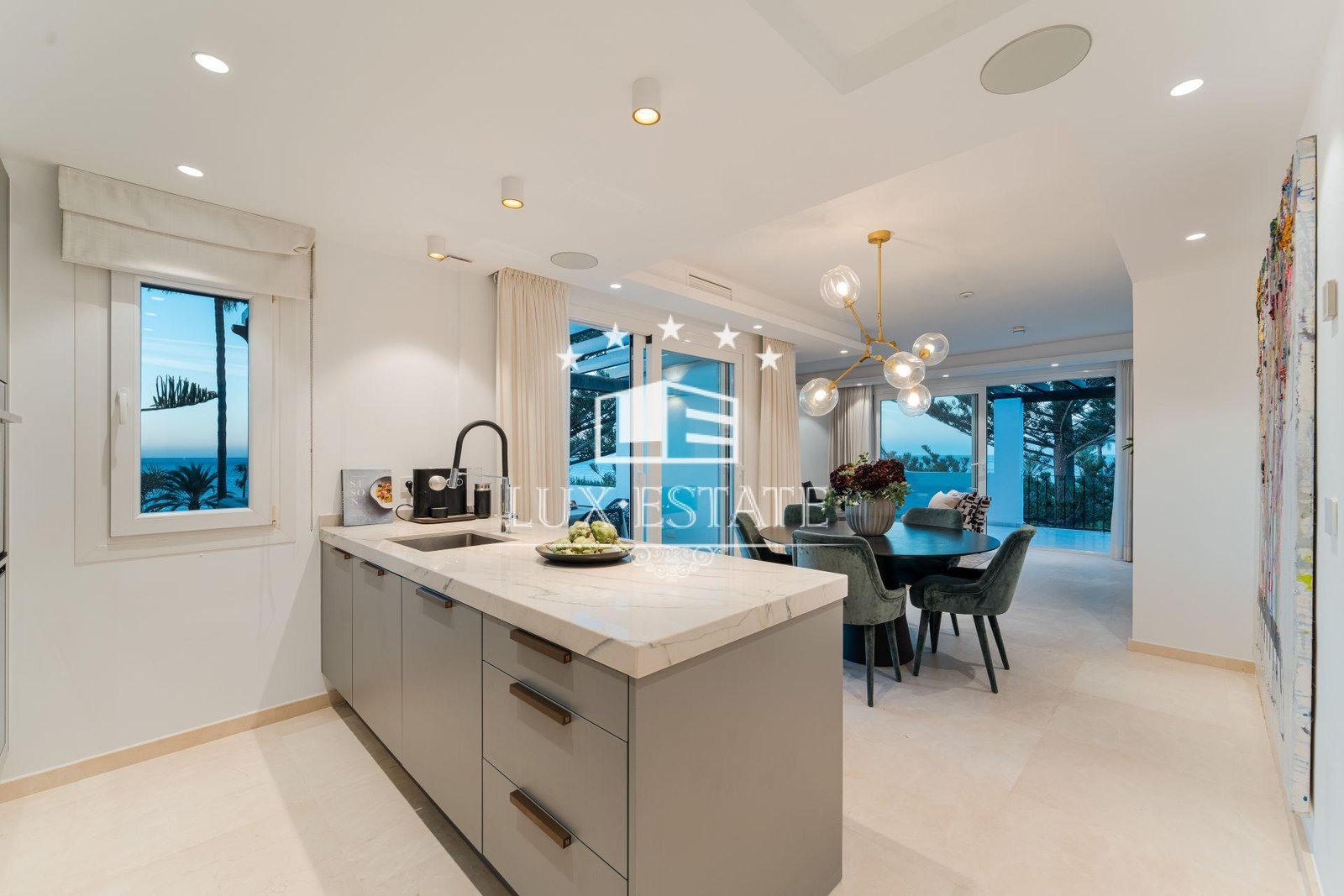 Inside, the penthouse is defined by natural light, seamless flow, and meticulous attention to detail. The layout is designed to feel open and airy while maintaining privacy between the social and sleeping areas. At its heart lies a bespoke Poggenpohl kitchen equipped with NEFF appliances—an ideal fusion of style and functionality. The kitchen opens onto a spacious living and dining area that connects directly to the south-facing terrace, perfect for al fresco dining and entertaining, complete with a built-in BBQ. A second west-facing terrace, accessible from both the master bedroom and the living room, offers a peaceful lounge area to enjoy Mediterranean evenings and spectacular sunsets.