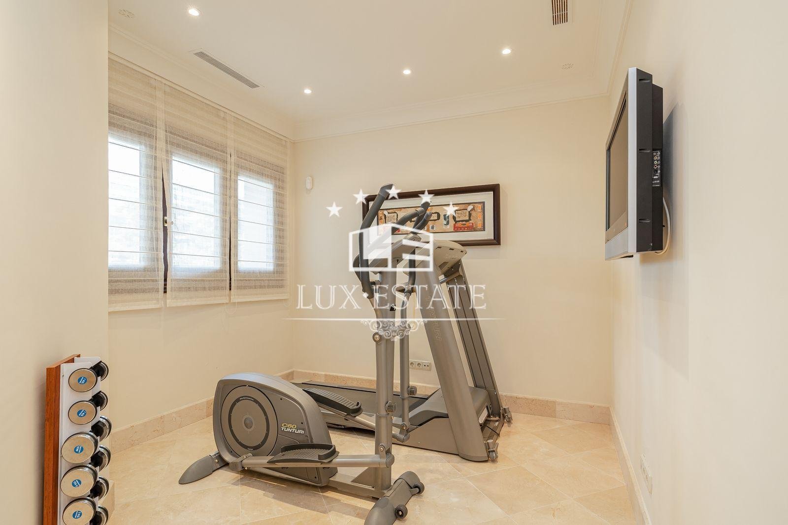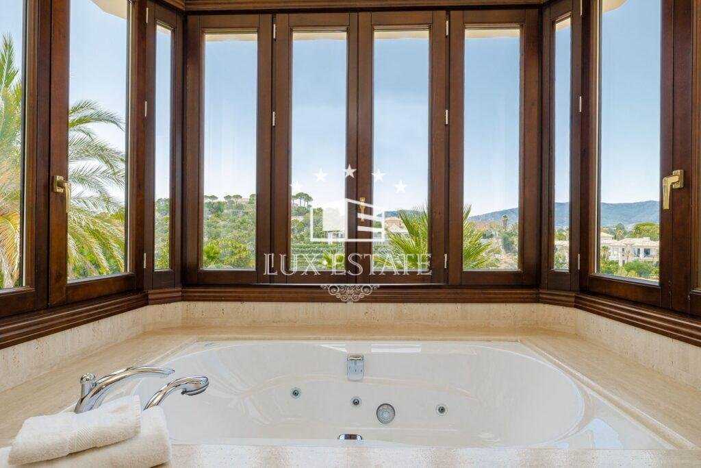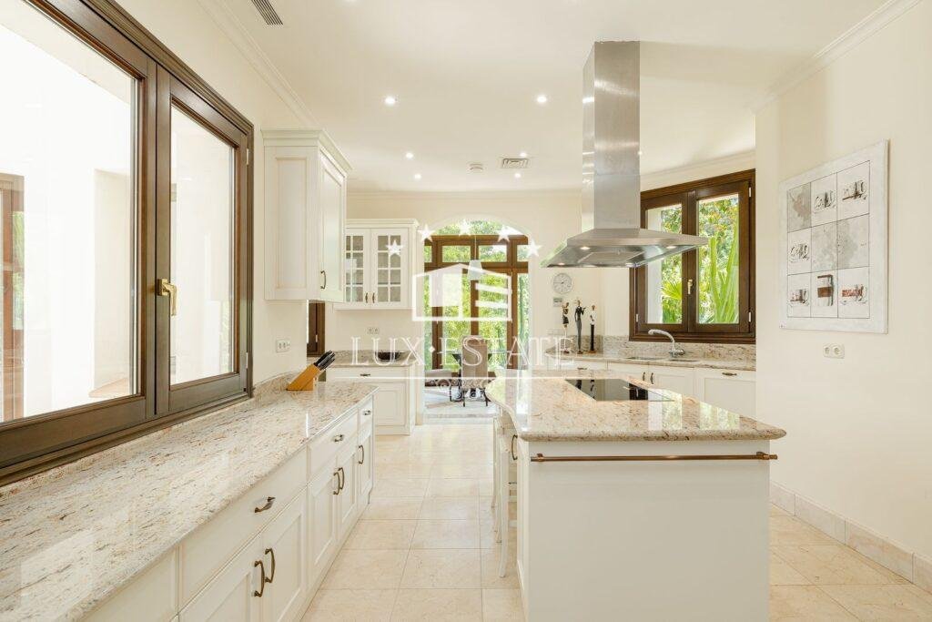 Situated in La Zagaleta, this exquisite villa features a stunning driveway leading to the main entrance and ample parking, plus an underground garage with space for up to five cars. Upon entering, you are welcomed by an impressive entrance hall with high ceilings and large windows, flooding the space with natural light. The living room boasts a wooden, vaulted ceiling and a beautiful fireplace, creating a cozy family atmosphere. The kitchen seamlessly connects to the living room and a separate breakfast area, offering breathtaking views over the golf course.