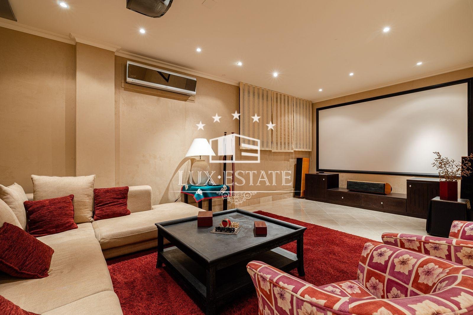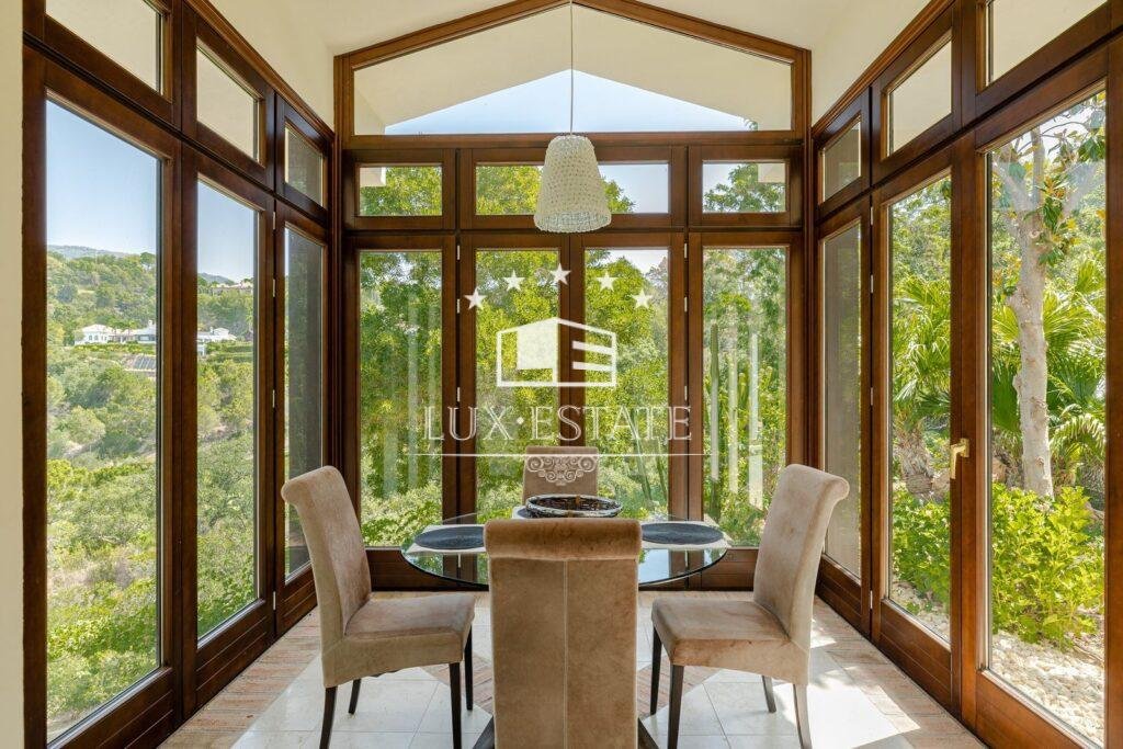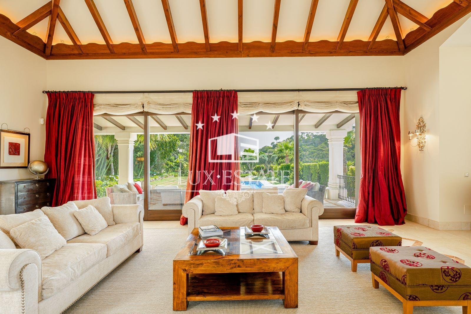 The living room opens to the main outdoor area, featuring various terraces for dining, lounging, or sunbathing. With its South-West orientation, the property enjoys all-day sunshine and spectacular sunsets. The immaculate gardens and impressive swimming pool are meticulously maintained, blending perfectly with the stunning natural mountain backdrop. The entire villa exudes luxury, peace, and tranquility.