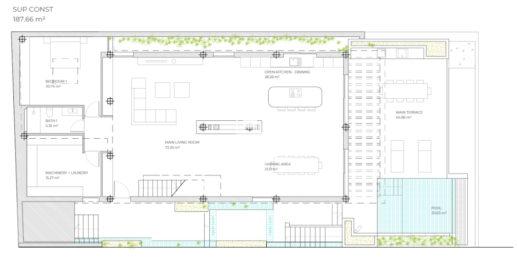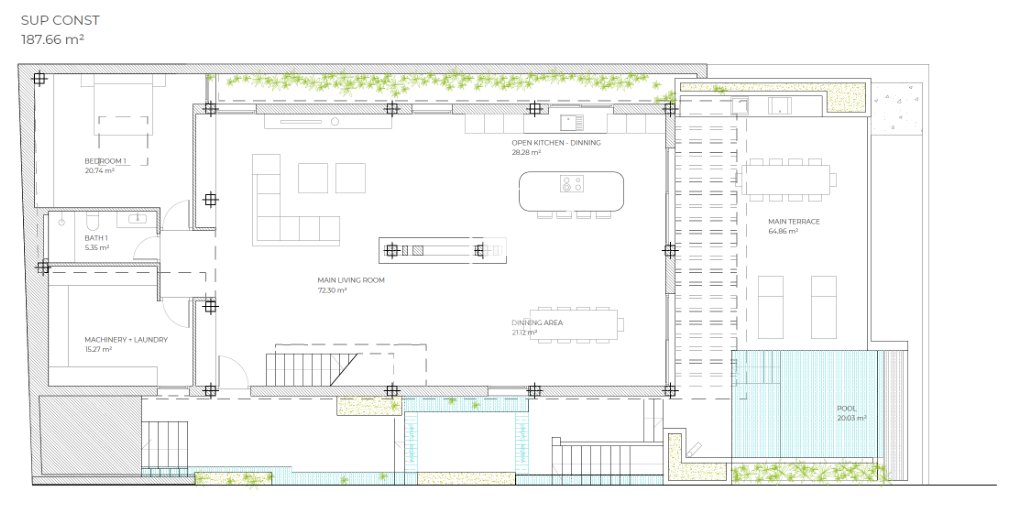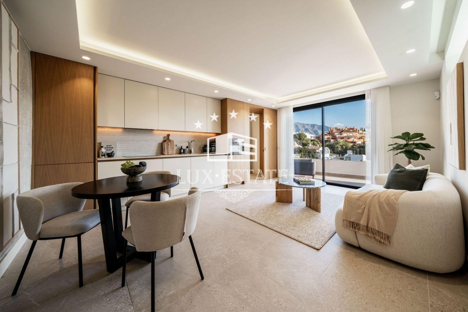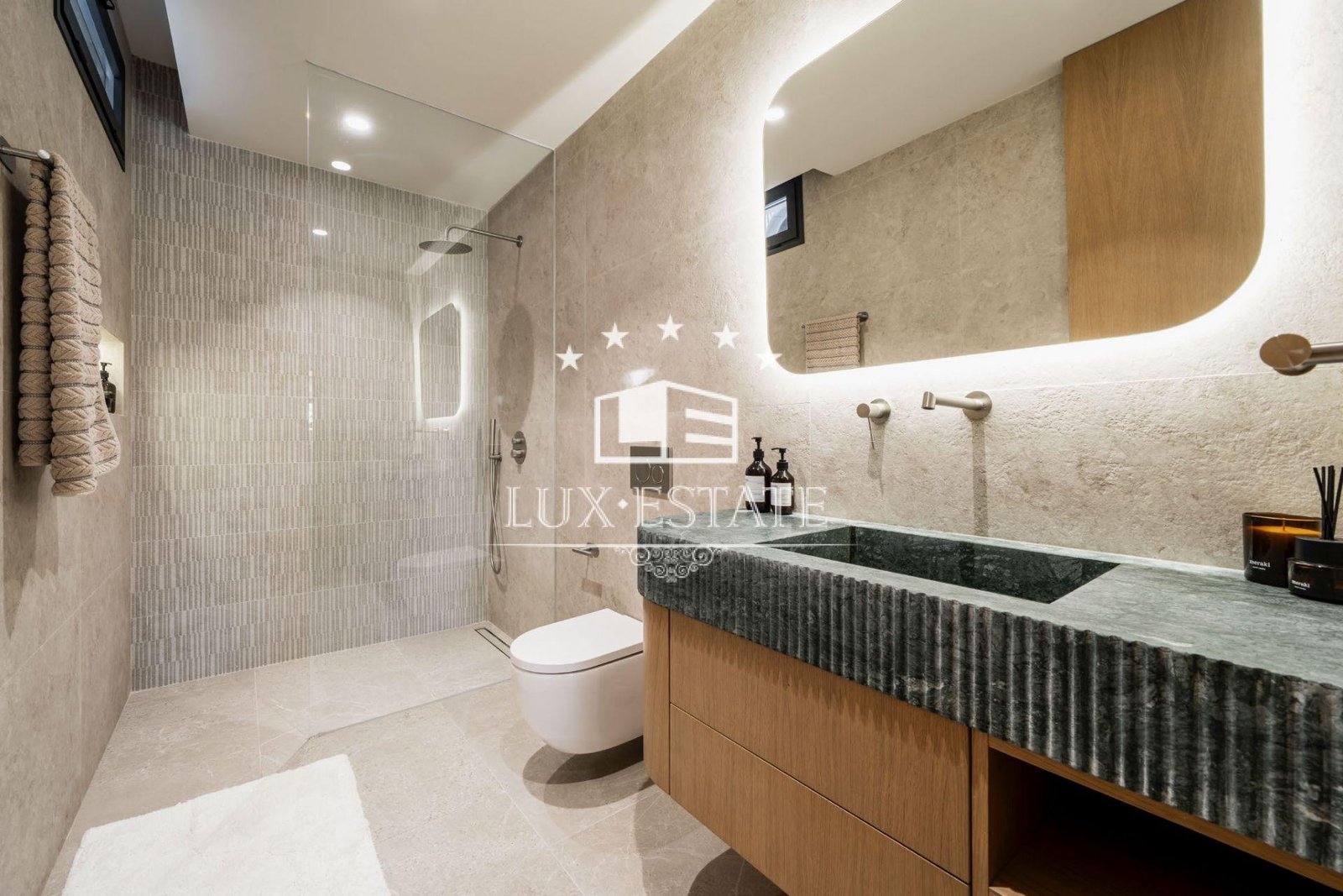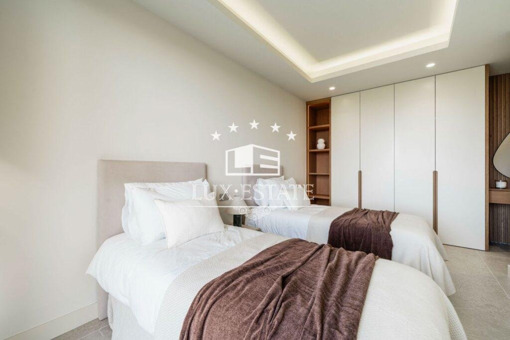 A rooftop terrace completes the experience, offering a jacuzzi and 360° panoramic views—perfect for sunrise yoga or sunset cocktails. Interiors showcase premium finishes, including porcelain floors, custom wood cabinetry, and natural stone accents, combining warmth with refined design.