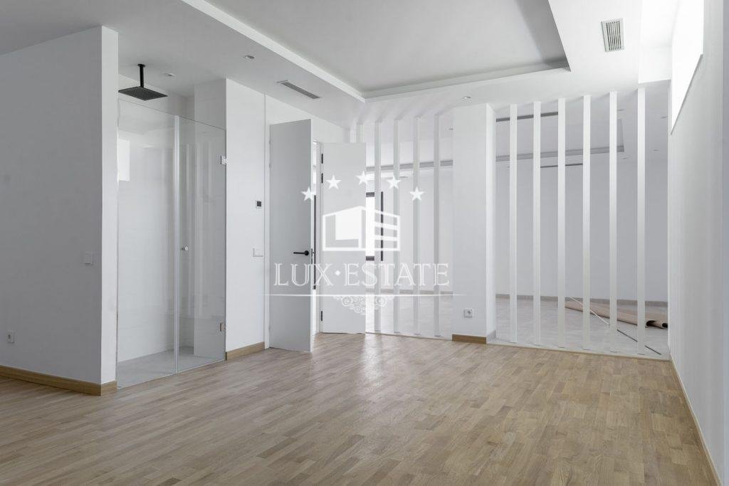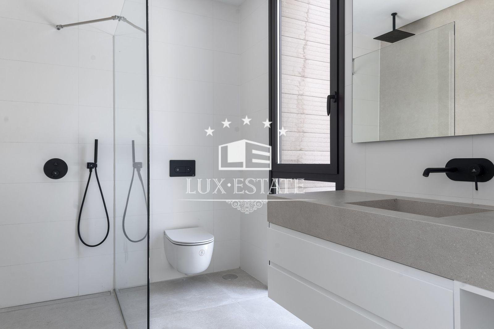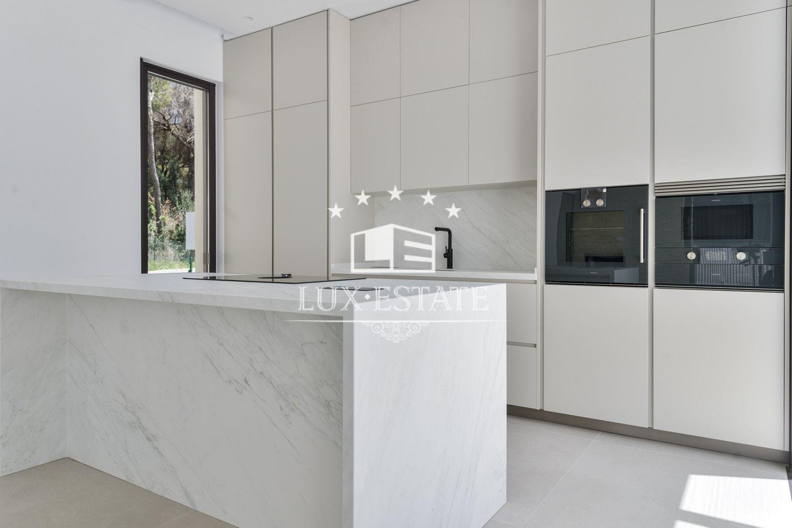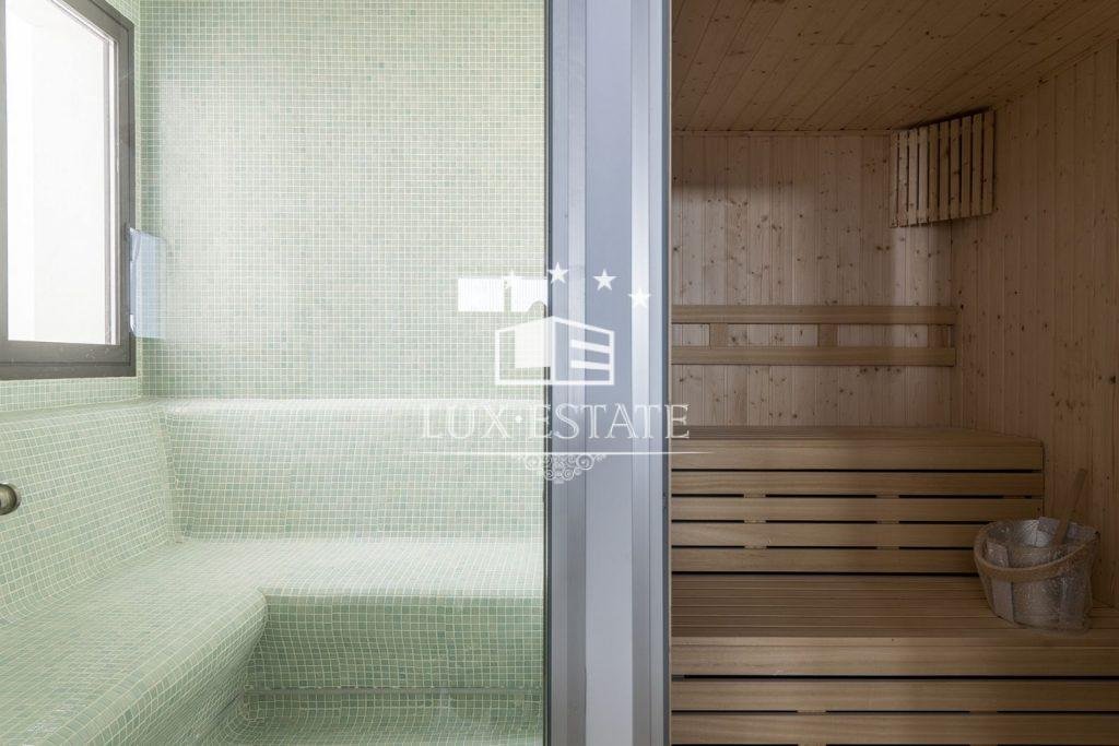 The villa occupies a plot of 885 sqm with a total living space of 730 sqm. It boasts a capacious 225 sqm terrace and has four bedrooms plus five bathrooms. Inside, the property features a roomy lounge, a top-of-the-range kitchen furnished with high-quality appliances and furniture. The villa also boasts a private lift linking every level, a cinema, sauna, and hammam, as well as underfloor heating.