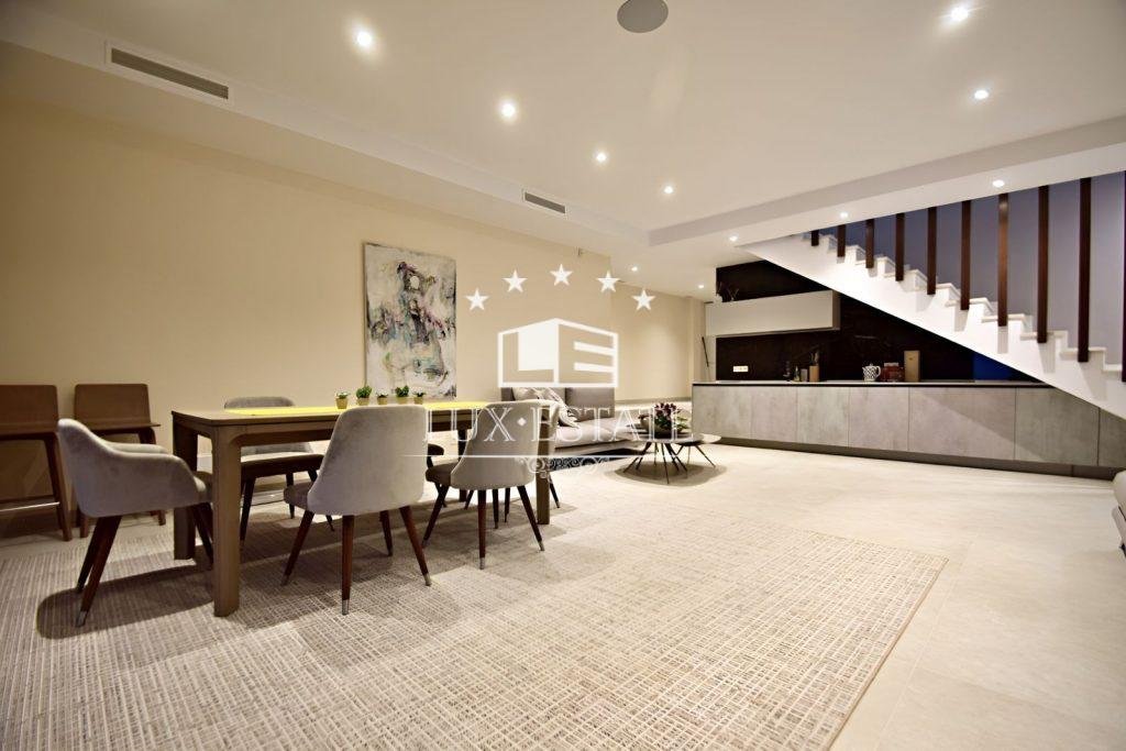 The ground floor reveals an exquisite open-plan feature, which expertly merges indoor and outdoor living spaces. Every detail has been executed with meticulous precision, from the impeccably equipped chef’s kitchen to the elegantly designed staircase. Each component merges seamlessly to create a harmonious and faultless aesthetic. This capacious and brightly lit space sets the scene for year-round entertainment, boasting two spacious gardens, two distinct dining areas accommodating 6 and 8 guests respectively, and an array of inviting lounge corners. On the same level, the dwelling offers three tastefully furnished bedrooms. Each bedroom features its own private en-suite bathroom, generous wardrobes, and direct entry to the front and rear gardens.