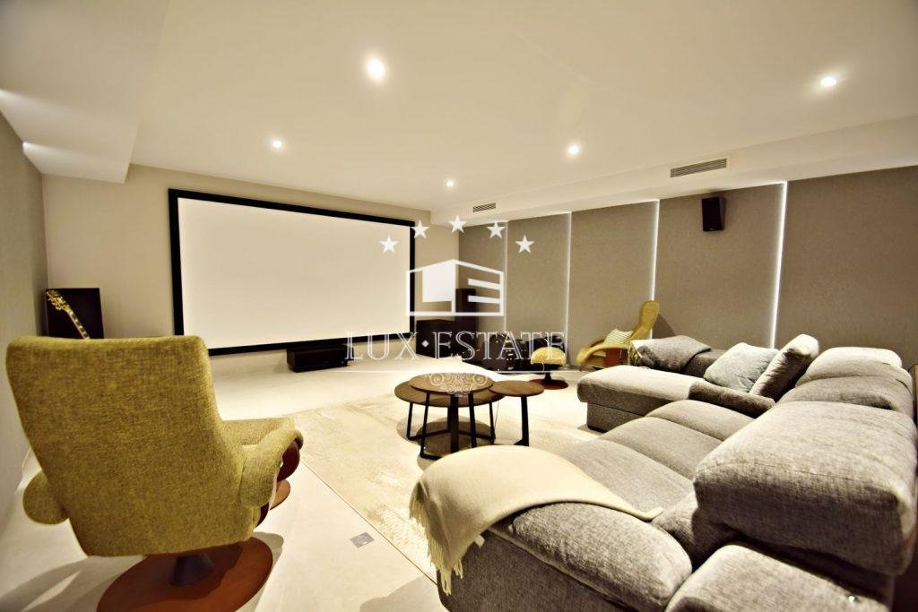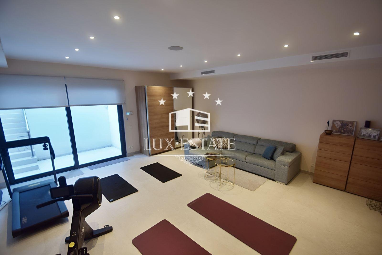 The lower level has been fully renovated to incorporate a unique living space, featuring a thoughtfully planned open-plan kitchen, a discreet private entrance, a dedicated cinema area, and a well-equipped fitness studio.