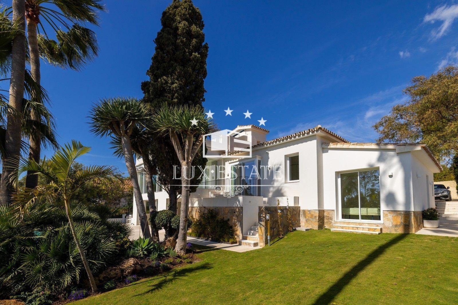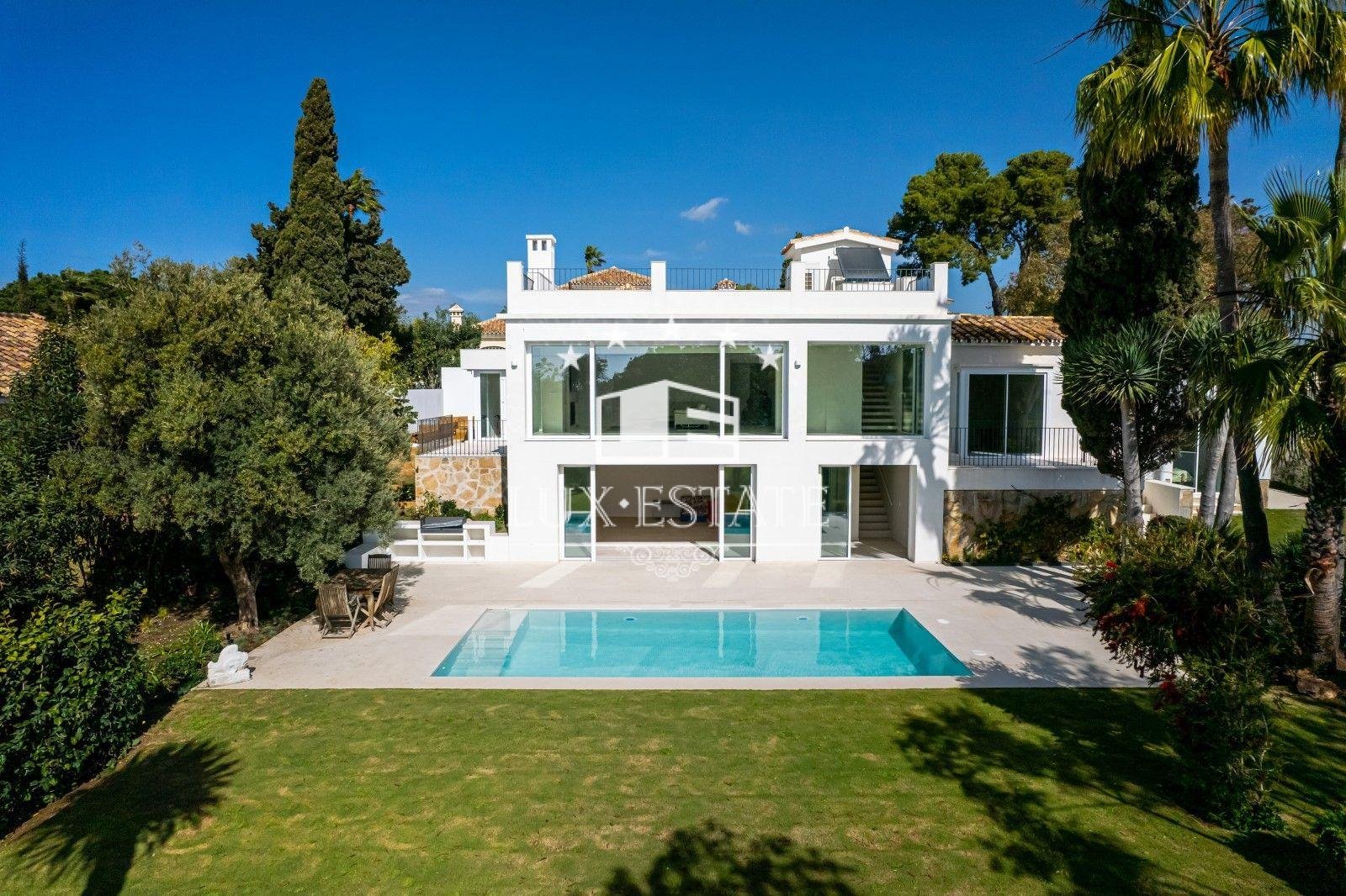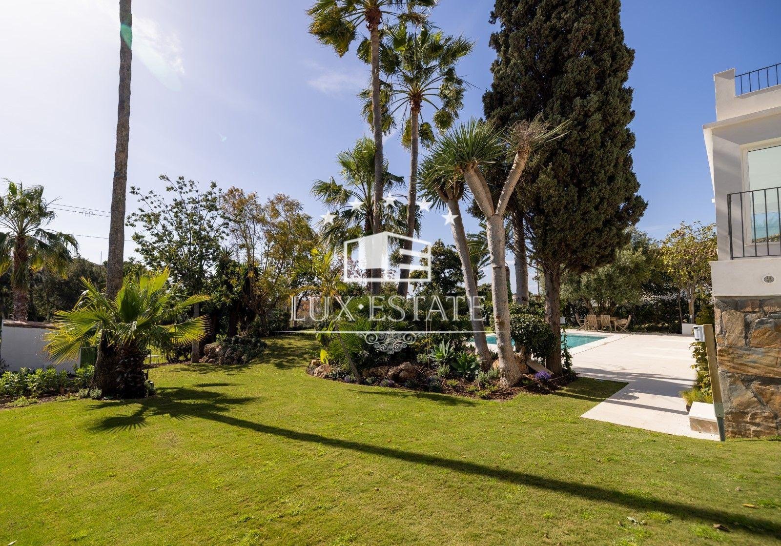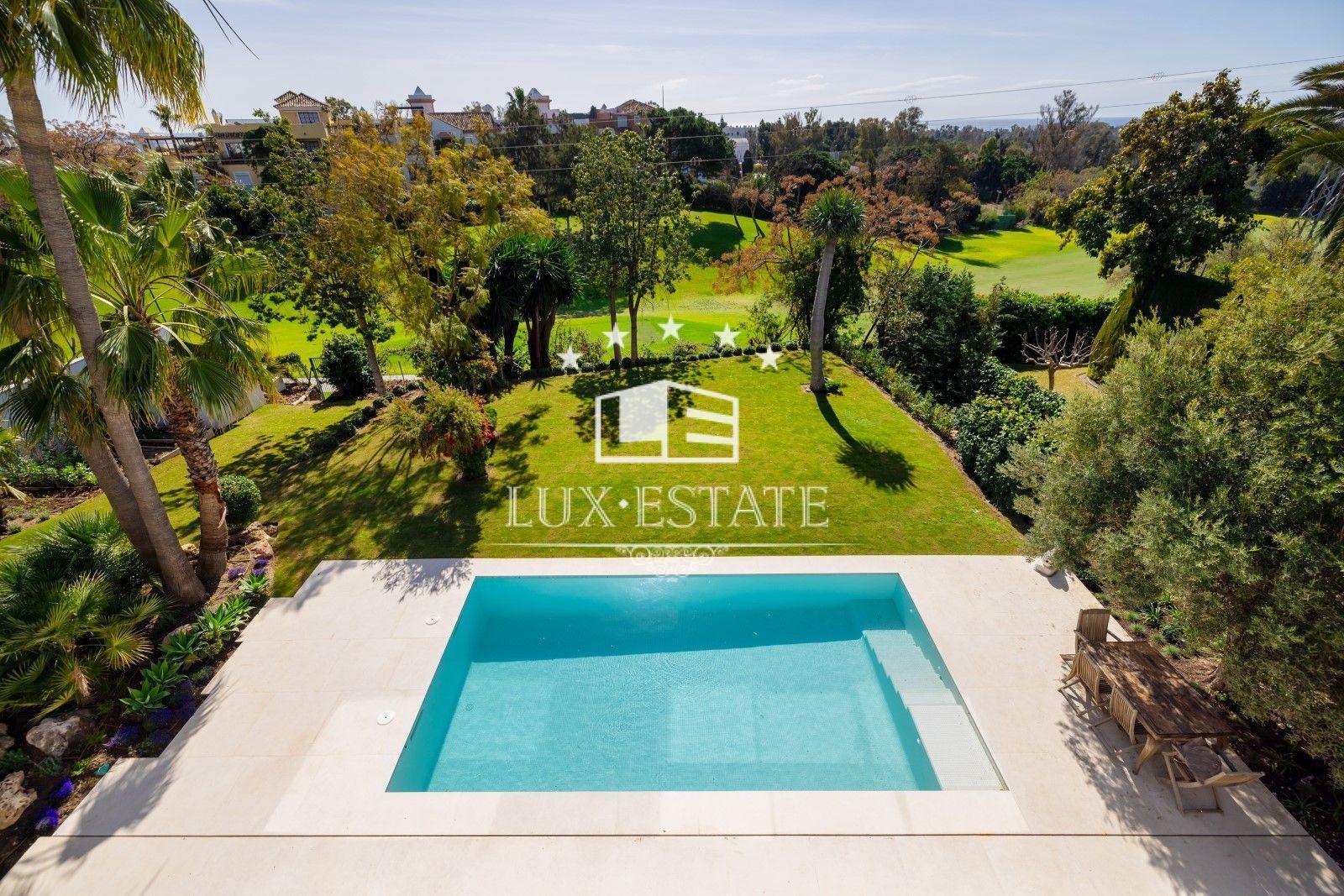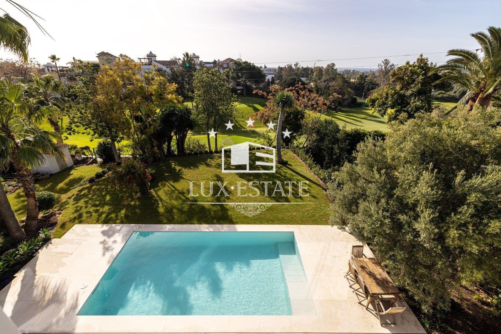 Beautiful fully refurbished south-facing Mediterranean-style villa with direct access to the Guadalmina Alta golf course. The spacious and verdant garden features a pool with a relaxation area. The entrance porch leads to a bright living-dining room, a high-end kitchen, a utility room, and a separate dining area with terrace access. This level includes three bedrooms – the principal one with a dressing room and bathroom, the second with an en-suite bathroom, and a guest toilet. From the lounge, there is an internal staircase that directly leads to the solarium. Additionally, there is an external staircase that leads to the terrace of the master bedroom and the outdoor swimming pool. It is also feasible to access the pool through an internal staircase that leads to a spacious multipurpose area that can be utilised as a games room or gymnasium with direct access to the pool and a toilet. Attached to the house, there is a fourth bedroom with its independent access from outside. This is a double bedroom with an attached dressing room and bathroom. It boasts direct access to the garden and car parking for two vehicles. The room is equipped with A/C, underfloor heating, home automation systems, house-wide WIFI installation, and solar panels. With breathtaking views of the golf course, mature garden, and the sea, it presents an unparalleled opportunity. Not to be missed, this villa has been fully modernised by the esteemed Barmi Architect Studio of Marbella.