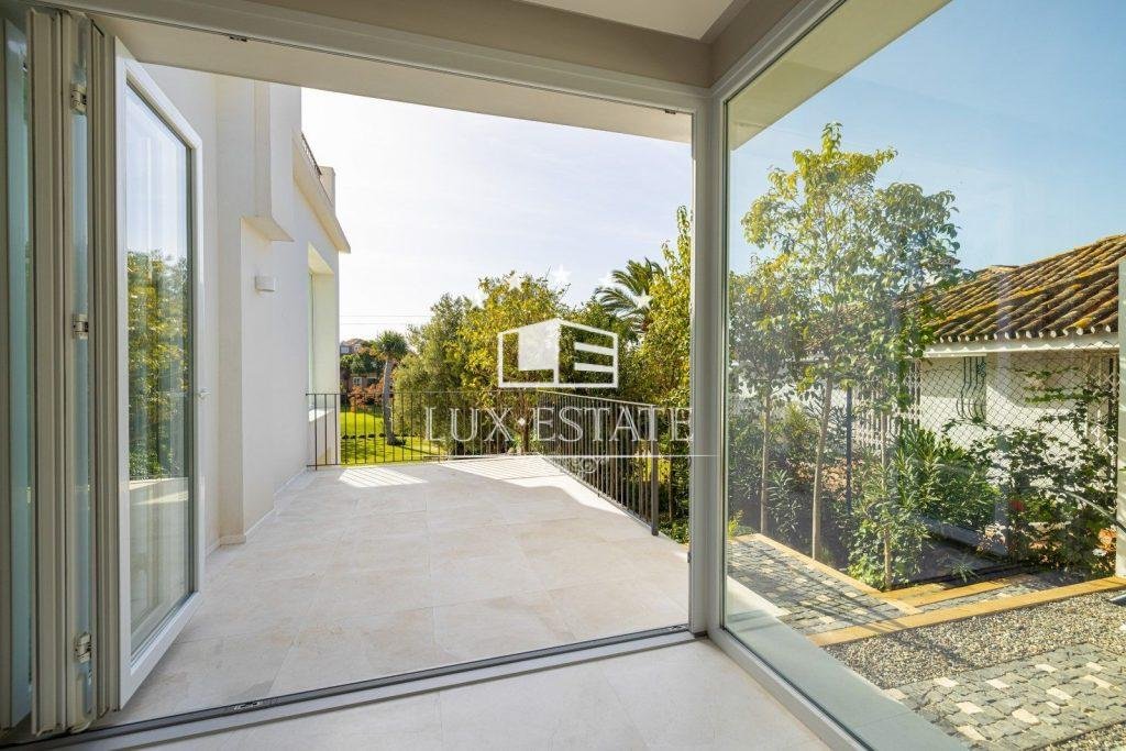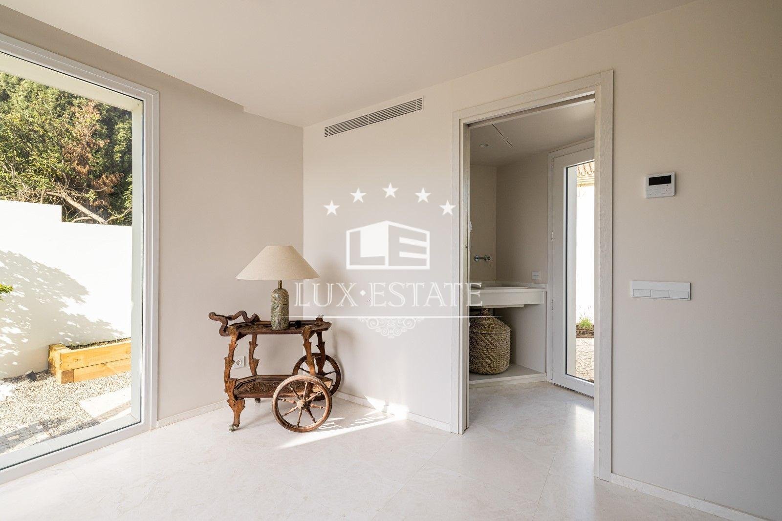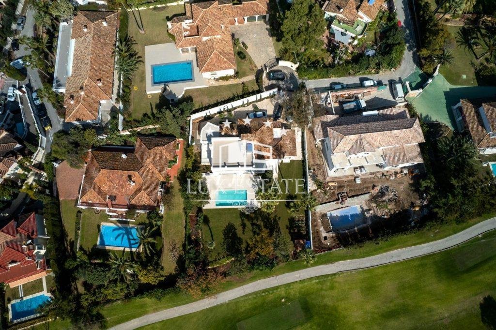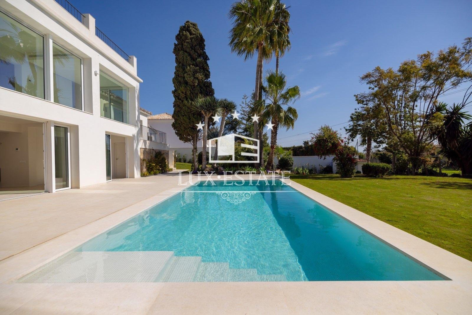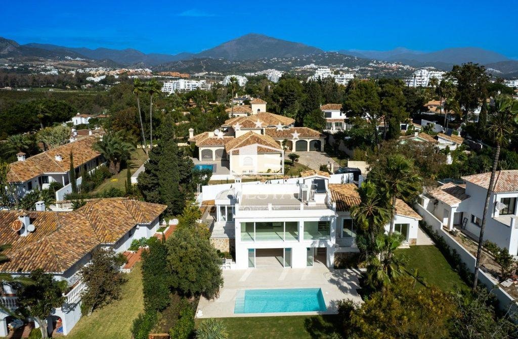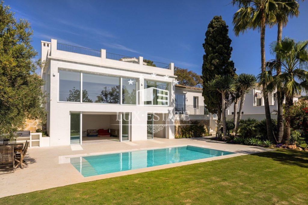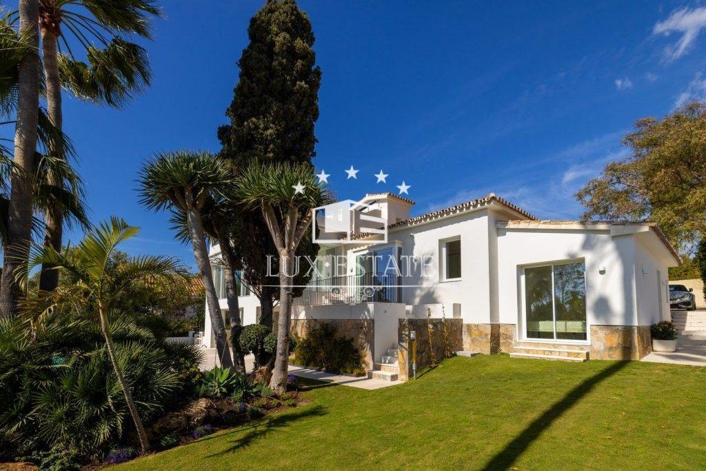 Beautiful fully refurbished south-facing Mediterranean-style villa with direct access to the Guadalmina Alta golf course. The spacious and verdant garden features a pool with a relaxation area. The entrance porch leads to a bright living-dining room, a high-end kitchen, a utility room, and a separate dining area with terrace access. This level includes three bedrooms – the principal one with a dressing room and bathroom, the second with an en-suite bathroom, and a guest toilet. From the lounge, there is an internal staircase that directly leads to the solarium. Additionally, there is an external staircase that leads to the terrace of the master bedroom and the outdoor swimming pool. It is also feasible to access the pool through an internal staircase that leads to a spacious multipurpose area that can be utilised as a games room or gymnasium with direct access to the pool and a toilet. Attached to the house, there is a fourth bedroom with its independent access from outside. This is a double bedroom with an attached dressing room and bathroom. It boasts direct access to the garden and car parking for two vehicles. The room is equipped with A/C, underfloor heating, home automation systems, house-wide WIFI installation, and solar panels. With breathtaking views of the golf course, mature garden, and the sea, it presents an unparalleled opportunity. Not to be missed, this villa has been fully modernised by the esteemed Barmi Architect Studio of Marbella.