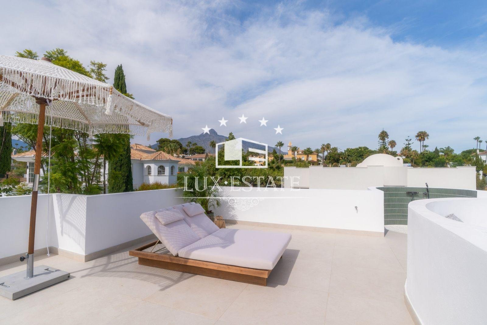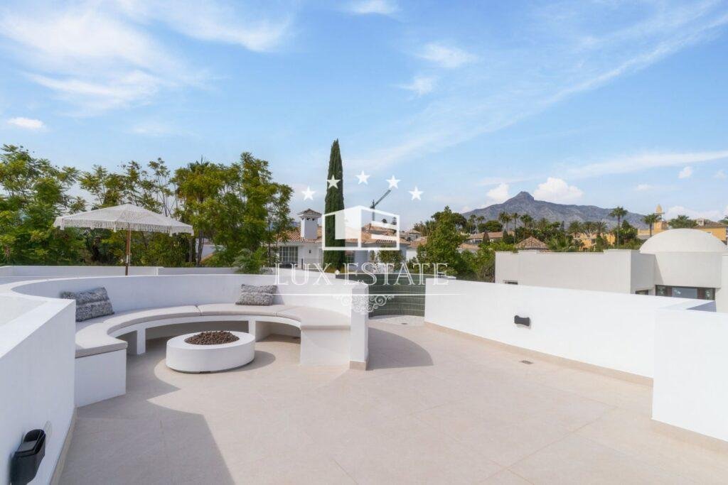 The outdoor areas are perfectly tailored for luxury entertaining and relaxation. The sunny pool terrace enjoys all-day sunshine and is fully integrated with a Sonos sound system and complete Wi-Fi coverage. A stunning rooftop terrace offers breathtaking views over the surrounding mountains and Golf Valley, providing an idyllic setting to enjoy Marbella’s sunsets from dawn until dusk.