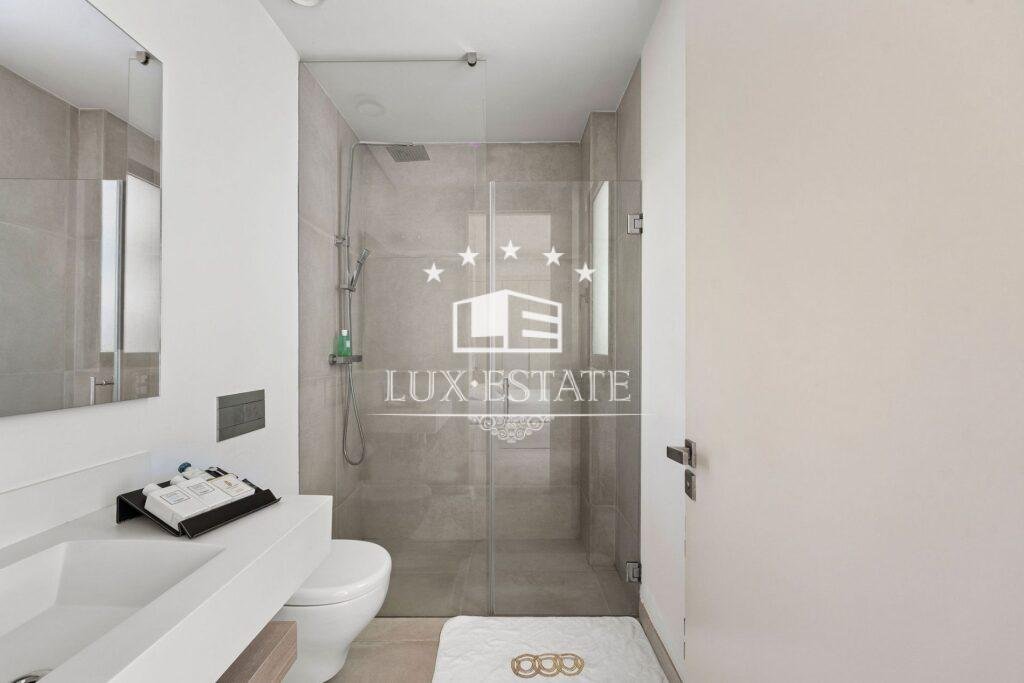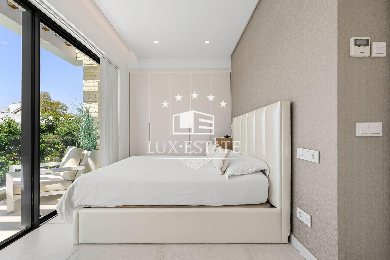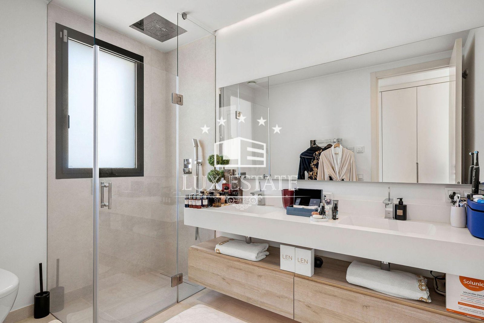 Upstairs, the villa offers a peaceful retreat. The master suite includes an elegant en-suite bathroom and access to a private terrace, ideal for morning coffee or evening relaxation. Two additional bedrooms, each with their own en-suite bathrooms, share access to a second terrace, ensuring abundant natural light and a sense of space throughout the floor.