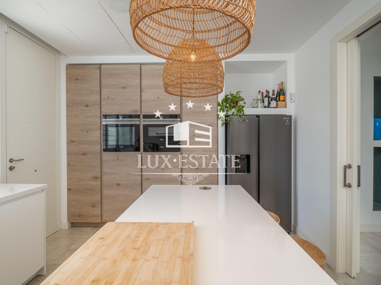 The kitchen is equipped with high-quality woodworking and devices, such as an American-style refrigerator-freezer, a plate warmer, and advanced filtering taps diverting hot and cold, still and sparkling water.