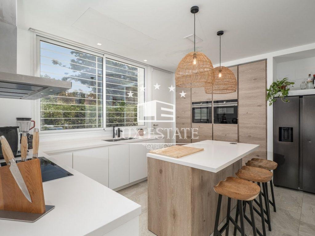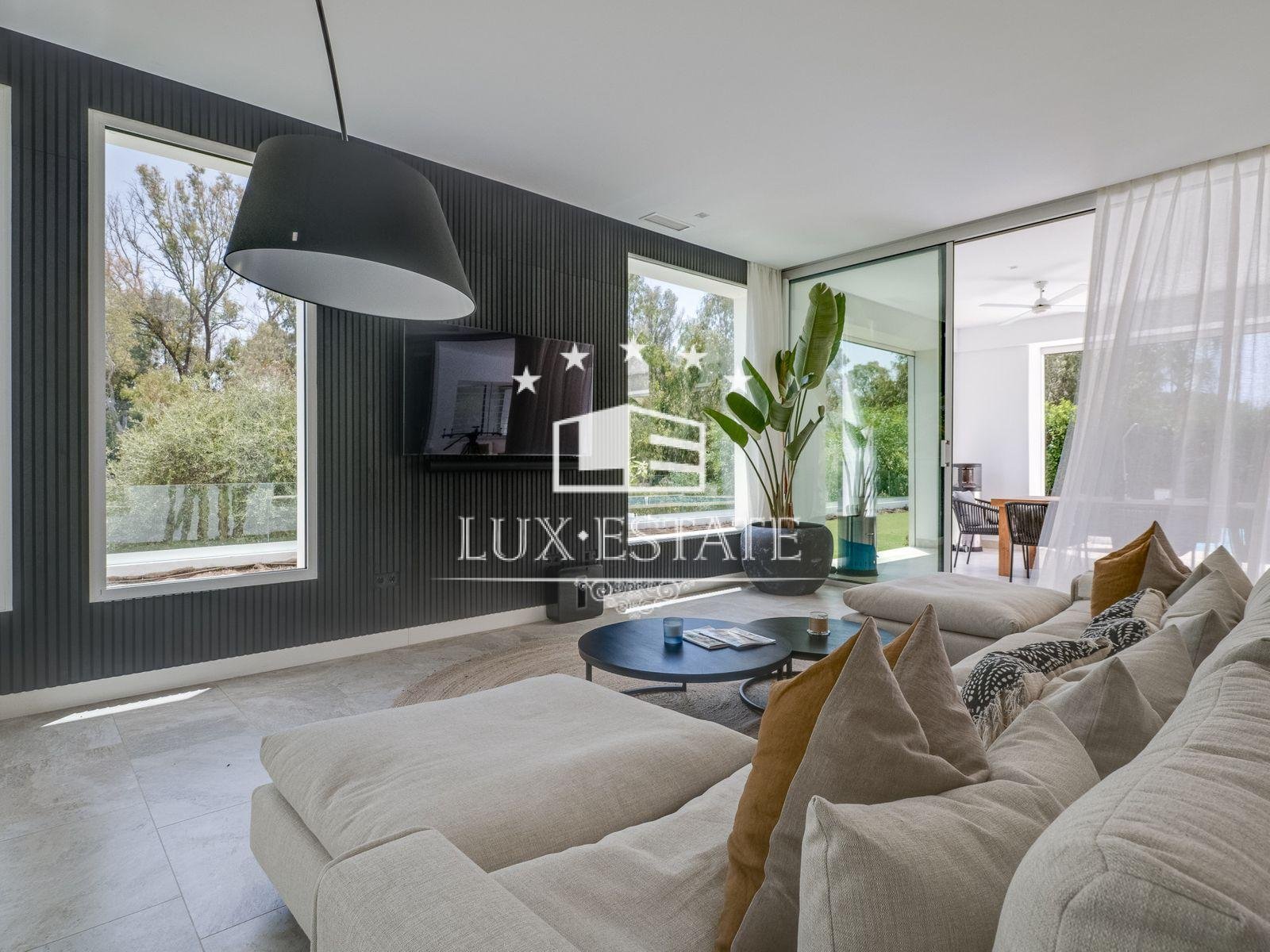 The capacious partially open-plan lounge boasts full-height windows, a fireplace and copious natural light filtering from every direction. Additionally, there is a generously sized covered terrace, suitable for both winter and summer use. The living room, primary terrace, and swimming pool are level without any steps.