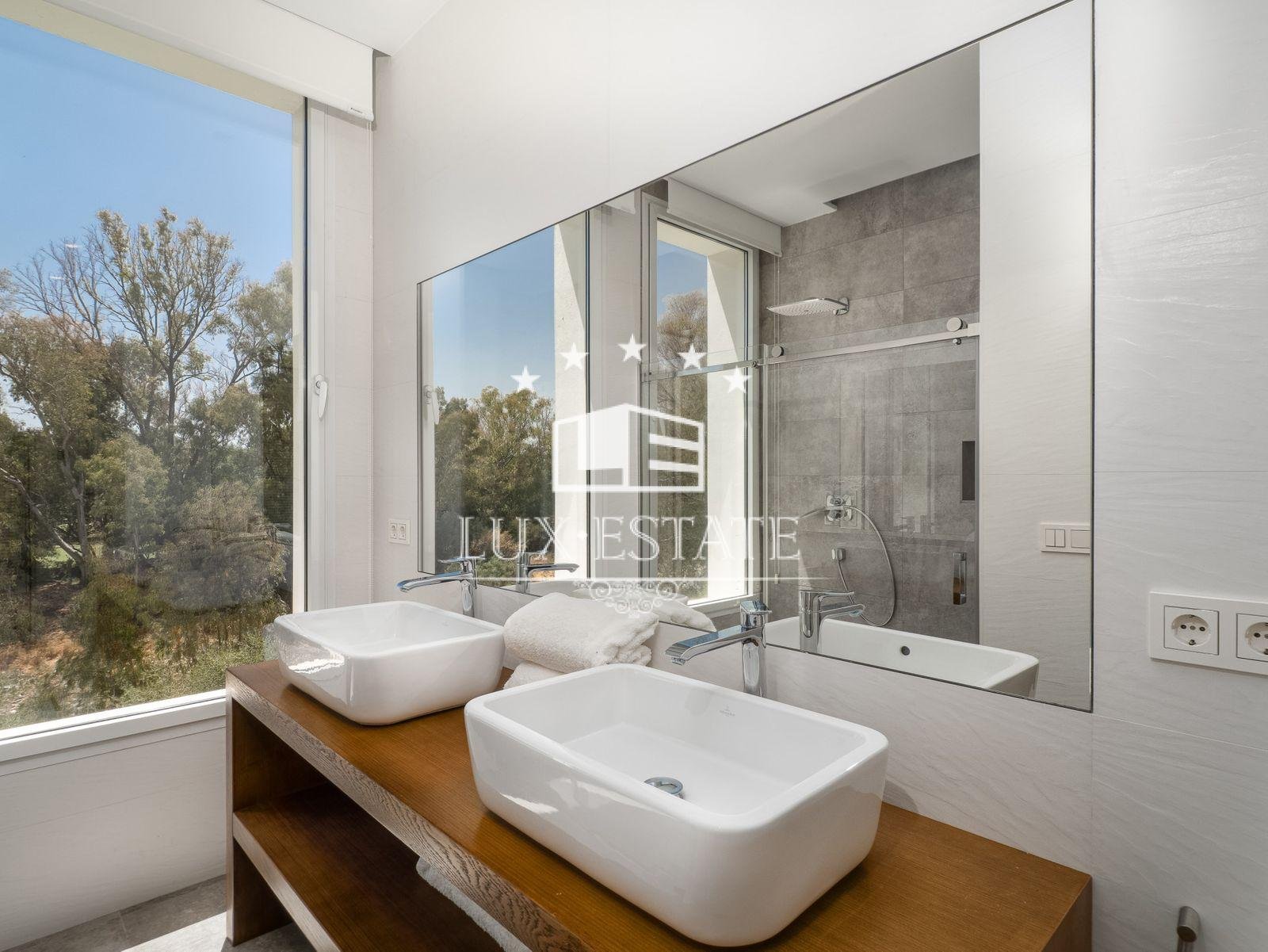 The ground floor boasts two ensuite guest bedrooms and a guest lavatory. The lower ground floor offers an additional ensuite guest bedroom filled with natural light. The property features a gym, spa, sauna, refrigerated ice bath and a separate wine cellar. A sizeable garage with space for two to three cars completes the property. It benefits from southern orientation, high ceilings and abundant natural light, ensuring excellent privacy levels. We encourage viewings.
