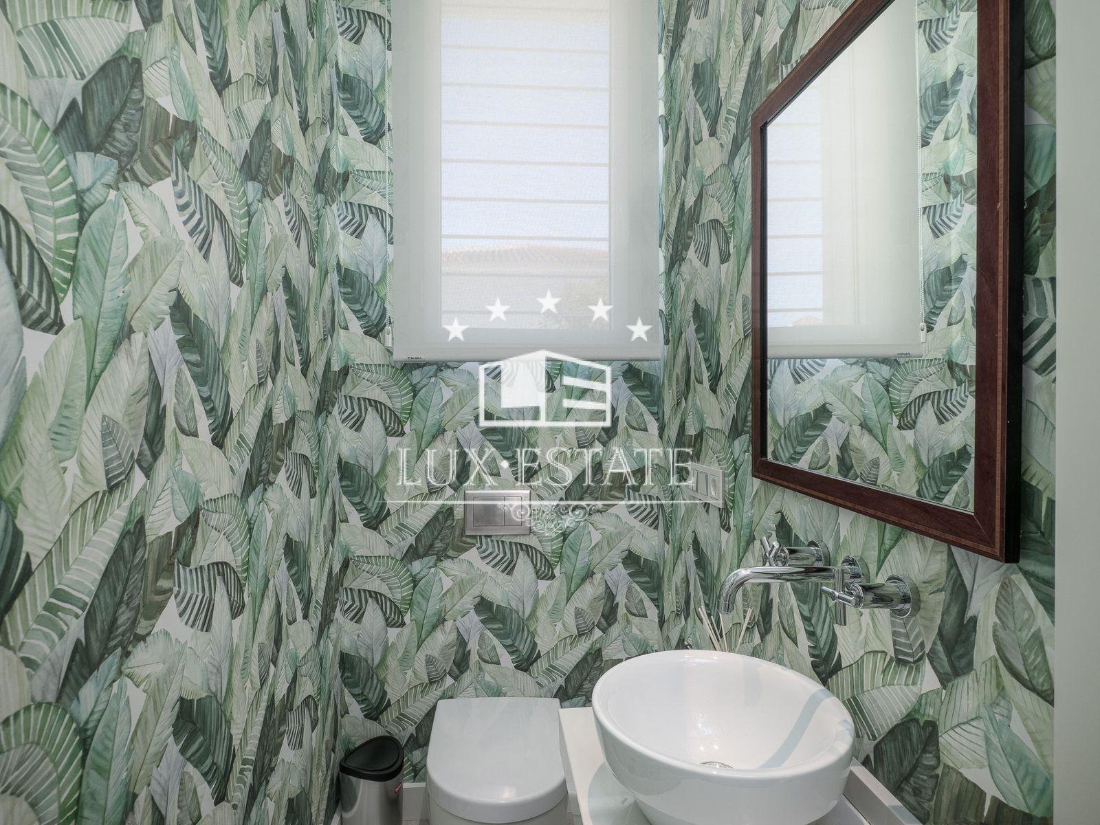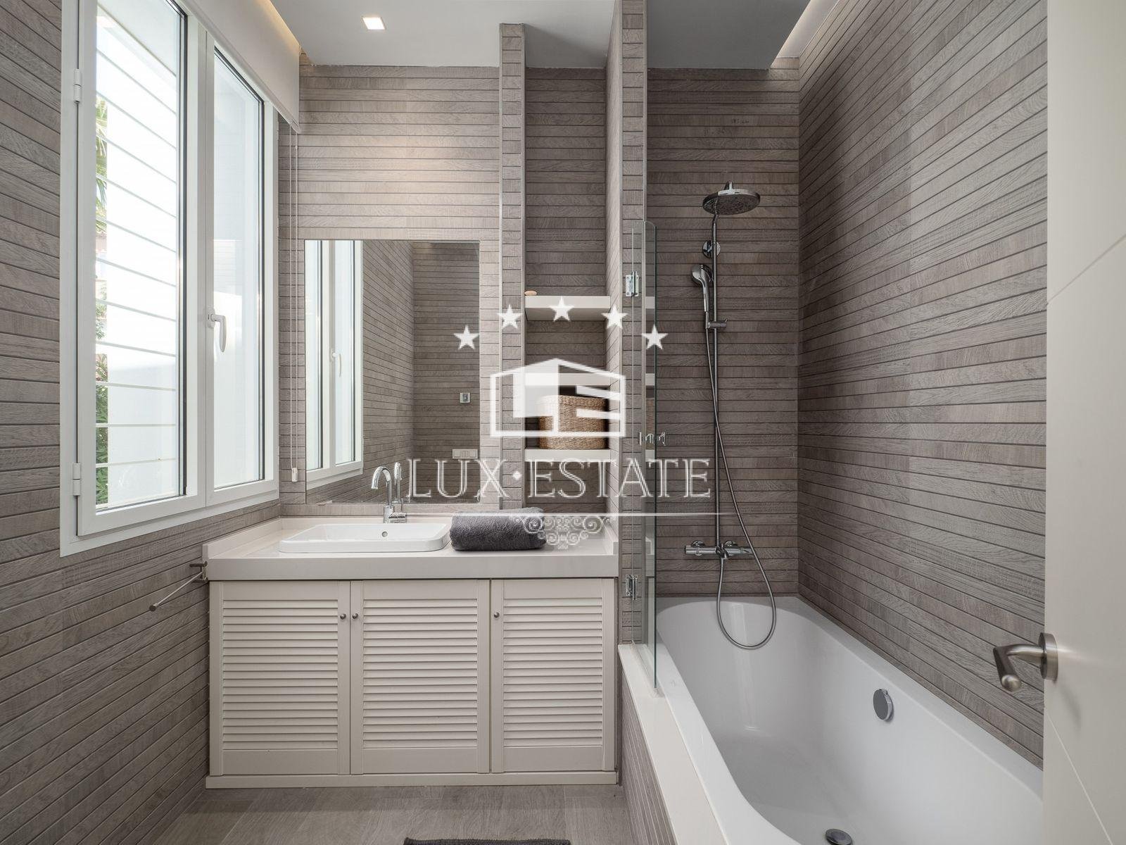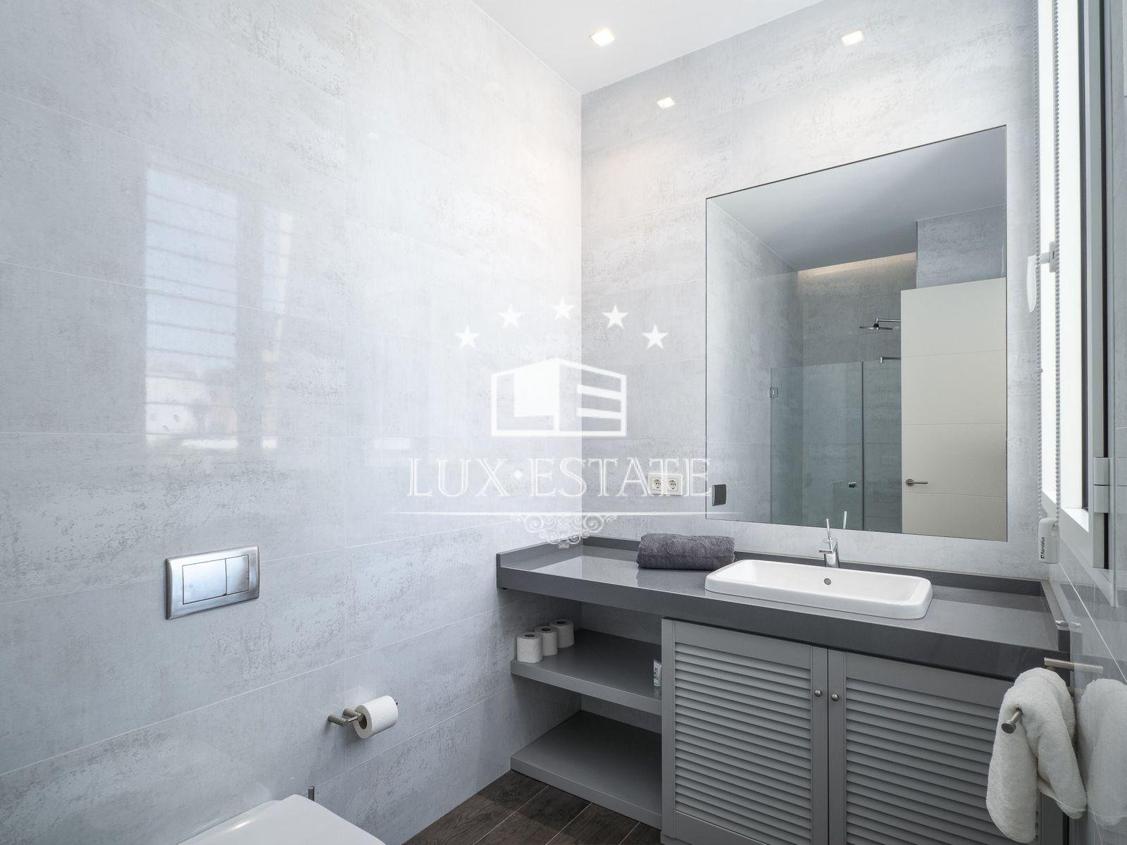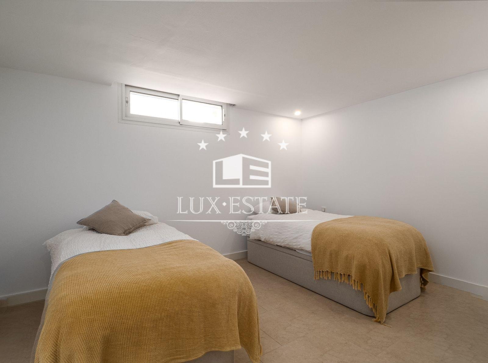 A spacious primary en-suite bedroom with a private terrace, dressing room, and a large bathroom make up most of the upper floor of the house. Additionally, there is a compact home office on this level.