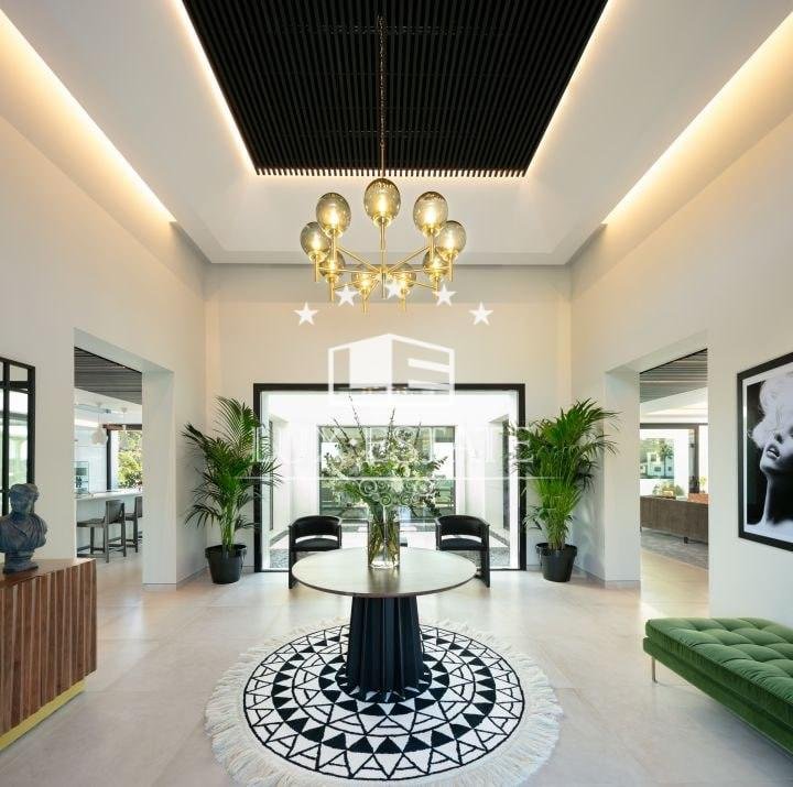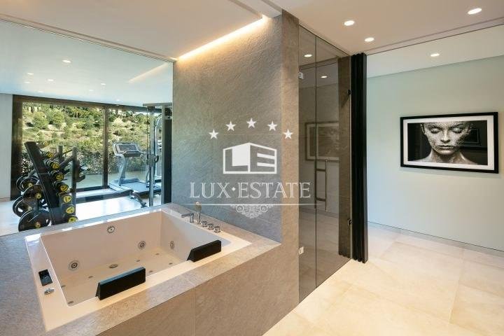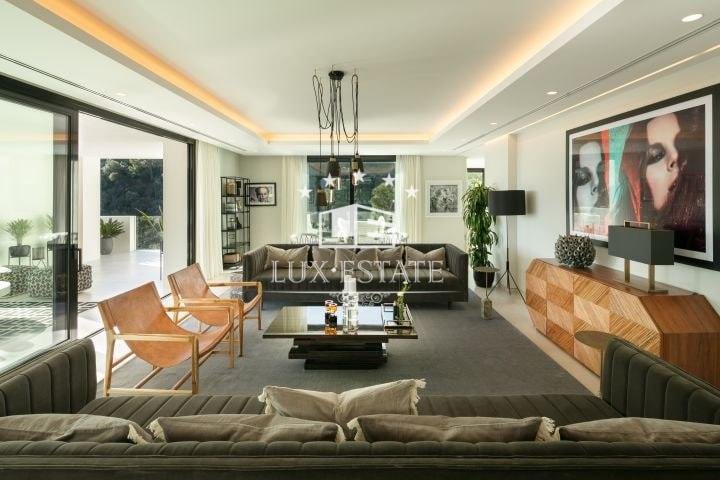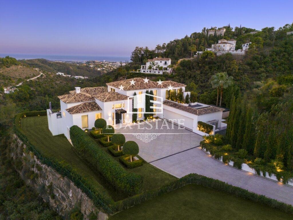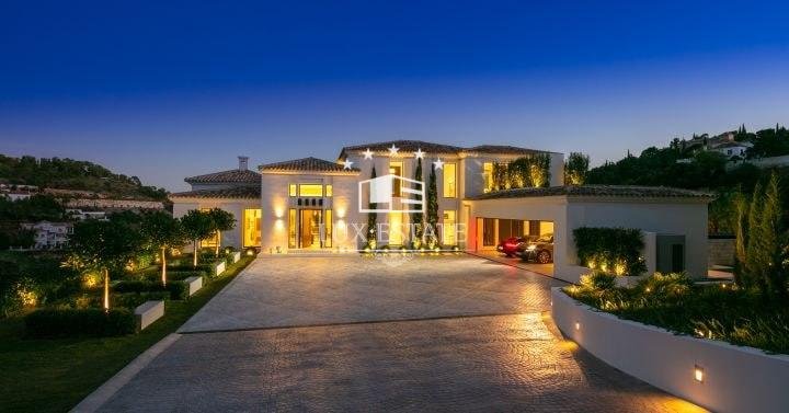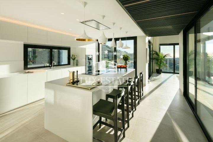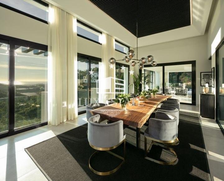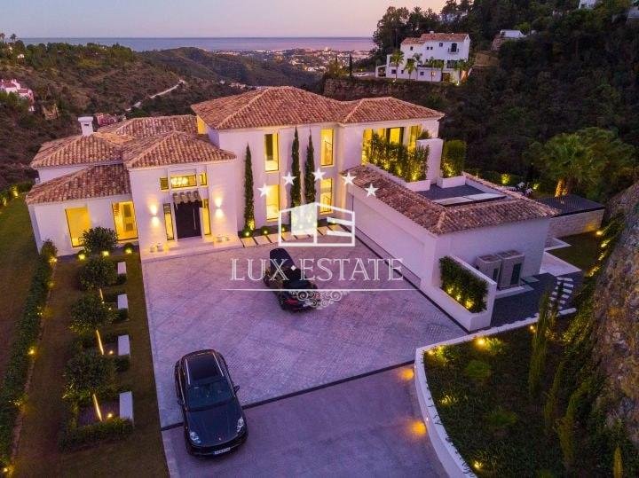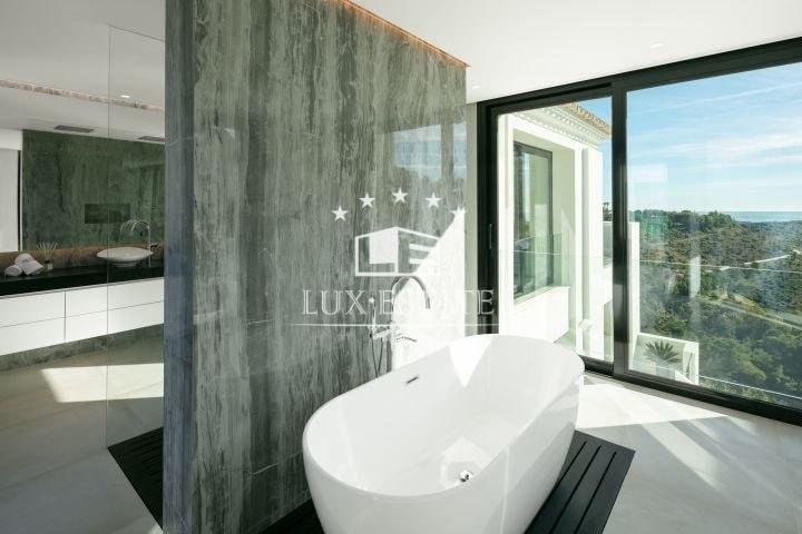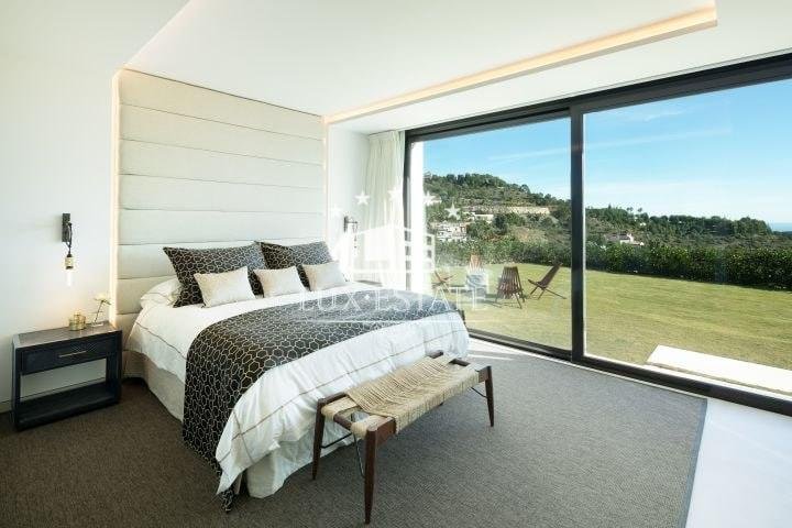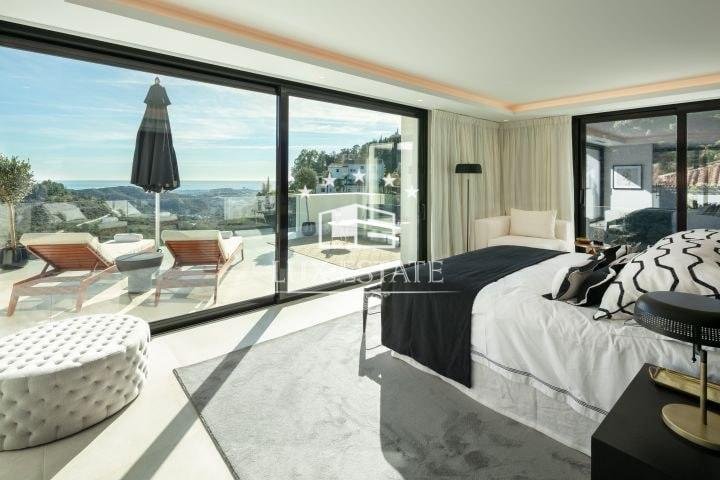 Stunning villa located on the cozy hillside of El Madroñal. The villa benefits from its elevated position and offers incredible ocean views. The ground floor features a large entrance hall, two spacious living areas, a breathtaking dining room, and a stunning contemporary kitchen. Downstairs, there are three generously sized bedrooms, a gym, laundry room, and spa. All bedrooms boast breathtaking ocean views, floor to ceiling windows, direct access to the garden, and an en-suite bathroom. The first floor features a stunning master suite that includes a spacious walk-in closet, a private terrace with picturesque views, and a luxurious master bathroom.