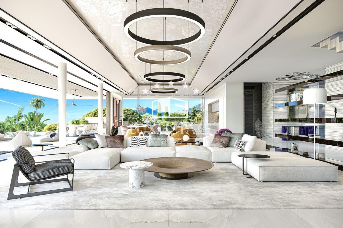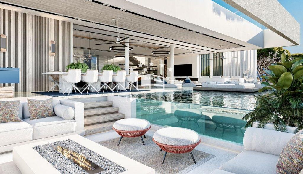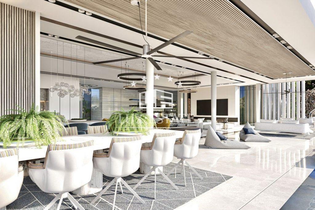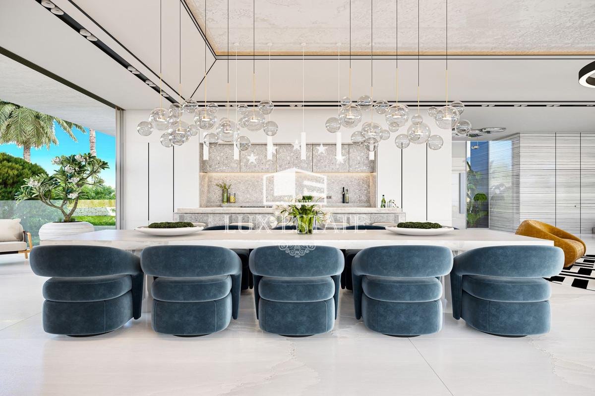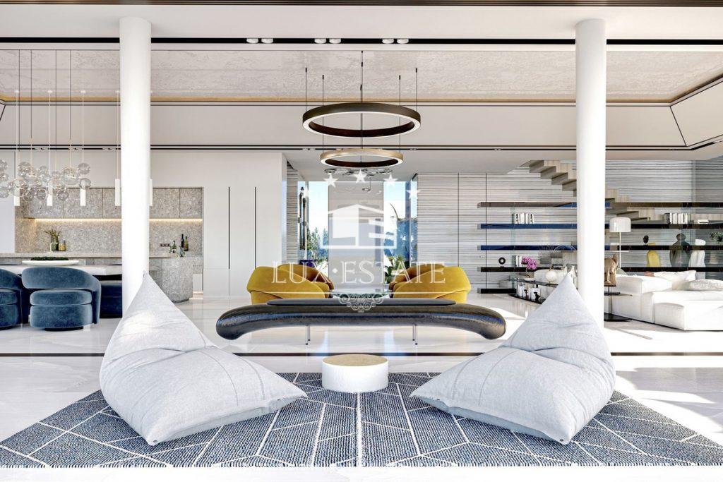 This sublime villa, with its clean lines and simplicity represents timeless modernity, and the resulting home can blend seamlessly into a classic Mediterranean seascape. Inspired by the azure and white themes of the hip island of Ibiza, the villa appears to be floating, with the exterior lounge-chillout area surrounded by the shimmering limpid waters of the turquoise pool. Generous in proportions with almost 1100 m2 of living space over 3 floors including beautiful terraces that seamlessly blend the interior and exterior areas for your ideal enjoyment of a modern Mediterranean lifestyle.