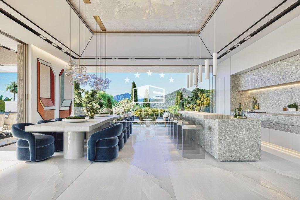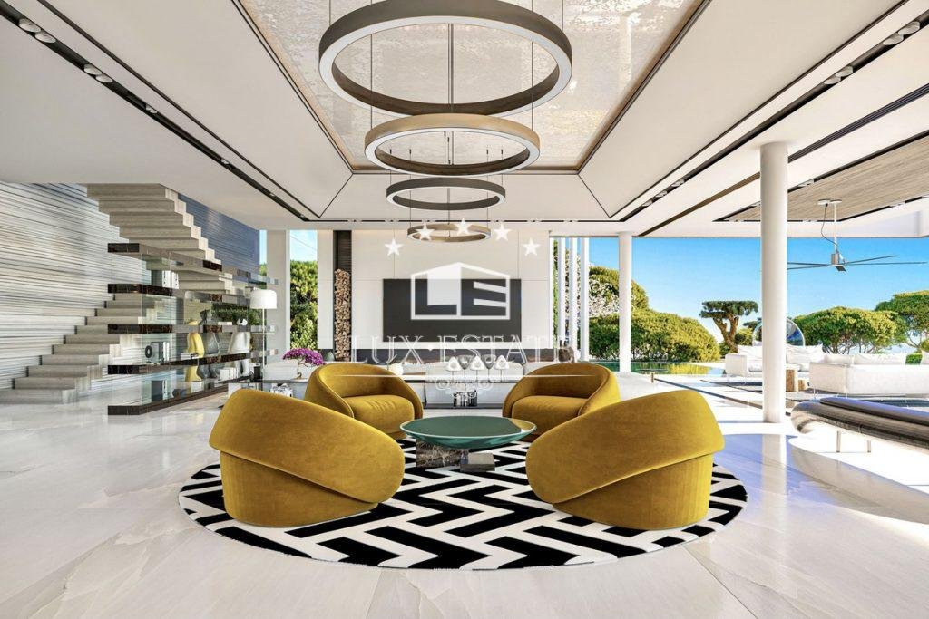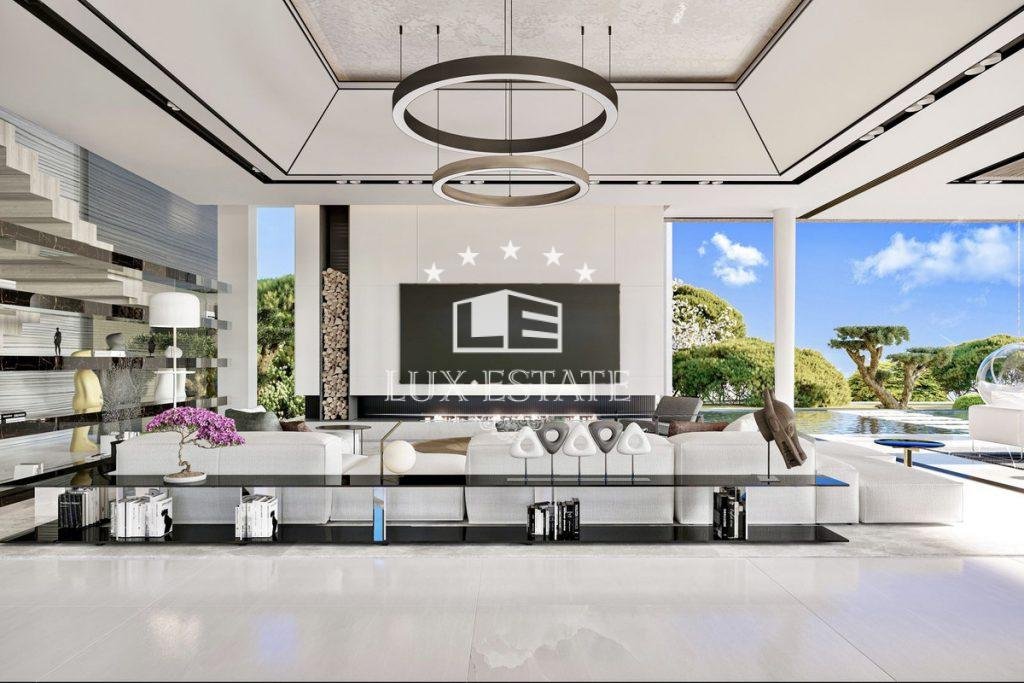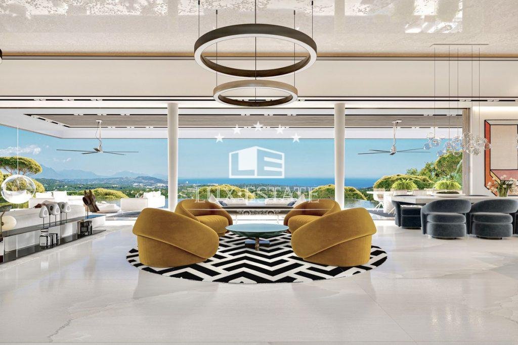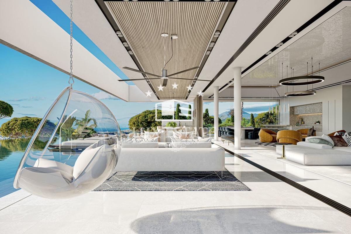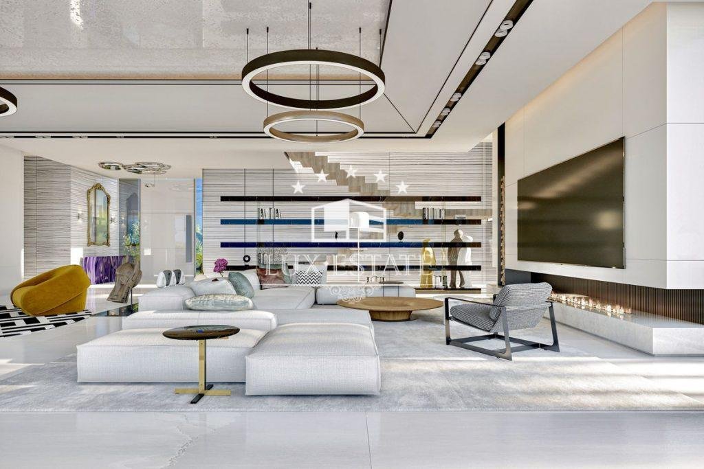 This sublime villa, with its clean lines and simplicity represents timeless modernity, and the resulting home can blend seamlessly into a classic Mediterranean seascape. Inspired by the azure and white themes of the hip island of Ibiza, the villa appears to be floating, with the exterior lounge-chillout area surrounded by the shimmering limpid waters of the turquoise pool. Generous in proportions with almost 1100 m2 of living space over 3 floors including beautiful terraces that seamlessly blend the interior and exterior areas for your ideal enjoyment of a modern Mediterranean lifestyle.