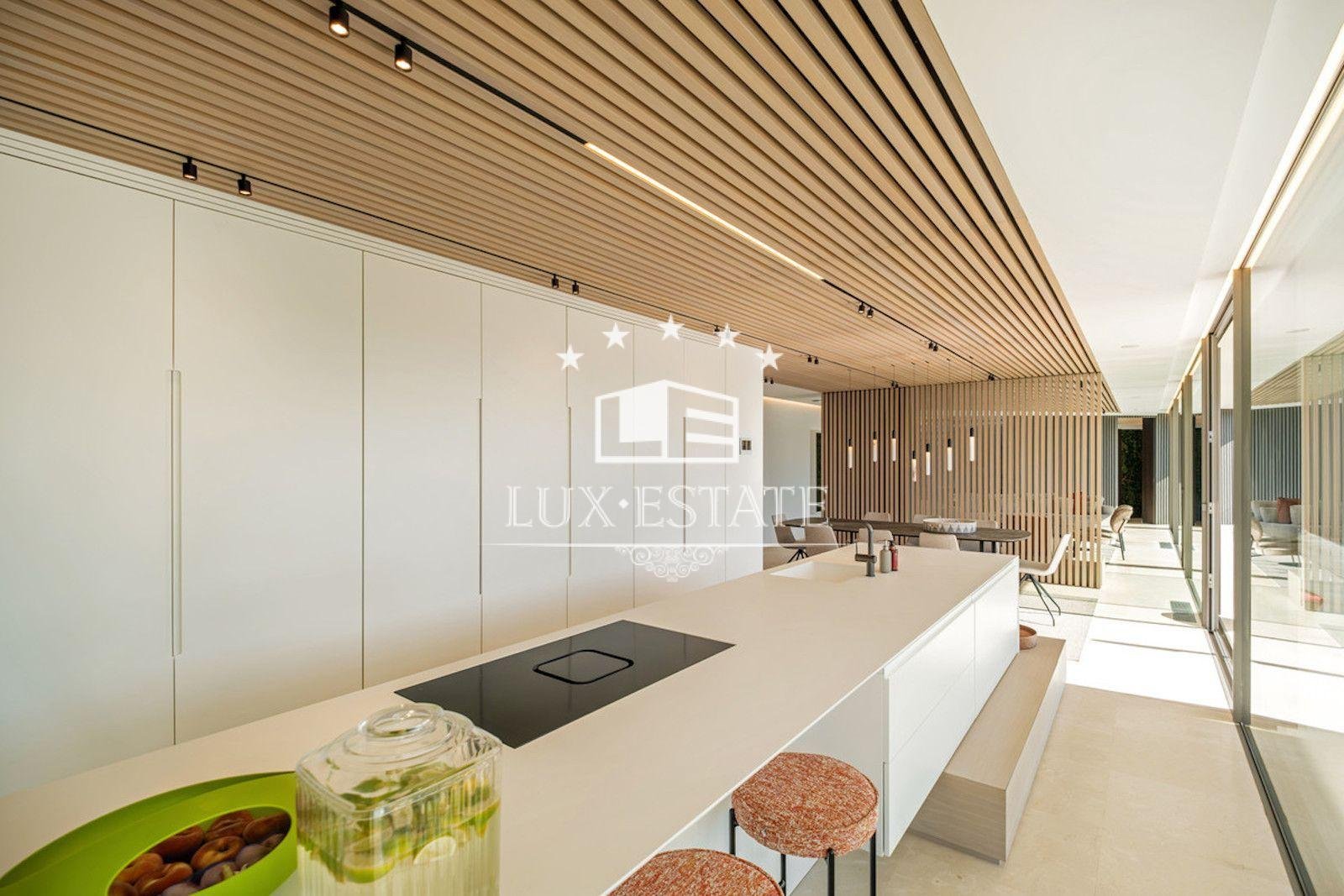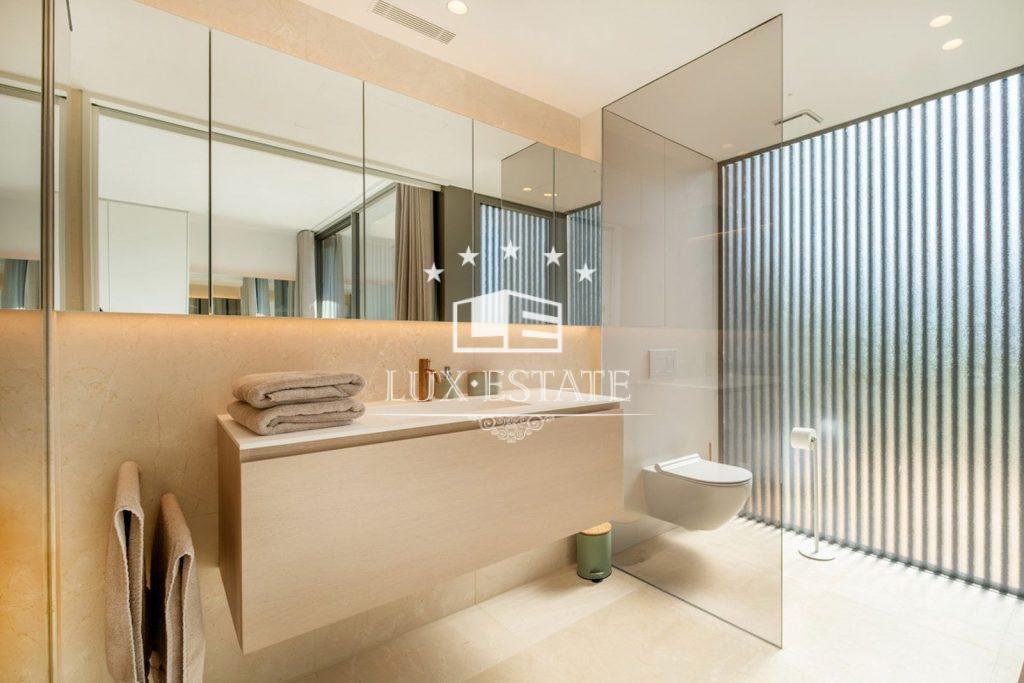 Upon entering the villa, you are greeted by an elegant interior that combines a modern, yet warm and charming aesthetic. Sunlight streams in through the large windows giving you a strong and ethereal feel, illuminating the tastefully decorated living spaces. The open plan living and dining area is adorned with high quality finishes and designer furniture, creating an inviting space to gather and relax with family or friends.