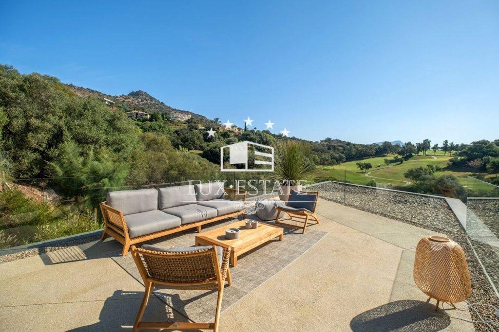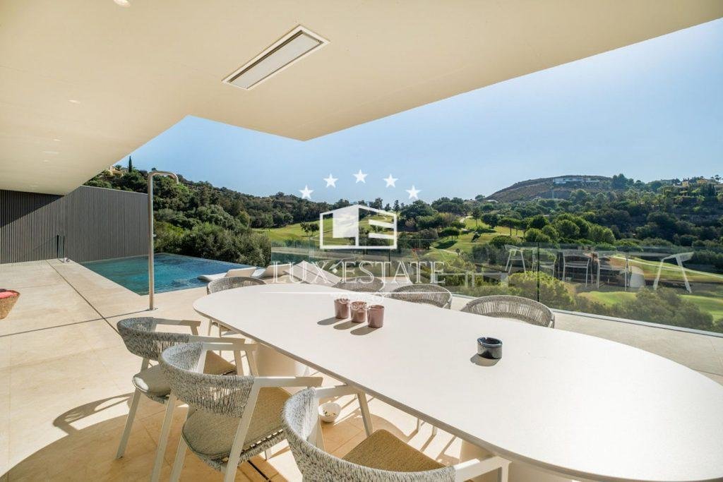 As you approach the villa, its impressive facade hints at the splendor of the interior. At the front of the villa itself is a meticulously designed infinity pool, which seems to be built into the golf course, offering breathtaking views of lush fields and distant beautiful mountains. The superb pool is complemented by a spacious outdoor terrace, perfect for al fresco dining and relaxing in the beautiful sunshine.