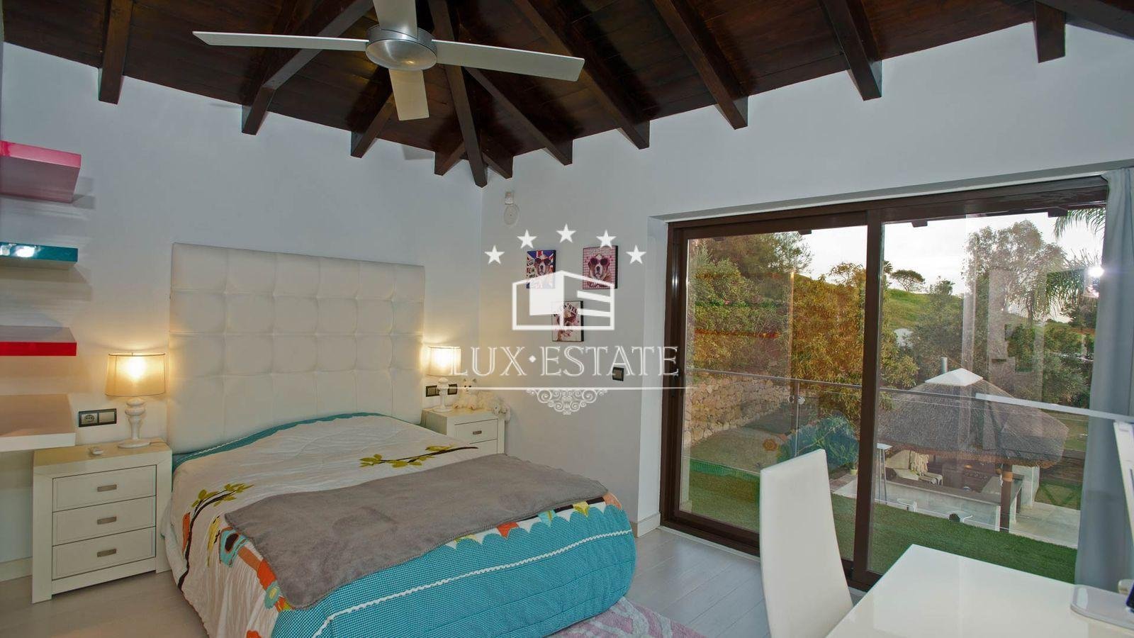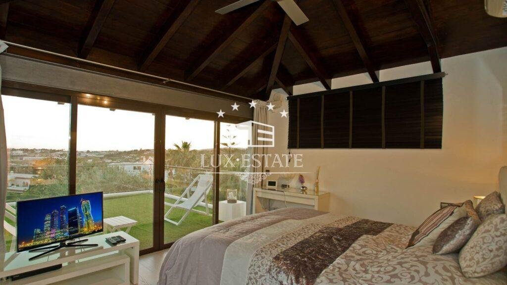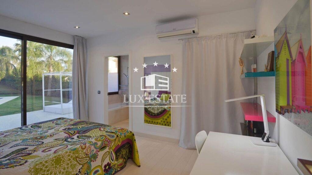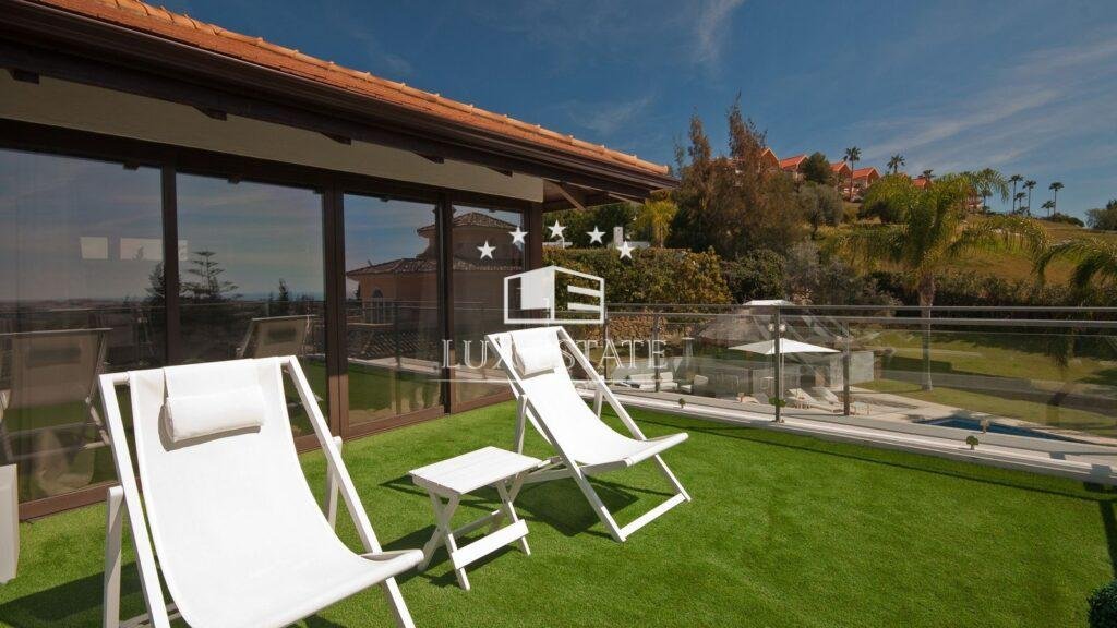 The first floor boasts a master en suite bedroom with a private terrace and seating area, perfect for enjoying breathtaking sea views, along with another en suite bedroom overlooking the lush garden and golf course.