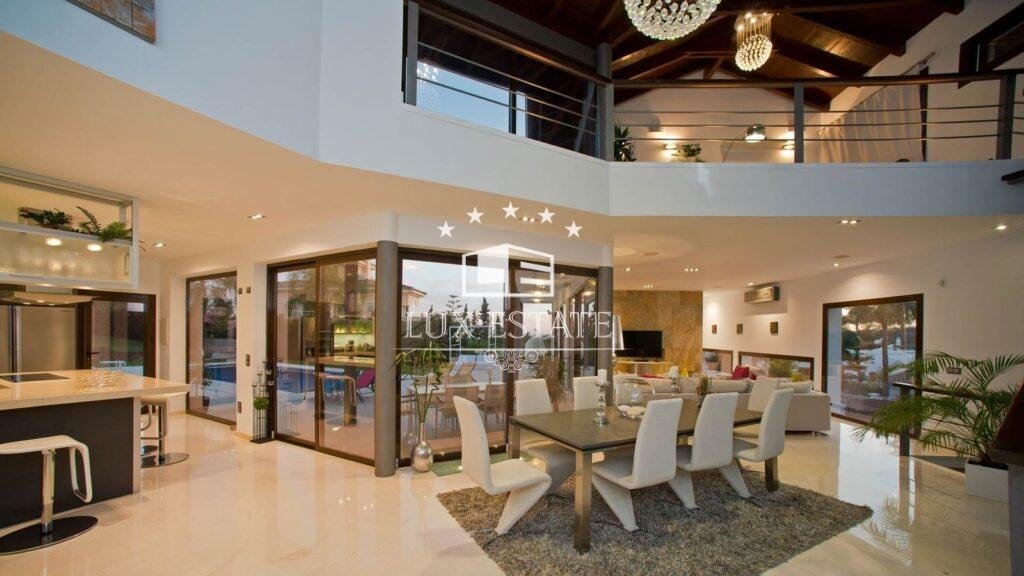 Discover a stunning contemporary villa designed for luxurious entertaining, featuring an expansive open-plan layout with a double-height dining room and lounge. The ground floor seamlessly connects to a well-appointed modern kitchen with a breakfast bar and includes one of the five spacious en suite bedrooms.