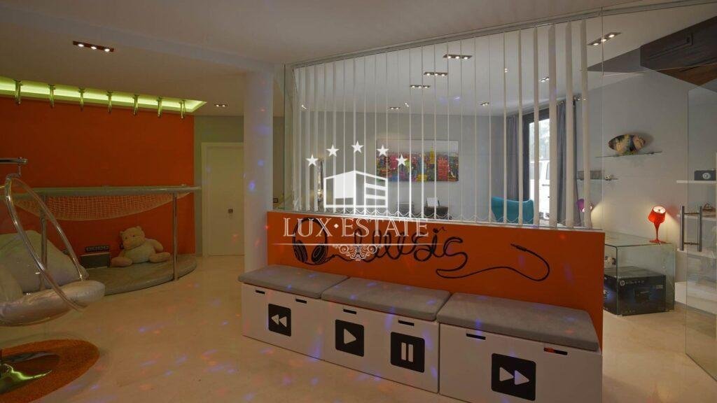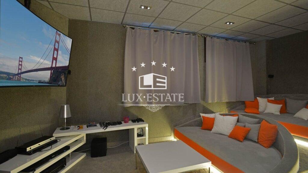 The naturally lit lower ground floor offers two additional en suite bedrooms, one with direct garden access, a cozy lounge, a children’s play area, a state-of-the-art cinema room with surround sound, and a two-car garage.