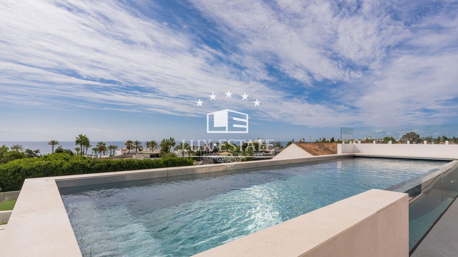 Here’s an opportunity to own a stunning modern villa boasting captivating sea views, ideally situated on the prestigious Golden Mile, a mere 300 meters from Marbella’s finest beaches. This fully furnished villa, constructed in 2023, epitomizes contemporary luxury across its four floors.