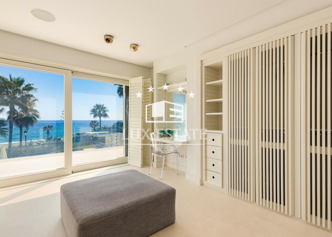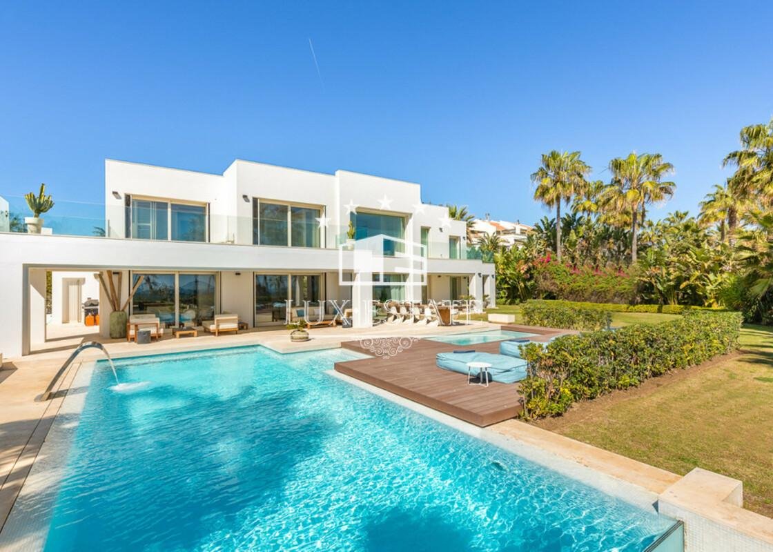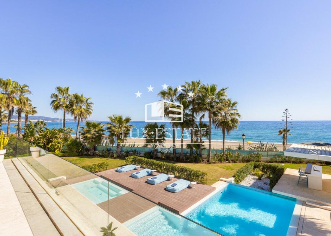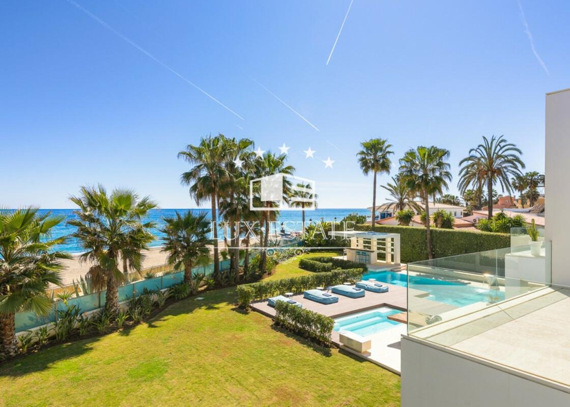 Exceptional contemporary style villa with south orientation, located on the beachfront on the Golden Mile, the most exclusive area of Marbella, a short walk from the famous marina of Puerto Banús, Marbella and all services. Recently built with the best qualities, this unique property is distributed on 3 levels and has 6 bedrooms and 8,5 bathrooms. Entry level: living room and dining room are united offering a large area that extends to the open kitchen and the garden, with magnificent views of the sea; 2 bedrooms en suite and guest toilet. First floor: large en-suite master bedroom with dressing room and 3 further en-suite bedrooms. Basement: laundry, machine room, bar, cinema room, sauna, gym and en-suite guest bedroom that can be used as service accommodation. Garden with heated pool, fountain and bar with great privacy thanks to the glazing that allows you to see from the inside without being seen from the outside. Other characteristics: underfloor heating throughout the house; hot / cold central air conditioning; double-glazed windows; double height ceilings; aluminum shutters in the bedrooms. A unique property that deserves your full attention!