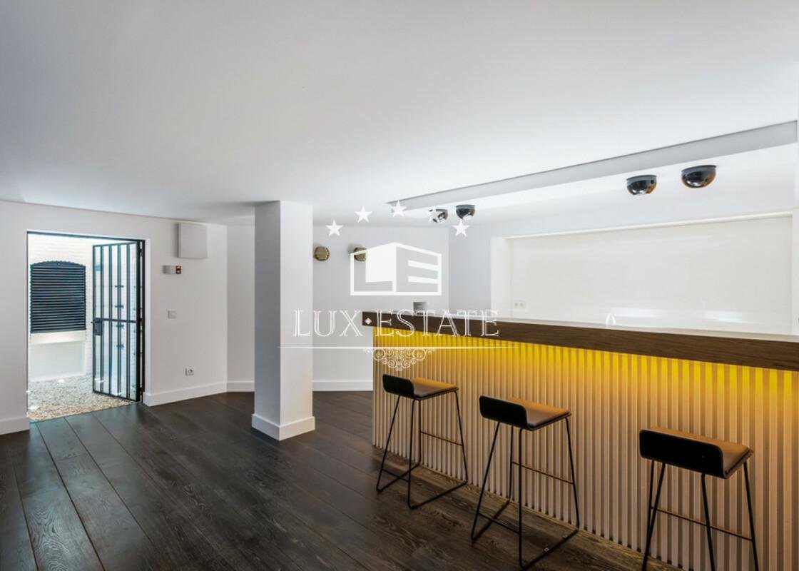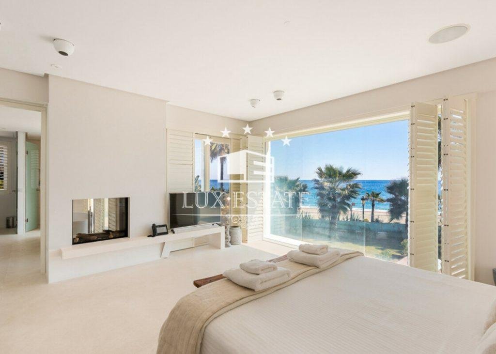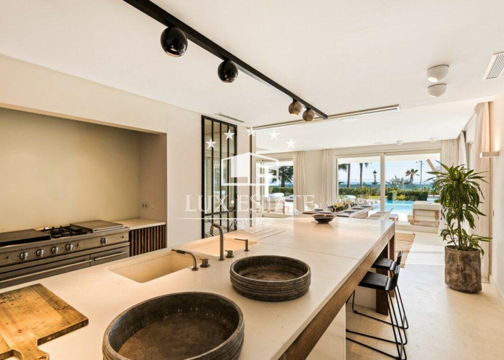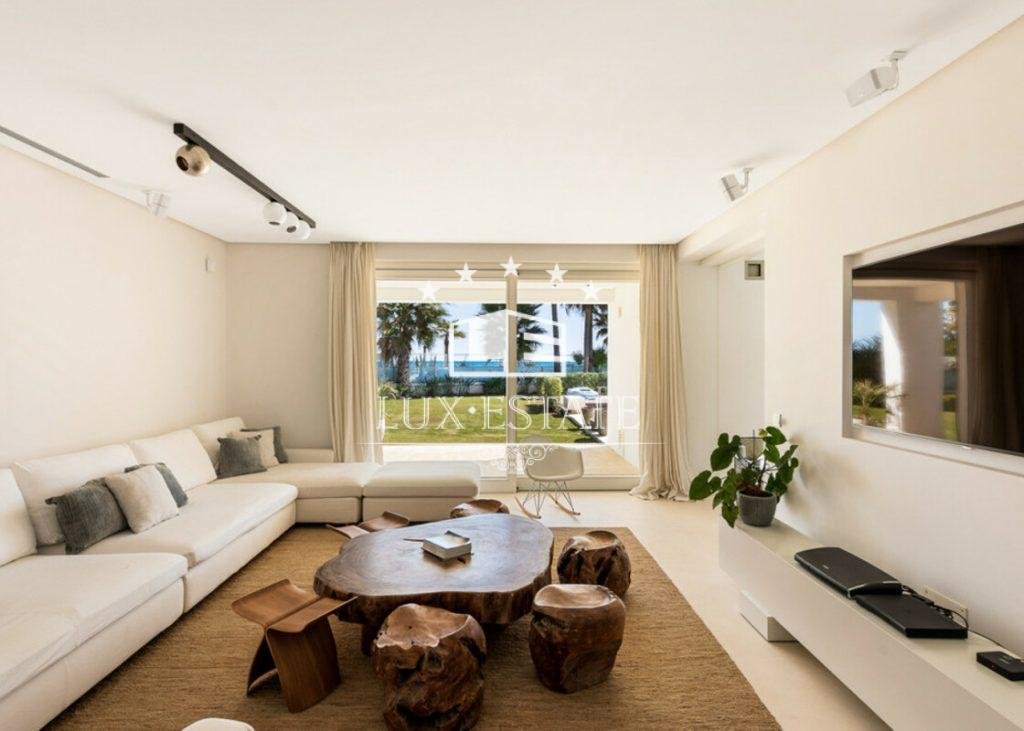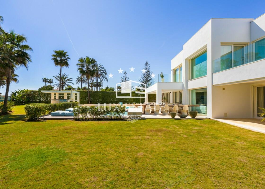 Exceptional contemporary style villa with south orientation, located on the beachfront on the Golden Mile, the most exclusive area of Marbella, a short walk from the famous marina of Puerto Banús, Marbella and all services. Recently built with the best qualities, this unique property is distributed on 3 levels and has 6 bedrooms and 8,5 bathrooms. Entry level: living room and dining room are united offering a large area that extends to the open kitchen and the garden, with magnificent views of the sea; 2 bedrooms en suite and guest toilet. First floor: large en-suite master bedroom with dressing room and 3 further en-suite bedrooms. Basement: laundry, machine room, bar, cinema room, sauna, gym and en-suite guest bedroom that can be used as service accommodation. Garden with heated pool, fountain and bar with great privacy thanks to the glazing that allows you to see from the inside without being seen from the outside. Other characteristics: underfloor heating throughout the house; hot / cold central air conditioning; double-glazed windows; double height ceilings; aluminum shutters in the bedrooms. A unique property that deserves your full attention!