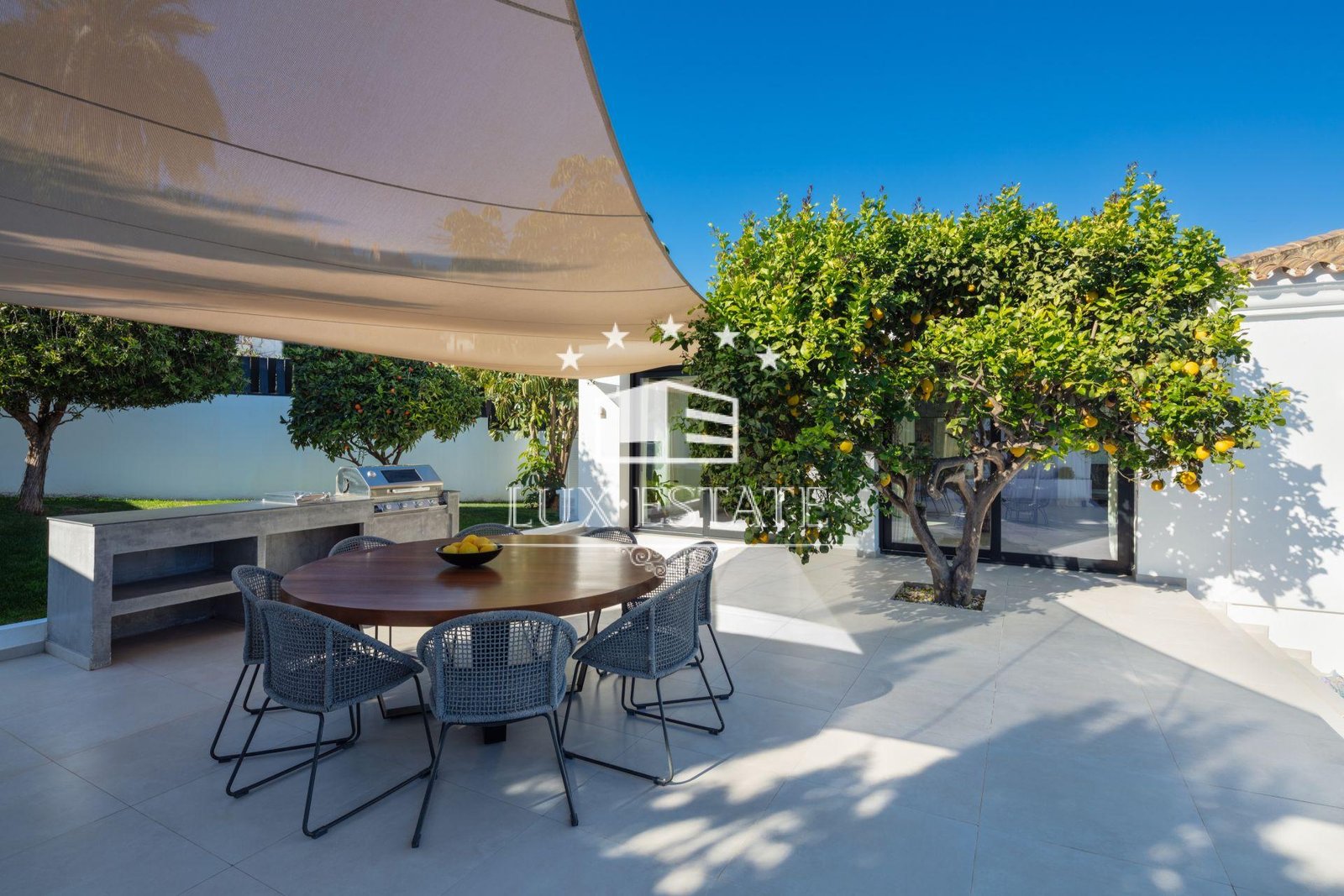 The villa enjoys an outdoor chill-out area with outdoor BBQ. The exteriors are surrounded by a mature fruit trees, making the outdoors a true Mediterranean bliss.