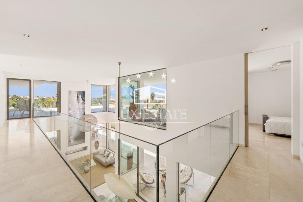 On the upper level, a serene gallery-style corridor overlooks the main living space, leading to beautifully appointed bedrooms that enjoy sweeping views and private terraces, offering peaceful retreats bathed in natural light.