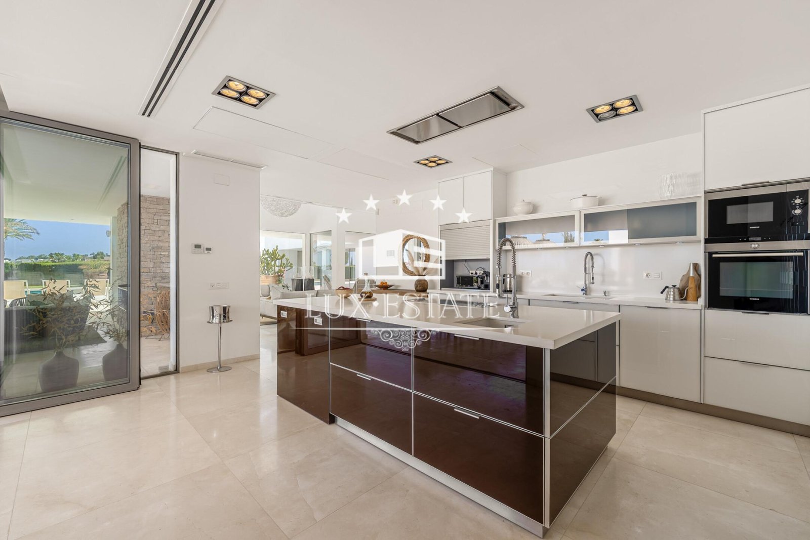 At the heart of the home lies a sleek, contemporary kitchen fitted with premium appliances, minimalist cabinetry and a striking glass-framed dining area with floor-to-ceiling windows. Outdoor living is equally impressive, featuring a spectacular swimming pool with integrated jacuzzi, Balinese-style sun loungers, and a covered dining terrace complete with fireplace and barbecue—perfect for year-round entertaining.