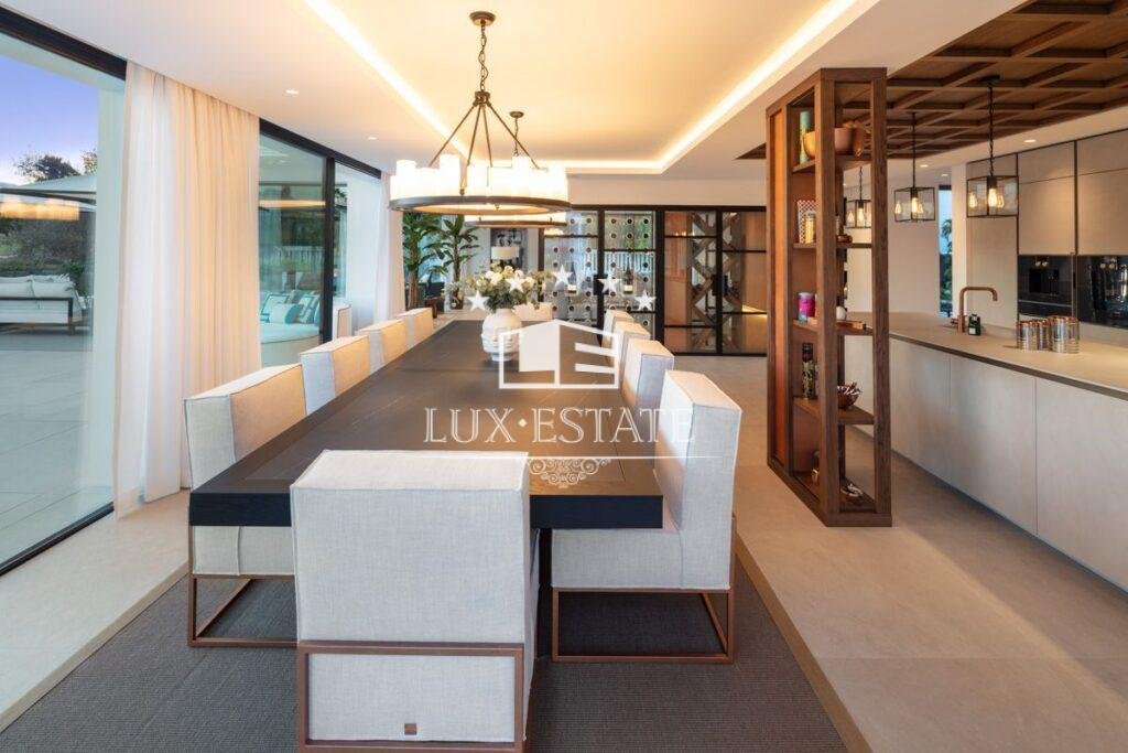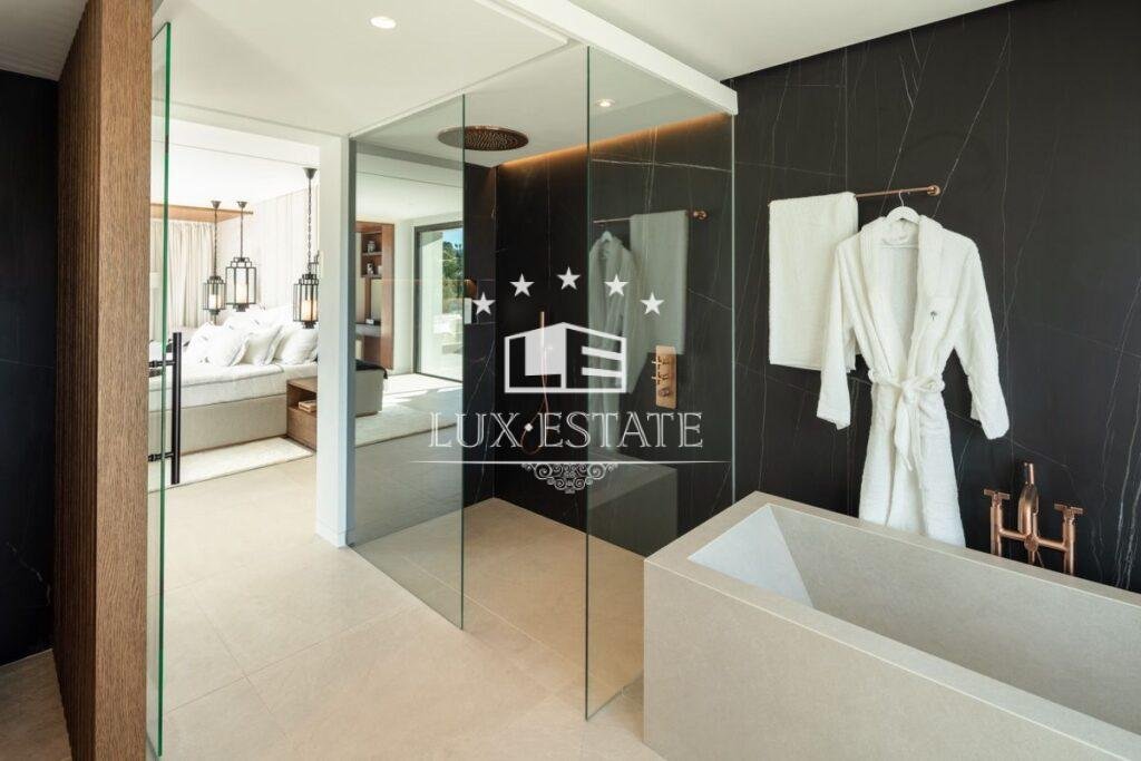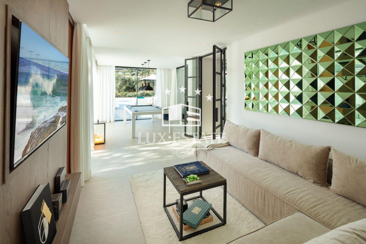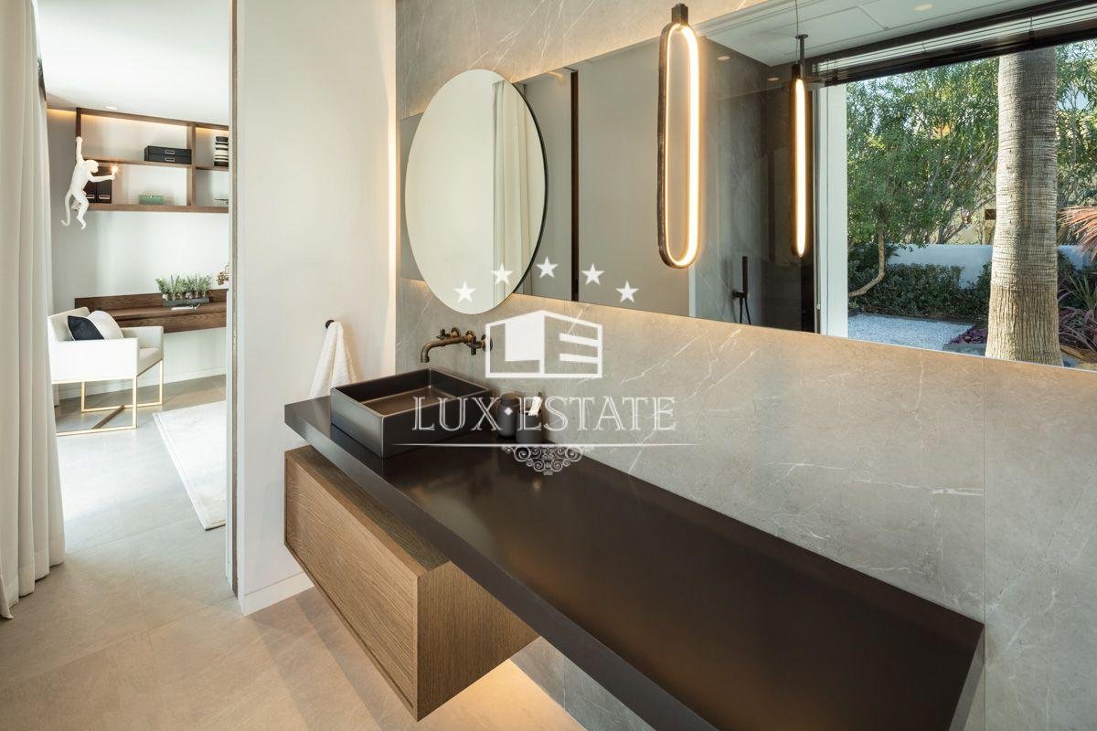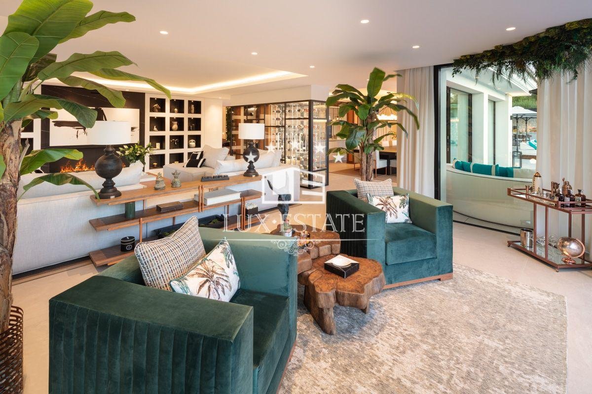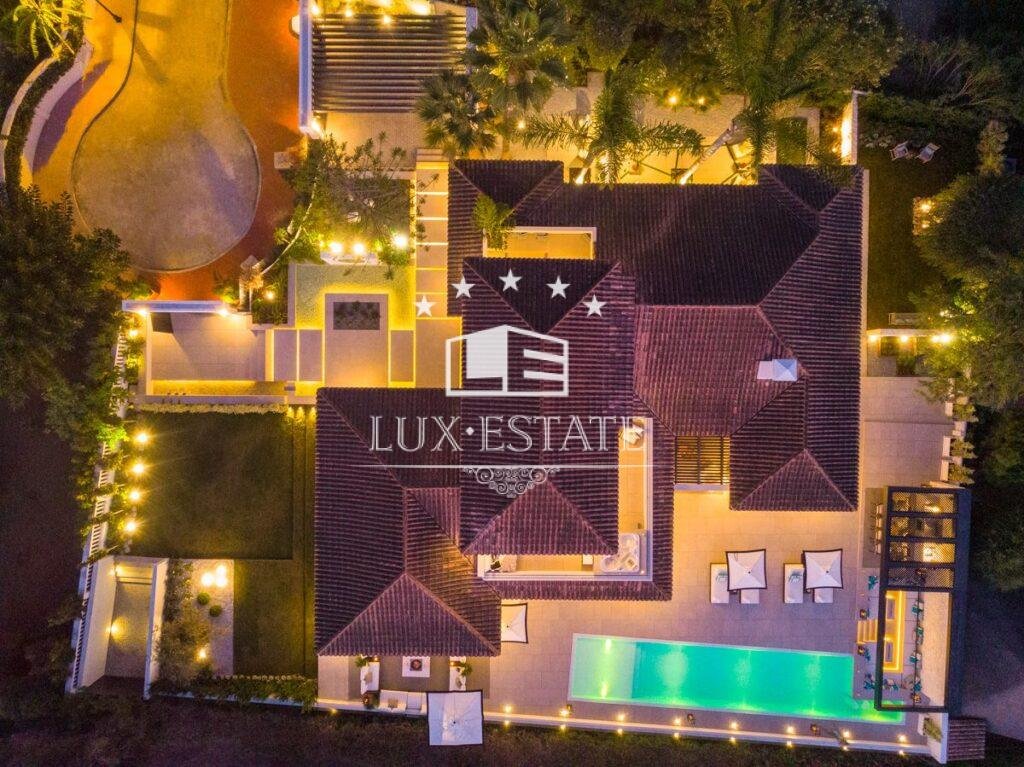 The villa’s outdoor spaces are as impressive as its interiors, featuring lush, landscaped gardens that provide a sense of tranquillity and privacy. The large swimming pool invites you to take a refreshing dip, while the sunken lounge with a fire pit is the perfect spot for evening gatherings. Multiple terraces, both covered and open, ensure you can enjoy the Mediterranean climate year-round.