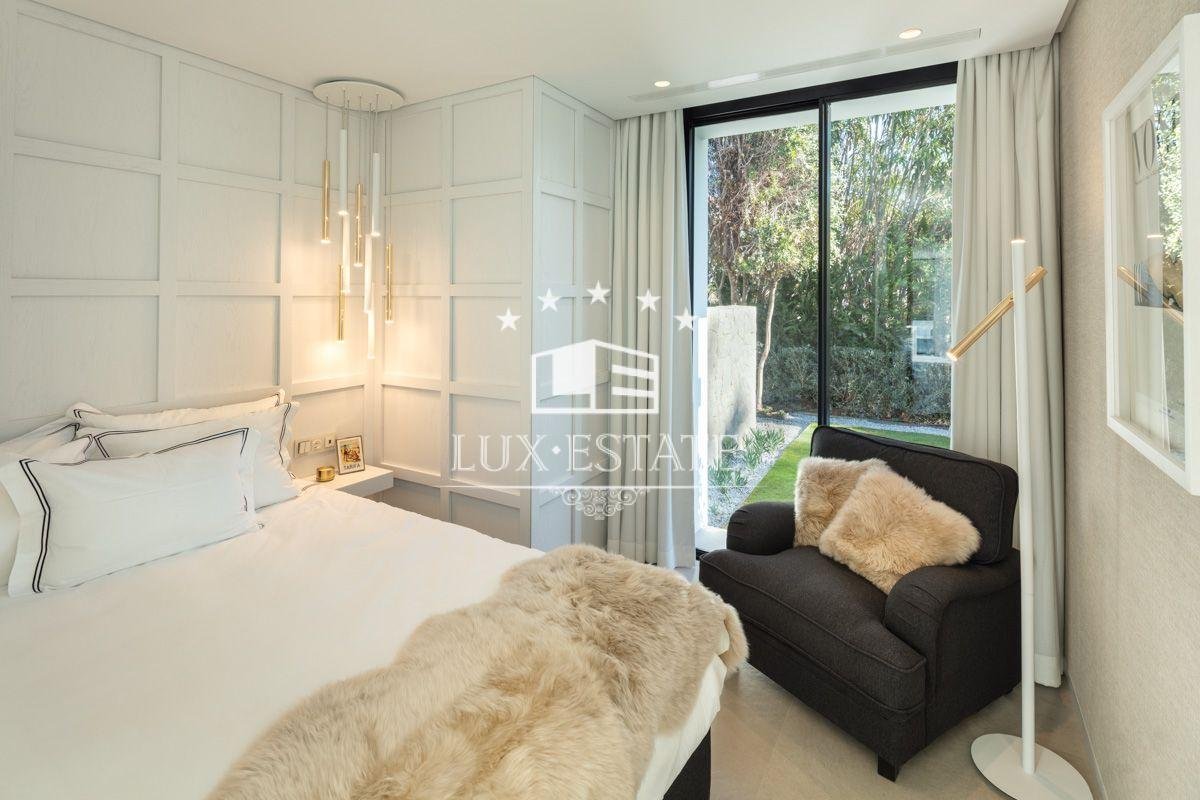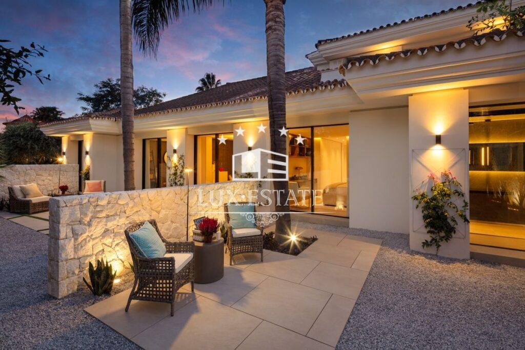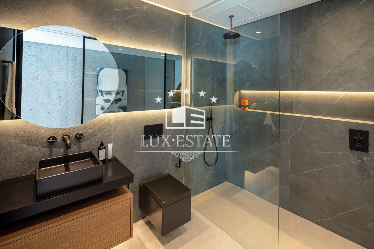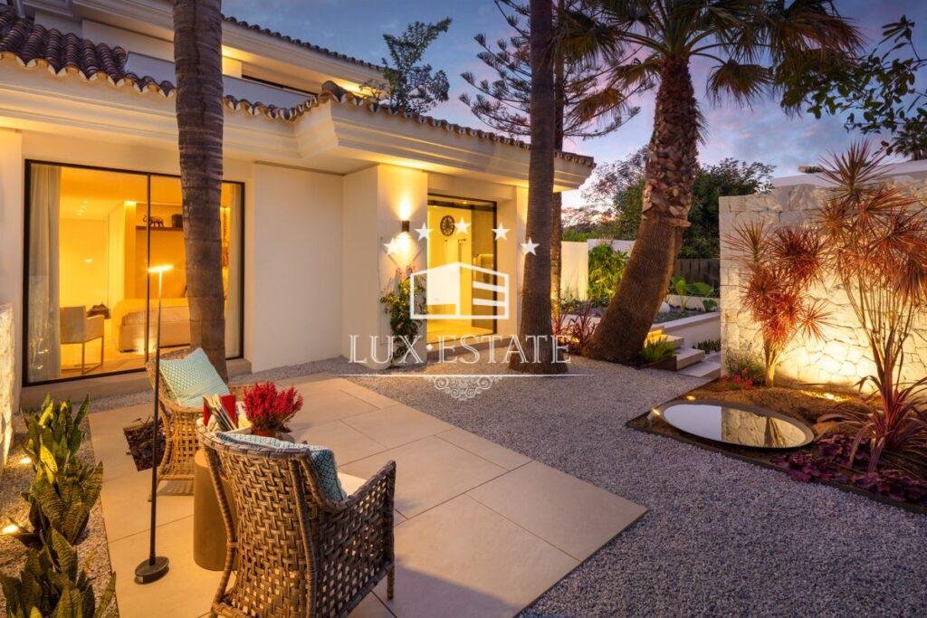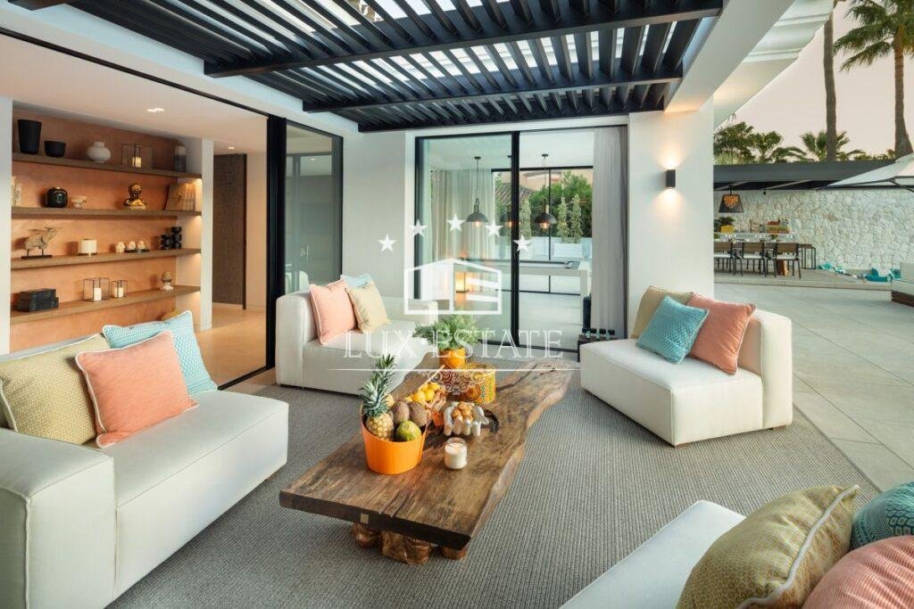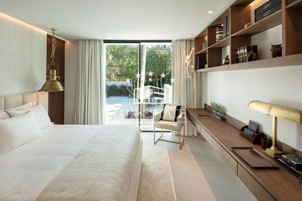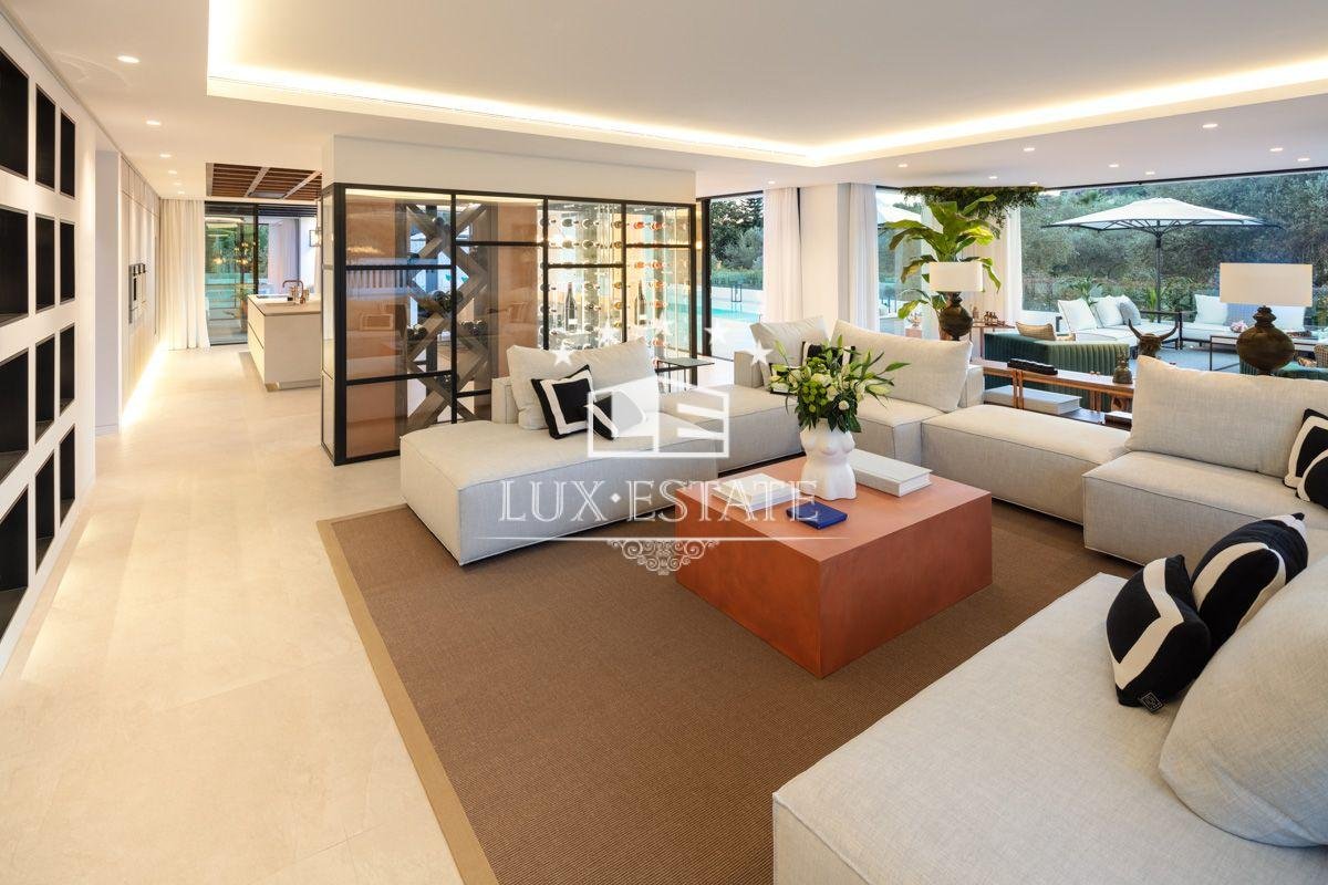 The villa’s outdoor spaces are as impressive as its interiors, featuring lush, landscaped gardens that provide a sense of tranquillity and privacy. The large swimming pool invites you to take a refreshing dip, while the sunken lounge with a fire pit is the perfect spot for evening gatherings. Multiple terraces, both covered and open, ensure you can enjoy the Mediterranean climate year-round.