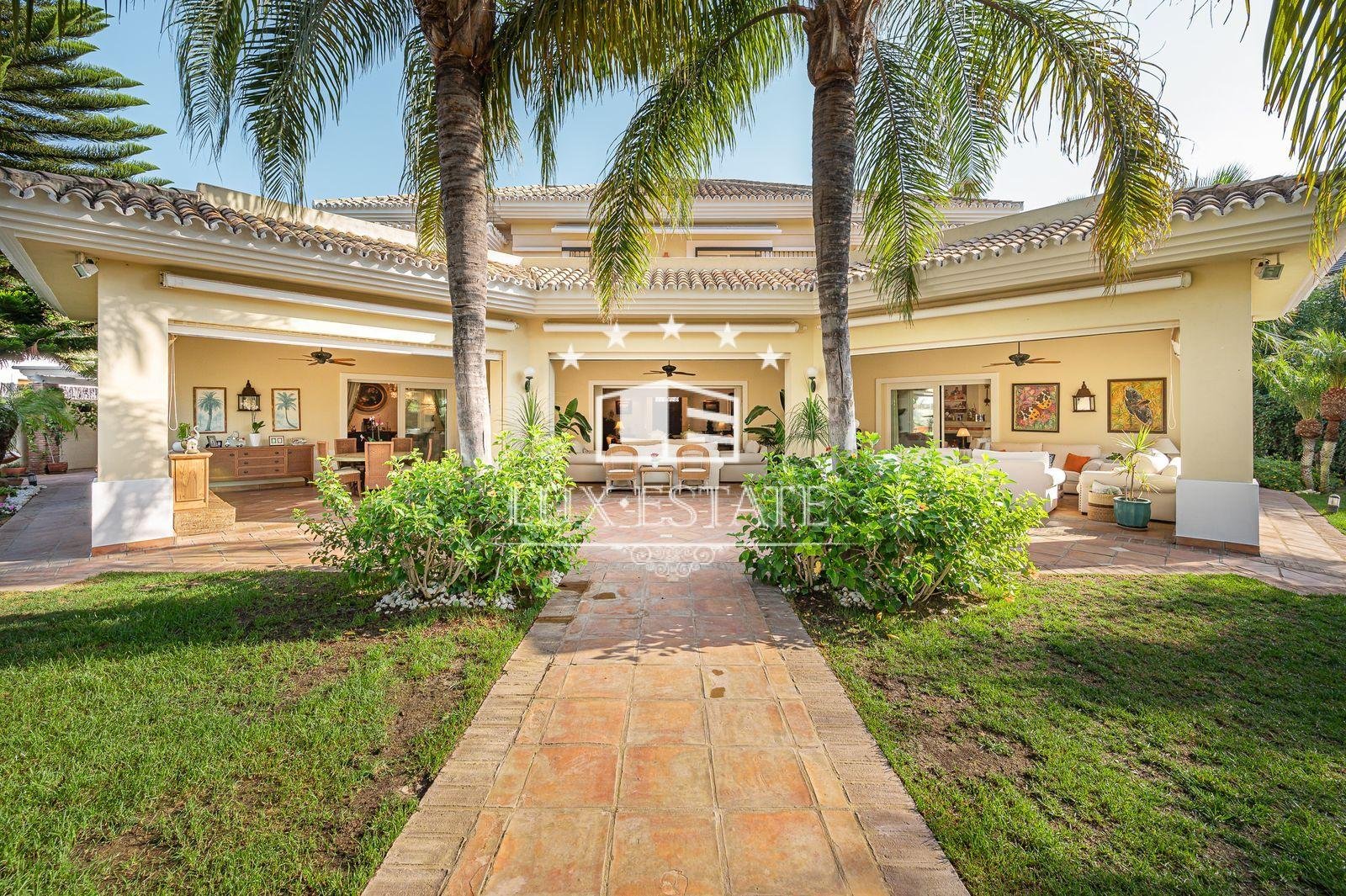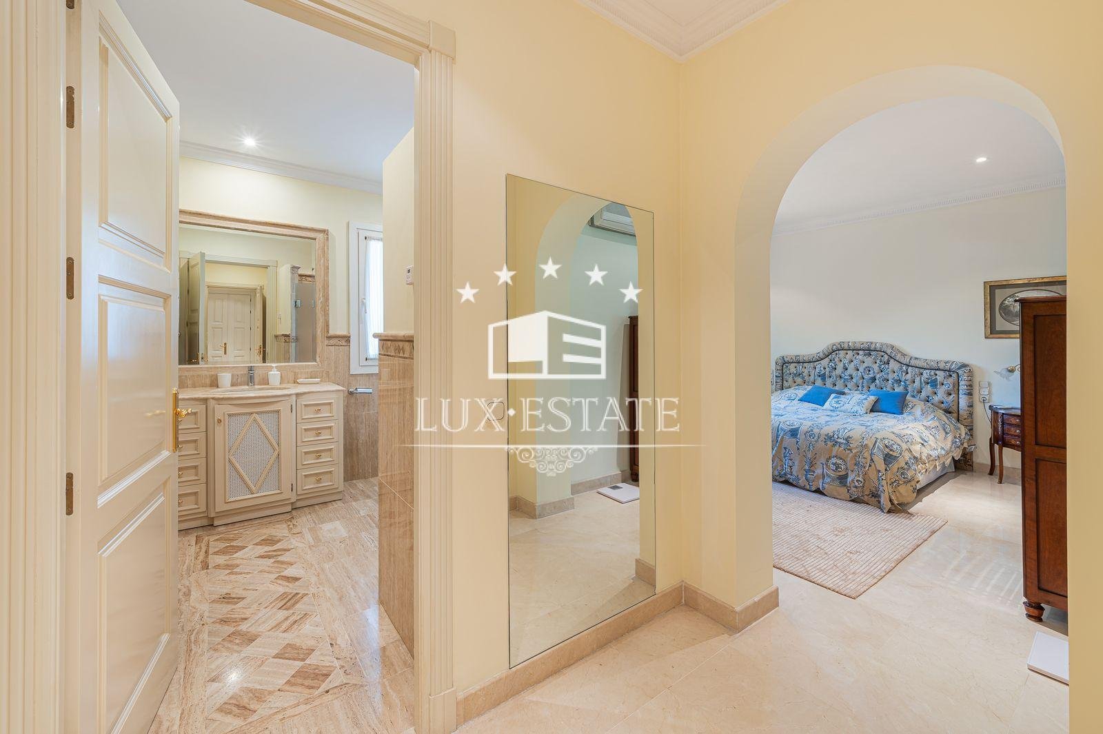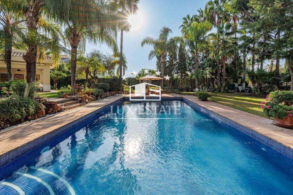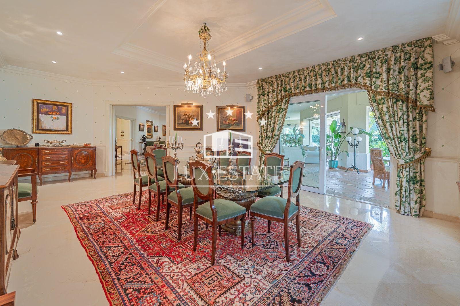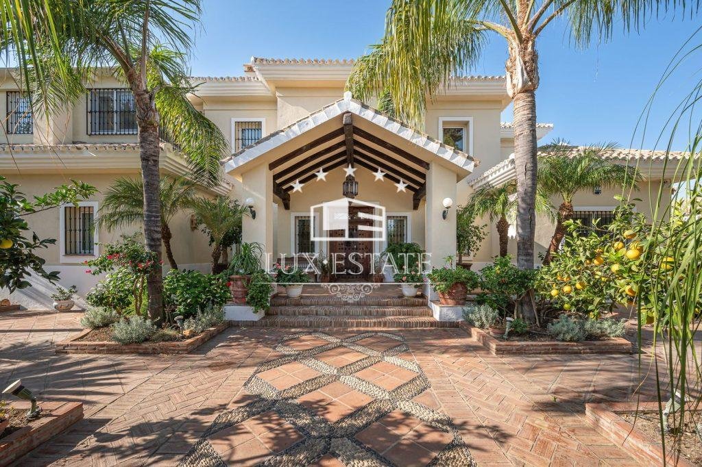 Stunning villa boasting a distinctive classic design in Guadalmina Baja, situated in close proximity to the San Pedro de Alcantara beach. The property comprises 1457m2 spread across three floors on a generous plot measuring 2.047m2.