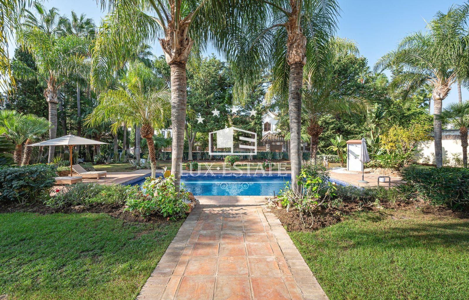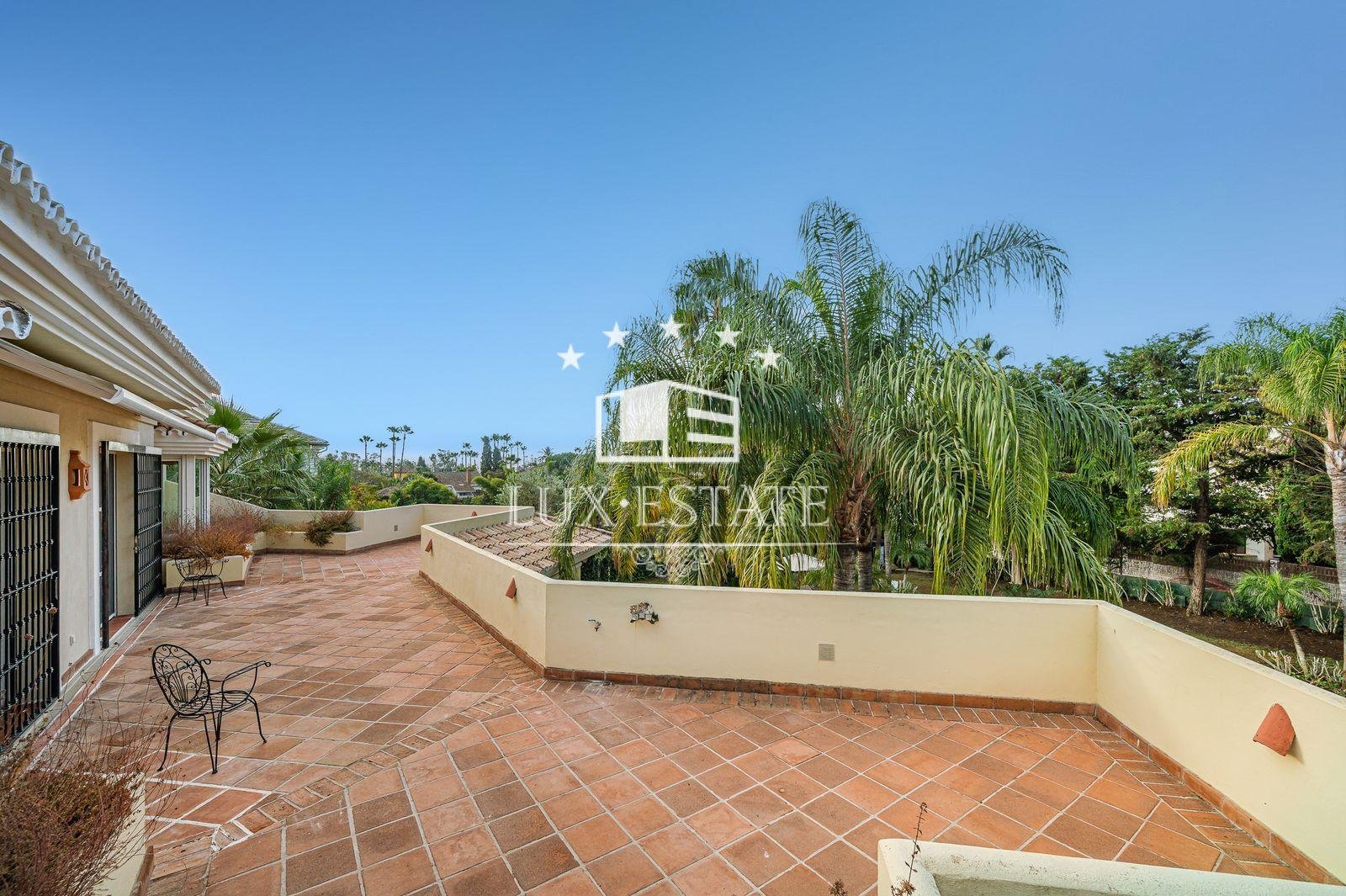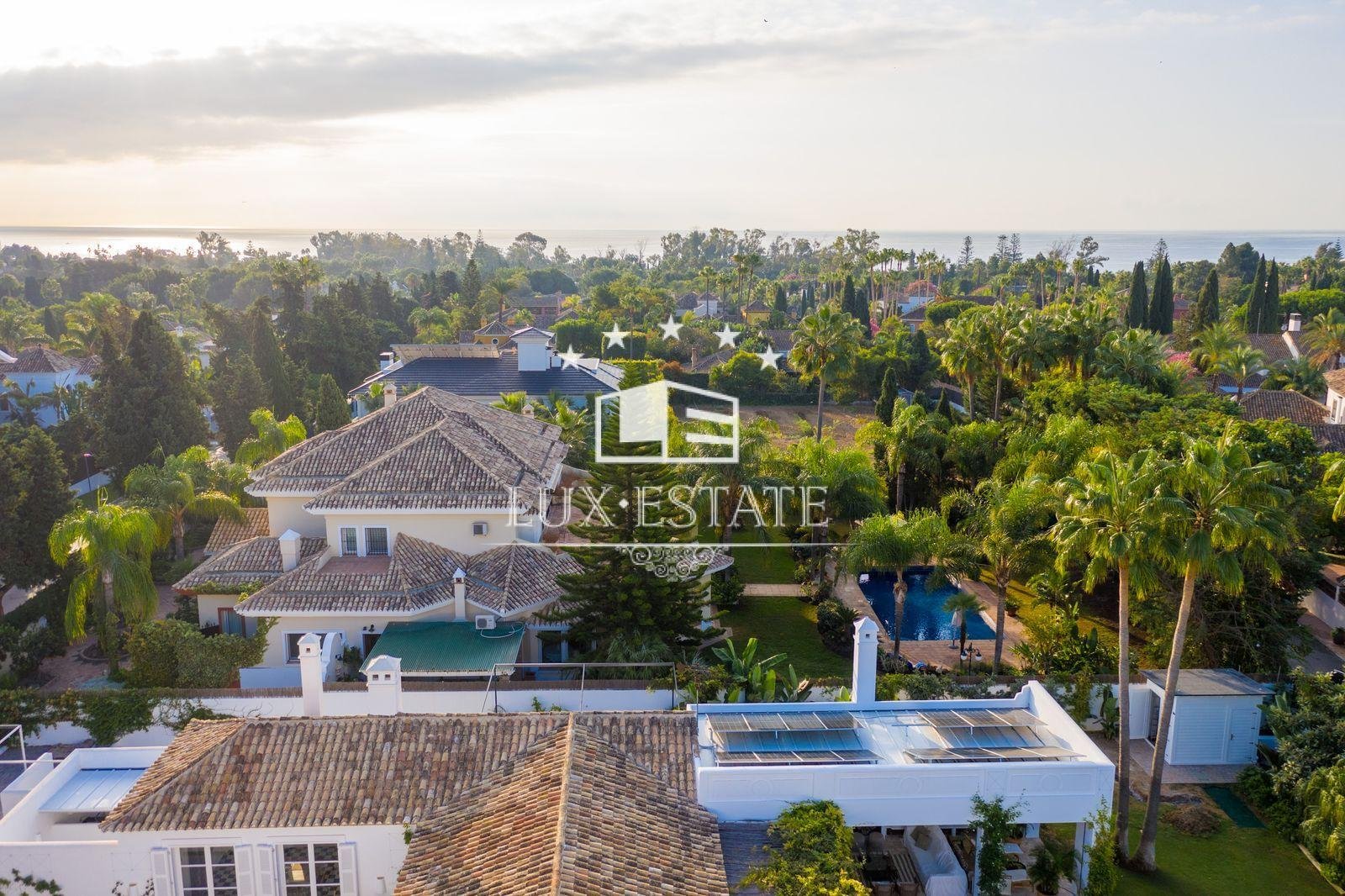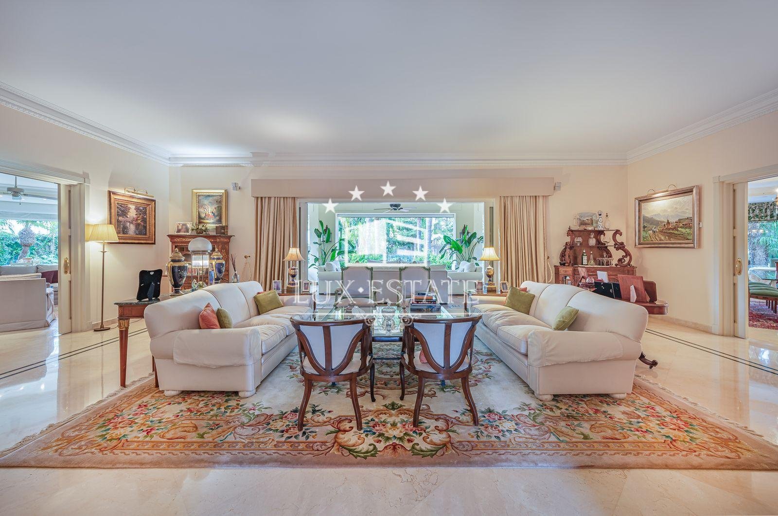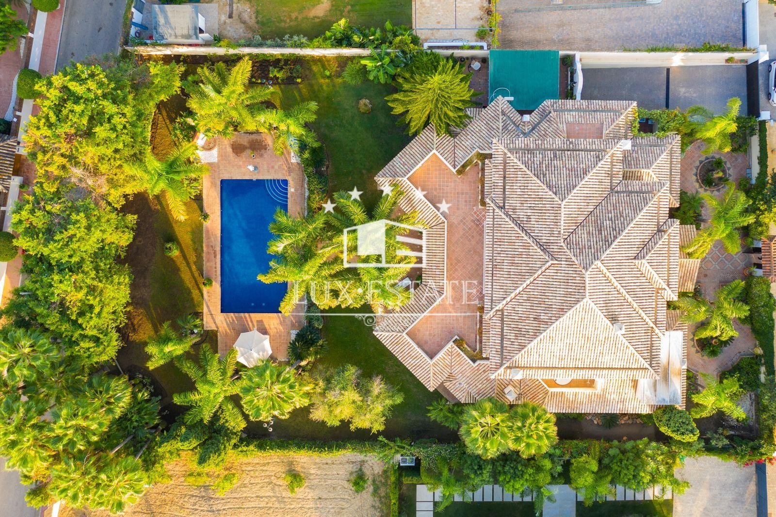 Stunning villa boasting a distinctive classic design in Guadalmina Baja, situated in close proximity to the San Pedro de Alcantara beach. The property comprises 1457m2 spread across three floors on a generous plot measuring 2.047m2.