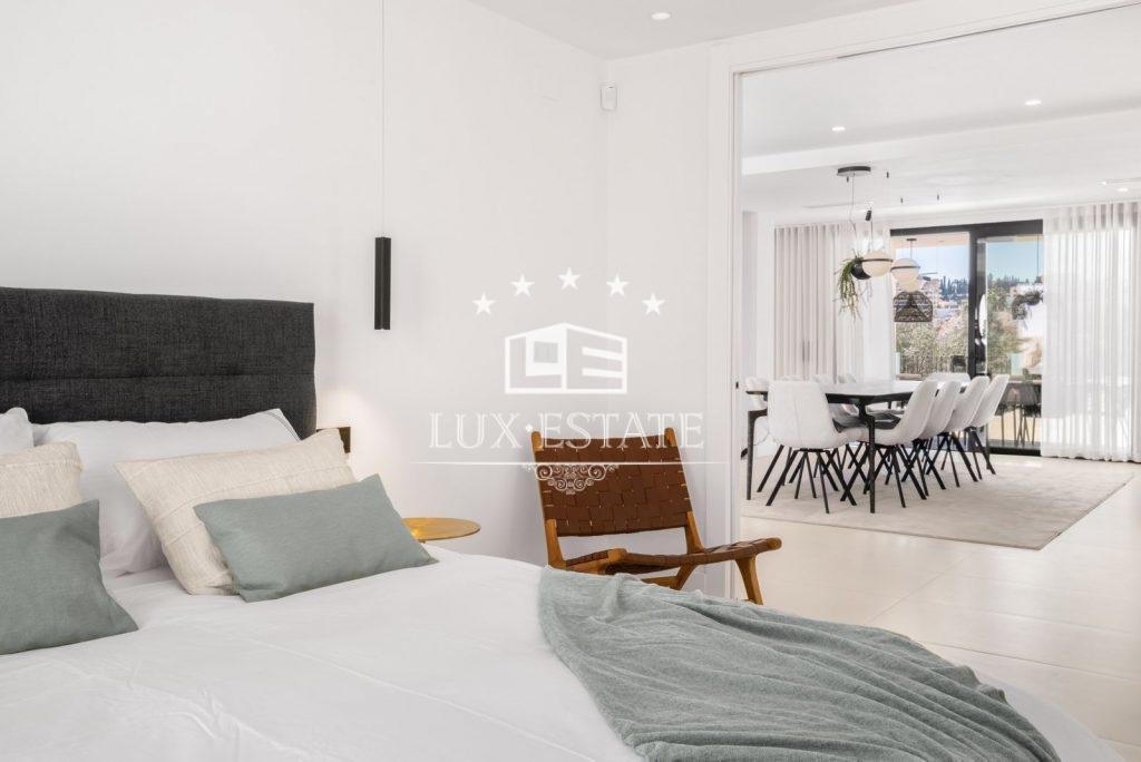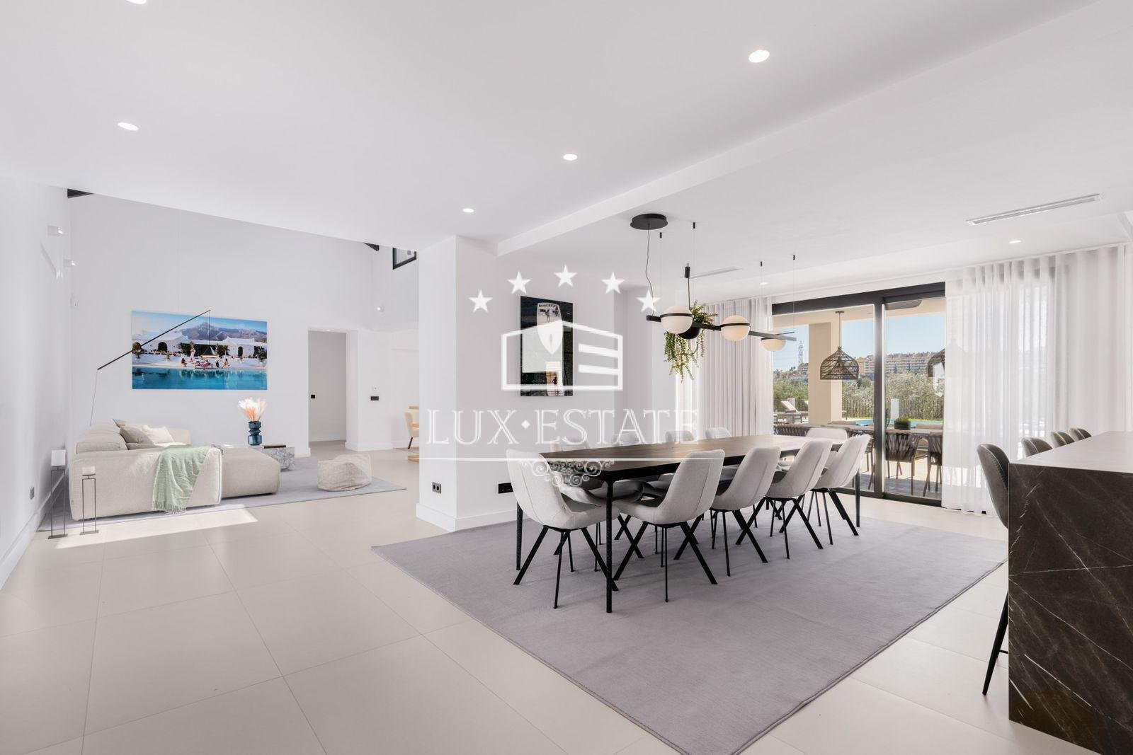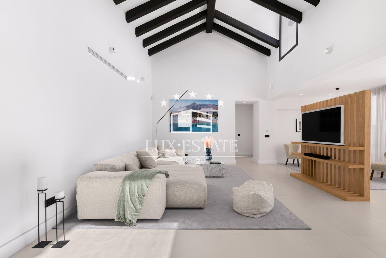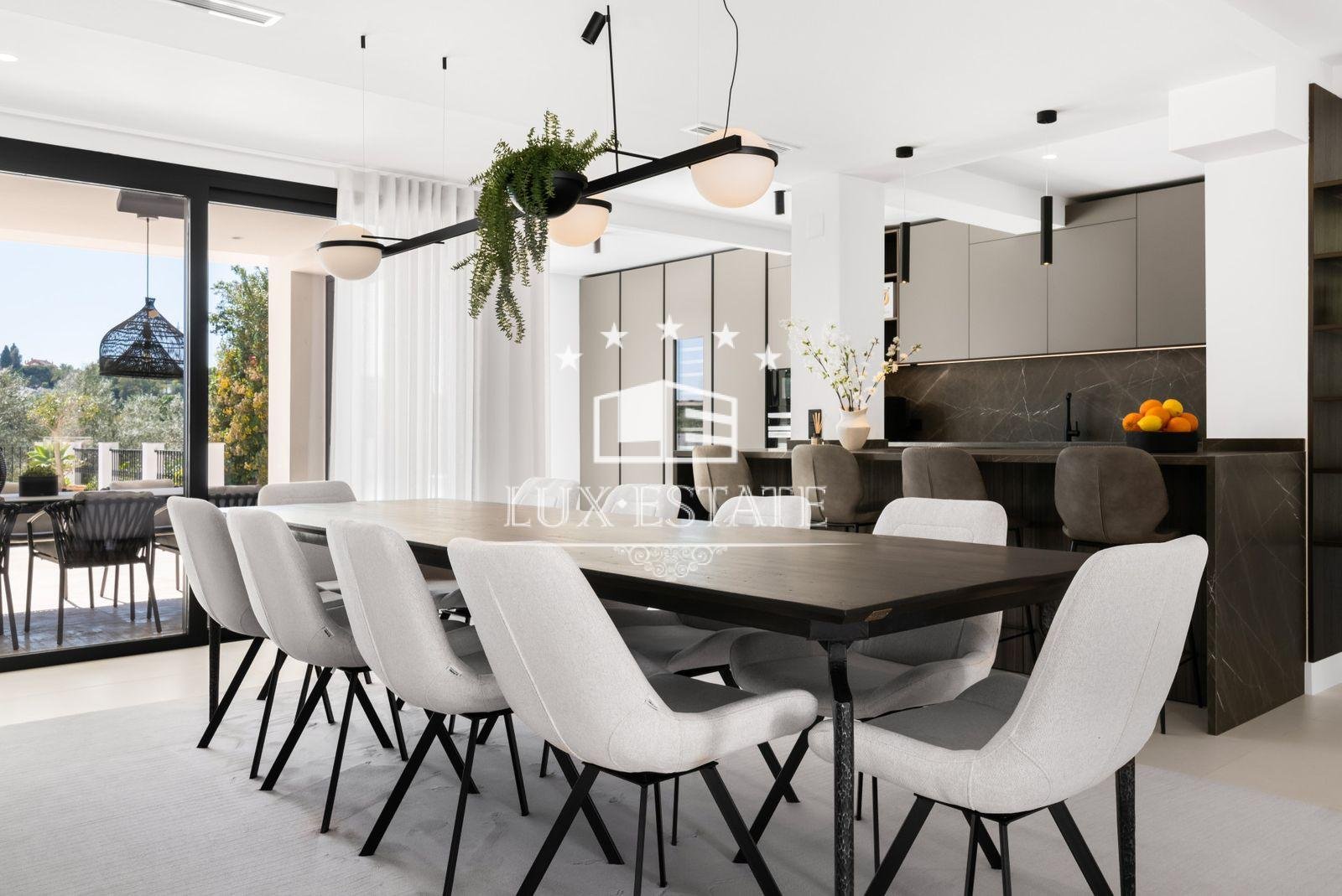 Villa Celine is a superbly refurbished residence placed right at the heart of the Golf Valley in Marbella, within the exclusive gated community of Parcelas del Golf. The community offers ultimate protection round the clock, while the villa is additionally equipped with a target alarm system and an intercom, ensuring residents’ comfort in terms of safety anytime. The villa occupies a considerable plot of land facing the west, topping 1,300 m2 and occupying a frontline golf position in Marbella’s most renowned golf course, Las Brisas Golf. Furthermore, Villa Celine is positioned a mere 100m from the Aloha Tennis and Padel Club, as well as being in close proximity to local eateries, stores and markets.