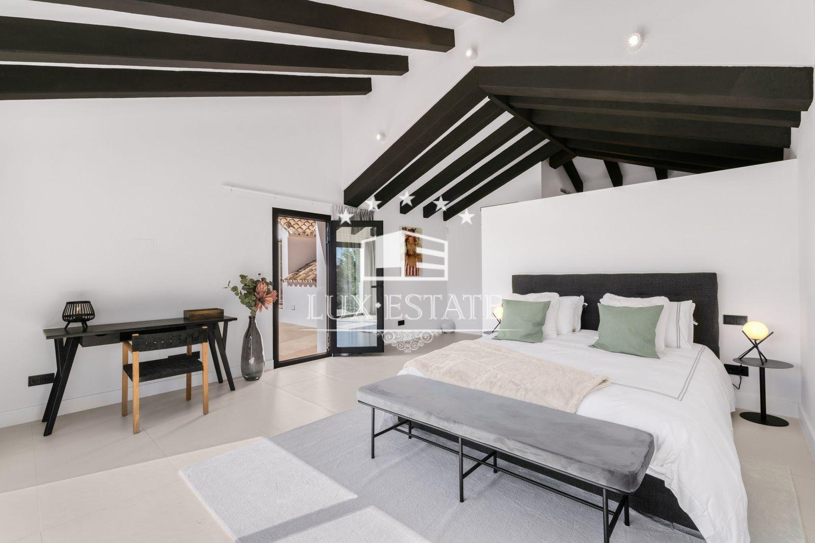 The villa offers a homely design and is completely furnished, with large living spaces and sizable bedrooms. Additionally, the property provides extensive terraces for basking in the sunny weather and taking in splendid views of the Las Brisas golf course greens. Spread over two levels, this splendid villa presents capacious lodgings, a private heated salt water pool featuring an integrated cover, and an exclusive covered car park suitable for 2-3 vehicles. Positioned on the main floor, an unpartitioned living area, defined by lofty ceilings, white painted timber beams, and capacious windows allowing an abundance of natural light to stream into the living spaces, can be found. The ground floor boasts a contemporary fully equipped kitchen complete with Smeg appliances, a large wine cooler, and an ice machine. Additionally, there are four en-suite bedrooms that offer delightful views and convenient access to the outdoor spaces via the huge floor-to-ceiling windows. On the upper floor, you will find an expansive master bedroom that offers generous proportions and stunning panoramic views of the Golf Valley. Underfloor heating has been installed throughout the house, and each room has individual zones for A/C, which can be personalised to each person’s liking, ensuring the utmost comfort.