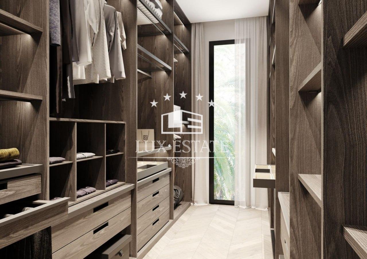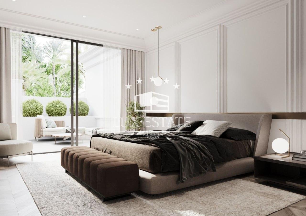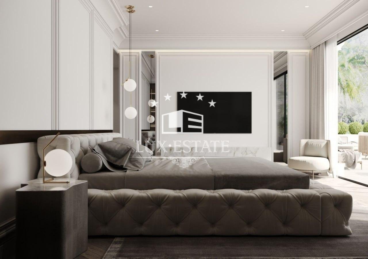 The upper floor comprises three bedrooms with en suite bathrooms and dressing areas. The expansive master bedroom, with direct access to the large terrace, offers unmatched views of the pool and the sea.