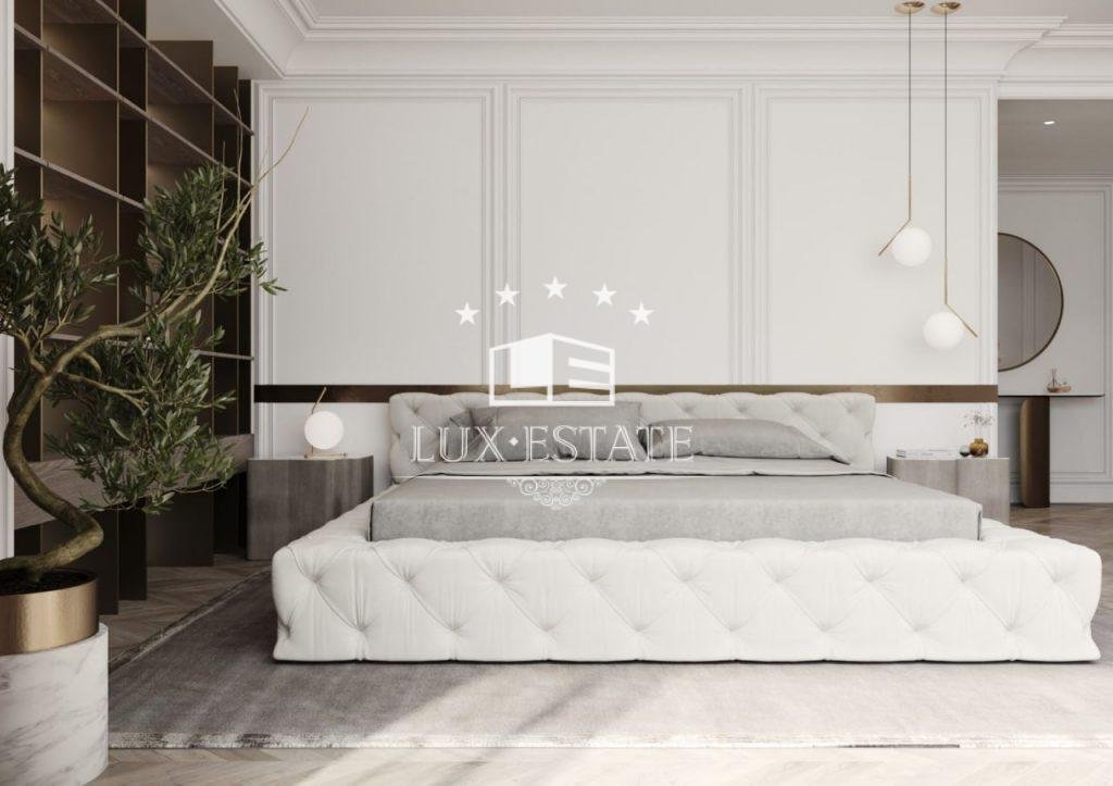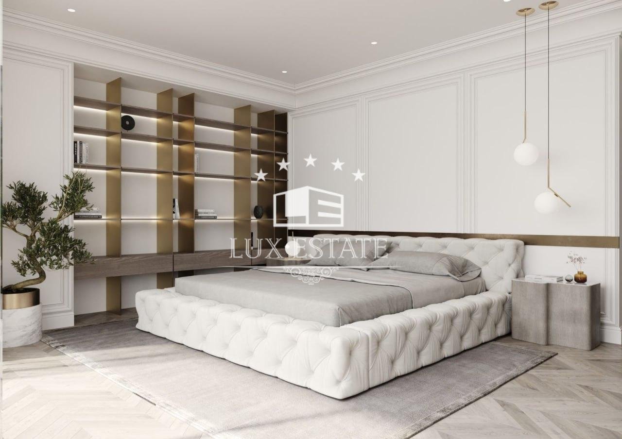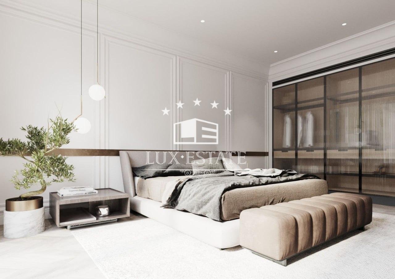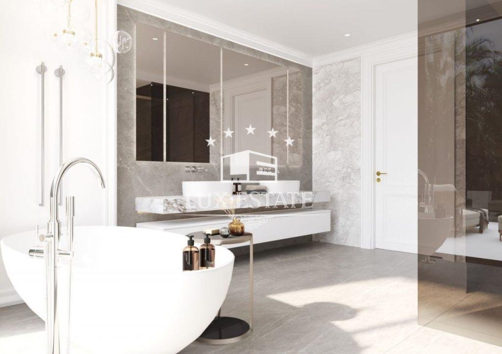 The upper floor comprises three bedrooms with en suite bathrooms and dressing areas. The expansive master bedroom, with direct access to the large terrace, offers unmatched views of the pool and the sea.
