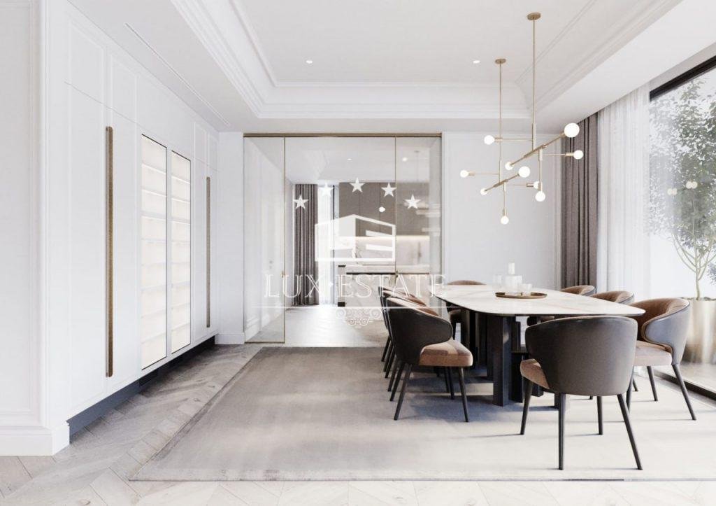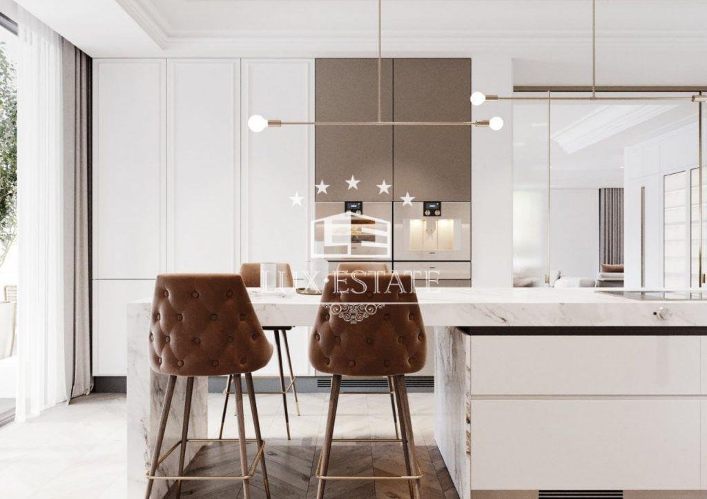 Among them, there is a large fireplace, a dining area, and a living area. The fully equipped kitchen, complete with state-of-the-art appliances, has a custom island. The whole level has access to terraces, gardens,