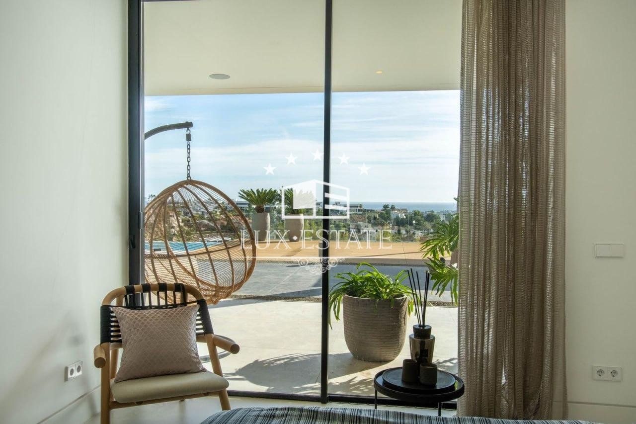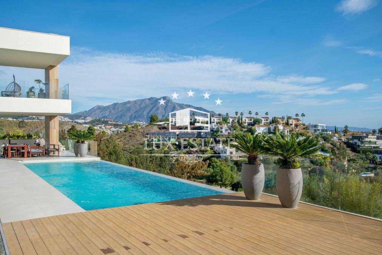 Stunning contemporary villa with panoramic mountain, golf, and ocean views in La Alqueria, Benahavis.
