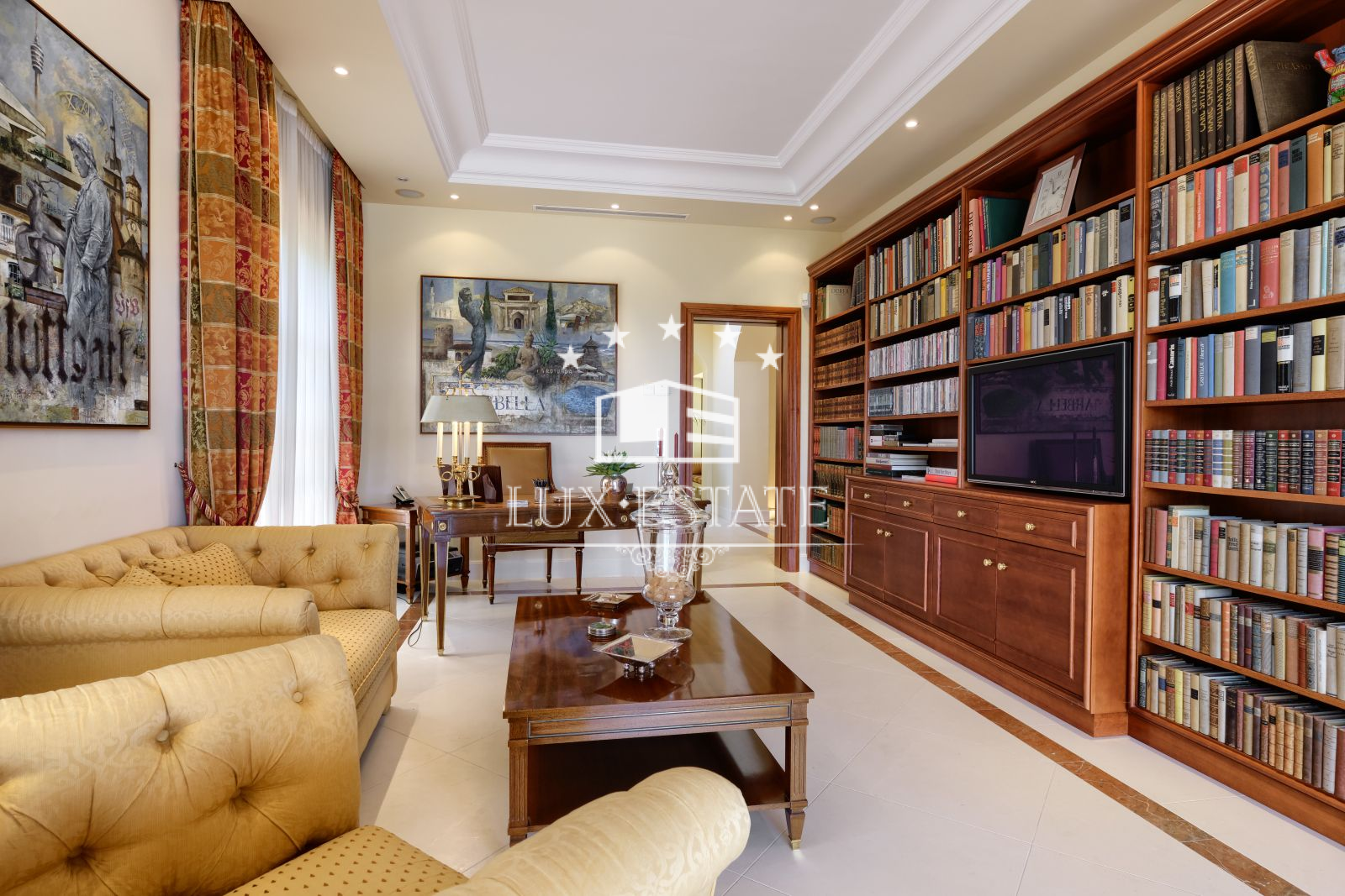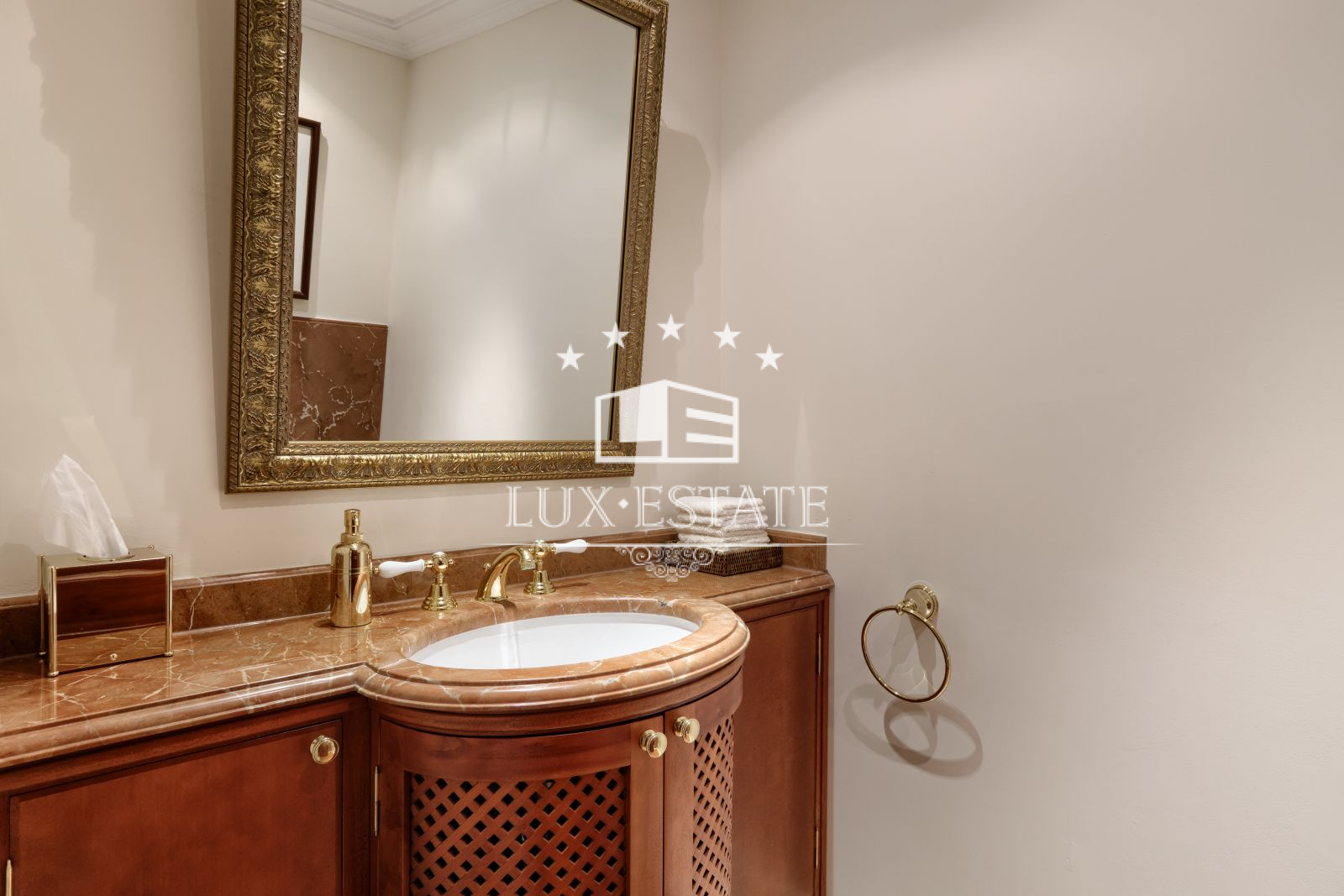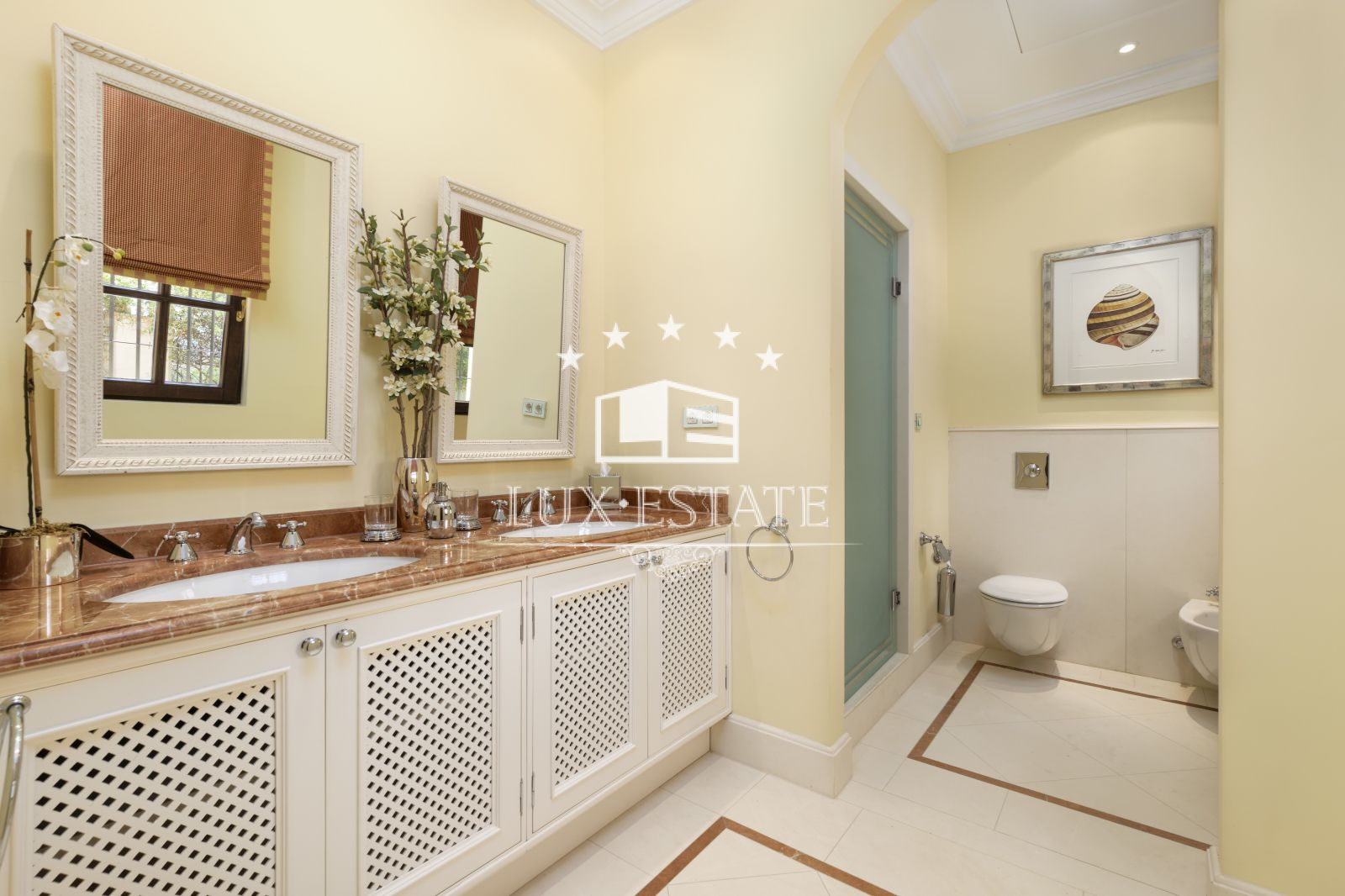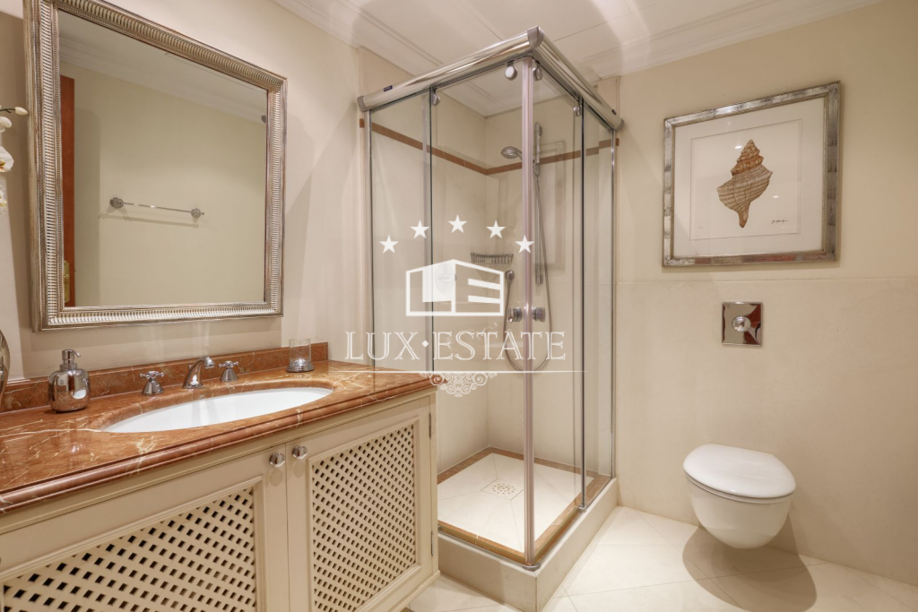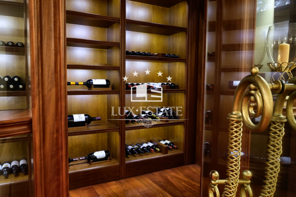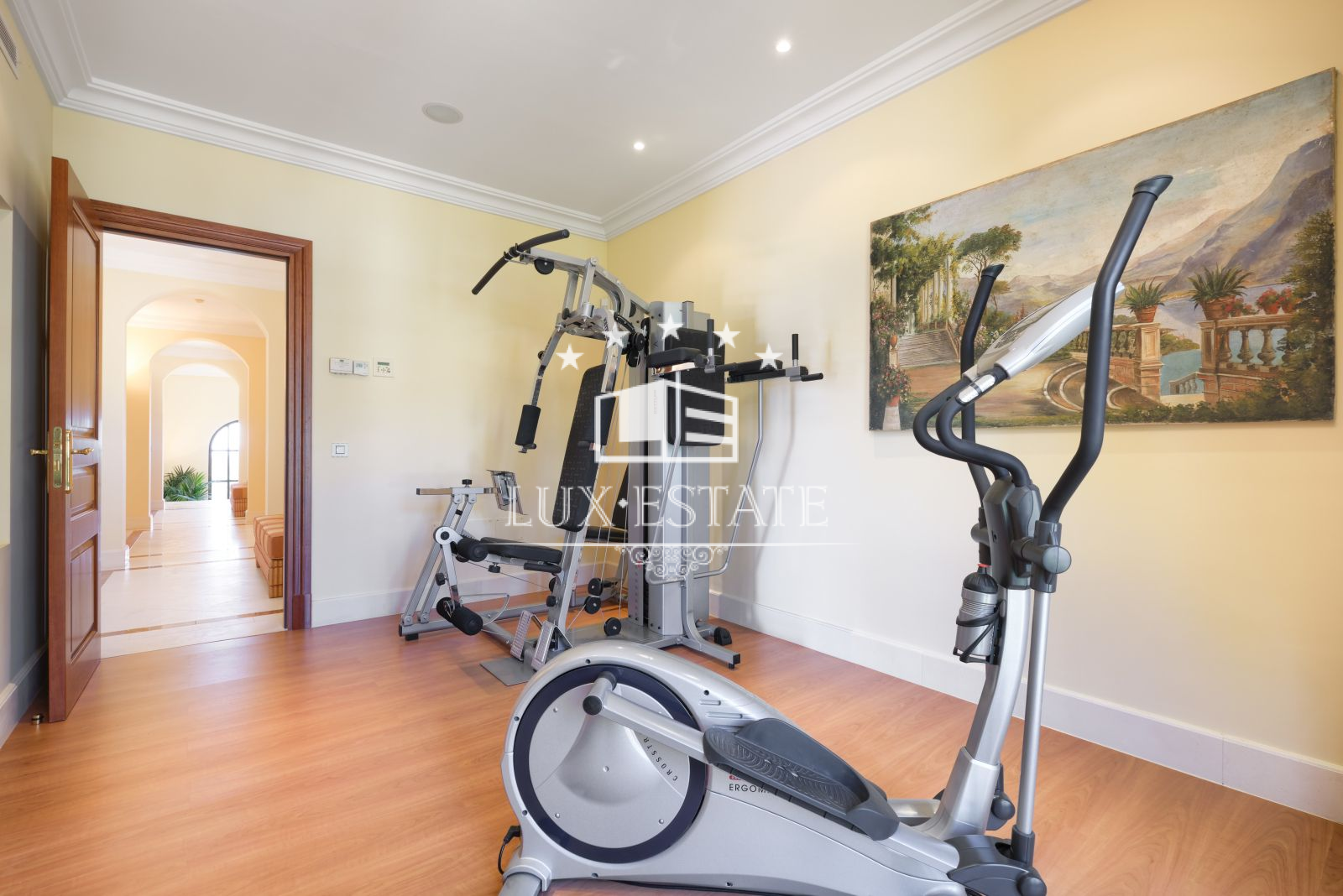 Two guest bedrooms have en suite bathrooms and their own terraces. On the first floor, there is a master bedroom with an en suite bathroom, separate dressing area, sauna, and fitness room. There is also another guest bedroom with an en suite bathroom.