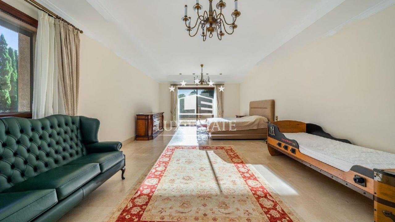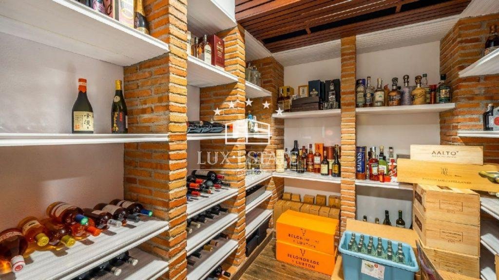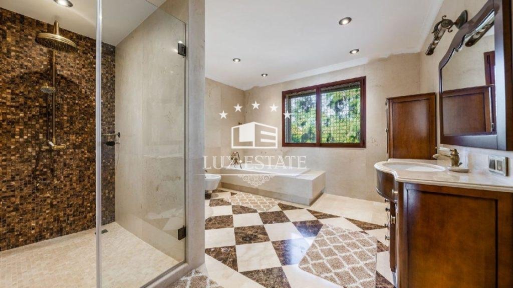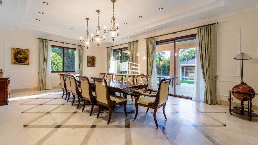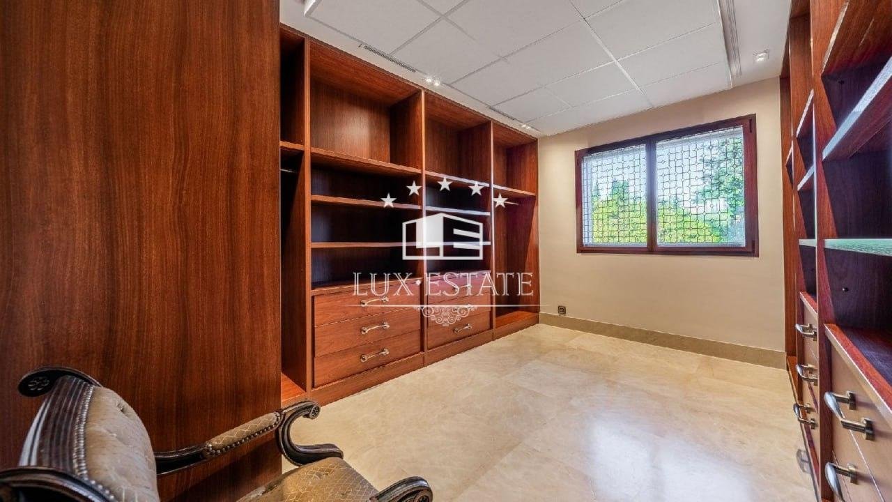 Set on a 1.469 square meter plot, the south/west-facing mansion spans 1,018 square meters and boasts three levels serviced by a lift. A grand entrance hall features a double-height ceiling and leads to a spacious office adorned with intricate ceiling details. The property includes a living room, a TV lounge complete with fireplace, and a separate dining room with access to a covered terrace as well as the swimming pool area which comes with pre-installation for heating. Additionally, there is another covered terrace fitted with a fully equipped outdoor kitchen and sauna. The charming pavilion adds elegance and is ideal for outdoor family dinners, get-togethers, barbecues, refreshments, and cocktails. Returning to the house, you’ll find a guest bathroom and a spacious, beautiful kitchen fully equipped with Miele appliances, including a double fridge and wine fridge. The first level includes two spacious guest bedrooms with en-suite bathrooms and fitted wardrobes, along with a grand Master bedroom that boasts a terrace, two en-suite bathrooms, and separate ‘his’ and ‘hers’ fitted wardrobes. Moving up to the second level, you’ll find two guest bedroom suites with their own bathrooms, a games room, and a private terrace. The basement is home to a staff apartment, guest restroom, two storage areas, a wine cellar, laundry room, gym, technical and machine spaces, and a separate entrance, as well as a garage that accommodates up to six cars. There is a carport for four cars at this high-end house, surrounded by beautiful nature and luxury properties in Guadalmina.